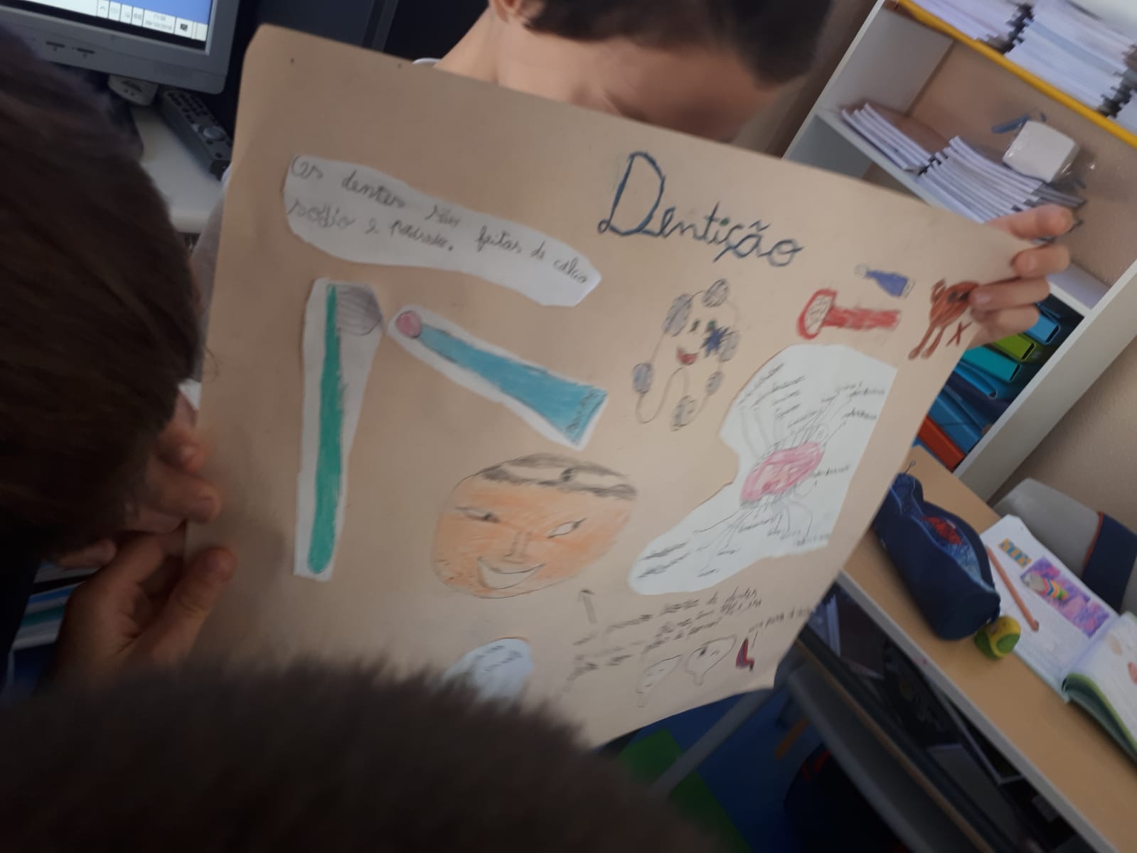 Trabalho de Projeto. Os alunos partiram do que já sabiam, para o que queriam saber e foram pesquisar. Descobriram: a dentição de leite e a definitiva; o esmalte, as cáries, a coroa, as bactérias(…) e até quem inventou a primeira escova de dentes. Por fim, construíram um cartaz e fizeram a apresentação à turma.