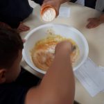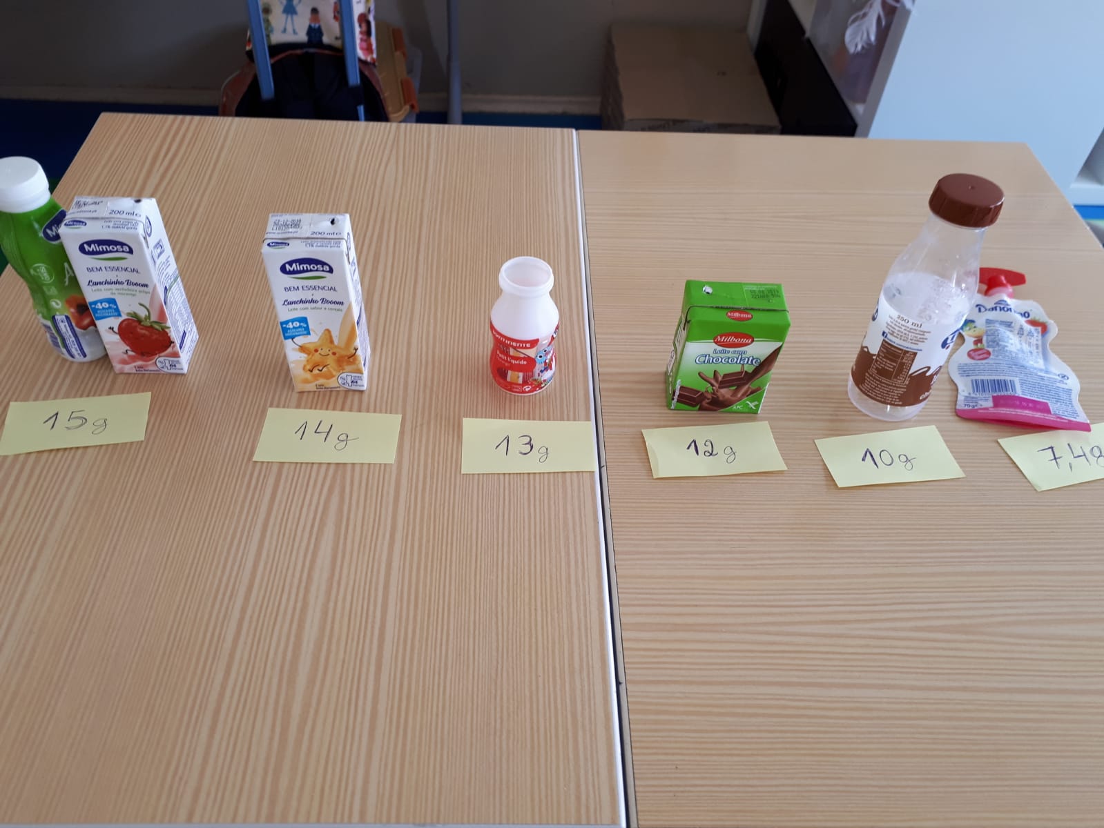 Matemática – Construção e interpretação de um pictograma “ Qual a fruta preferida de alguns idosos do Lar”. Contagem/ pesagem de açúcar de alguns alimentos que os alunos comem ao lanche. E breve noção de metade, terça parte, quarta parte.