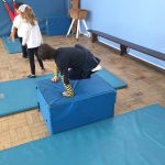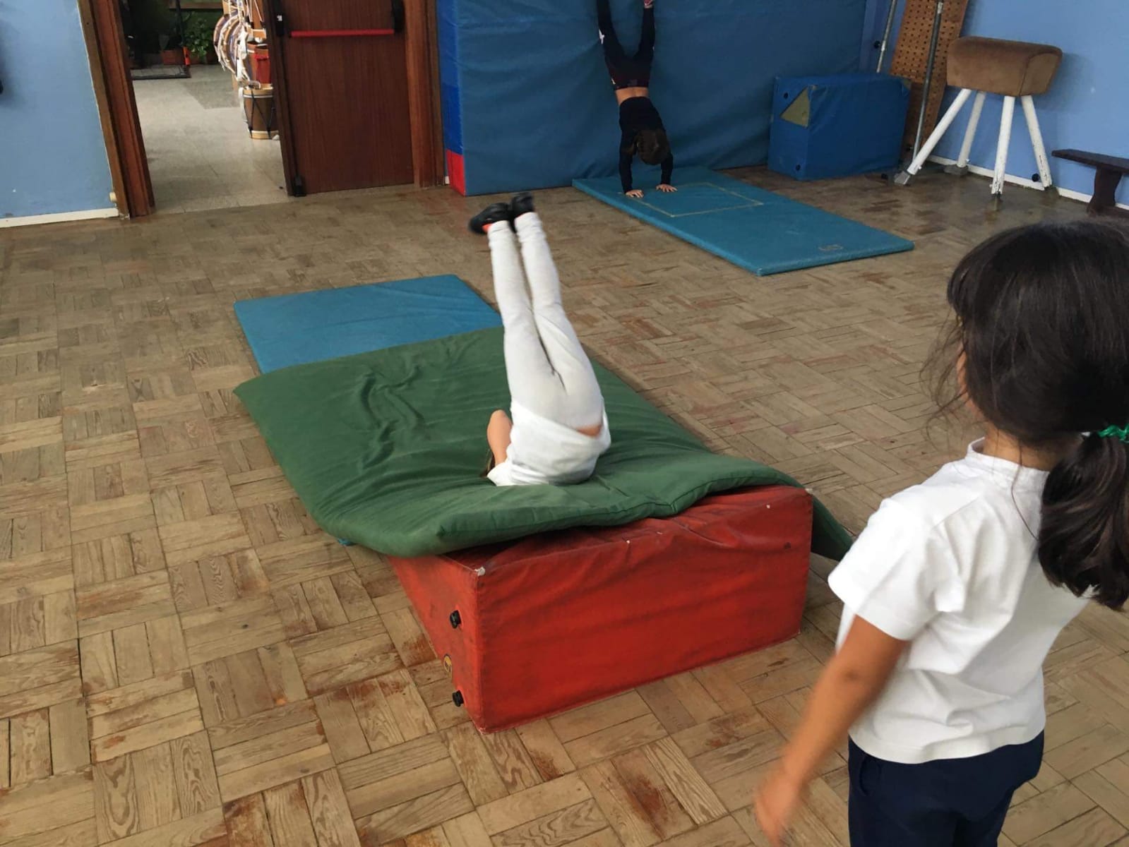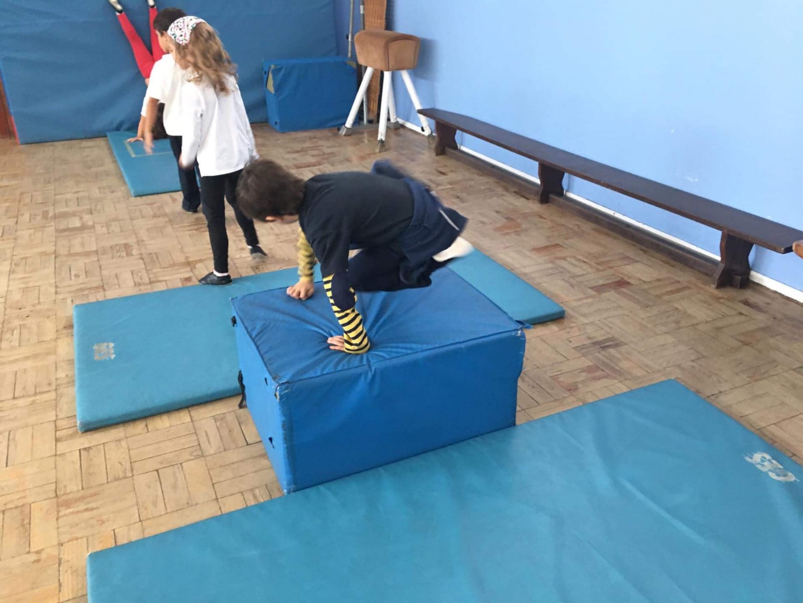 Educação Física: Os alunos foram divididos em “equipas” às quais foram dados nomes de países com a letra “e” como Estónia, Equador e Espanha. Depois fizeram um circuito onde fizeram, “enrolamentos”, situações de “equilíbrio” e o “elevador”.