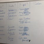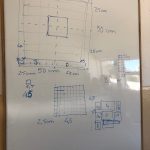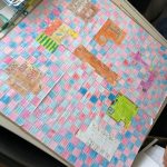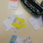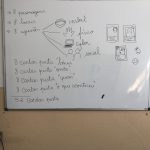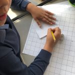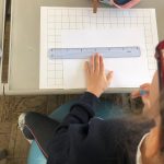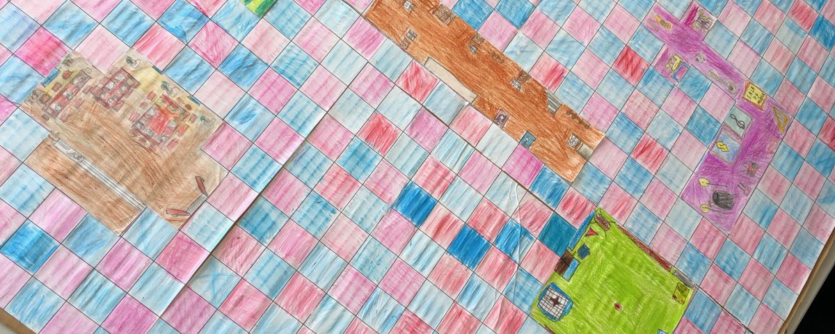 Passámos para planear o nosso tabuleiro, peões e cartas de jogo. Criámos uma escola vista em planta: determinámos a área de jogo e que parte seria ocupada por cada um dos locais. Depois, mantendo a mesma área mas alterando os perímetros, criámos as diferentes zonas. Definimos a unidade de medida para o tabuleiro, que serviu para o pavimentar, recorrendo a padrões geometricos.