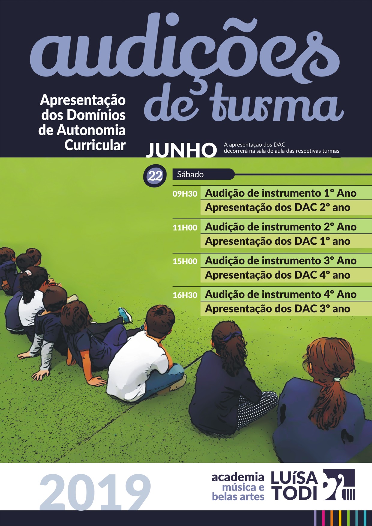 No âmbito da Autonomia e Flexibilidade Curricular as turmas do 1.º Ciclo farão audições por turma no dia 22 de junho. Pretendemos promover momentos de partilhas musicais dando oportunidade para que os alunos assistam a outros instrumentos.