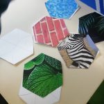 Educação Visual – Construção de painel tipo mosaico com texturas artificiais, naturais e visuais, com a construção de polígonos à escolha (triângulos ou hexágonos) inseridos em circunferências. Recorte dos polígonos e pesquisa e recolha de imagens (jornais, revistas, folhetos, internet, etc) com texturas diversas que se enquadrem nas artificiais, naturais e visuais. Montagem das imagens das texturas de forma a parecer um mosaico colado numa base de cartolina.