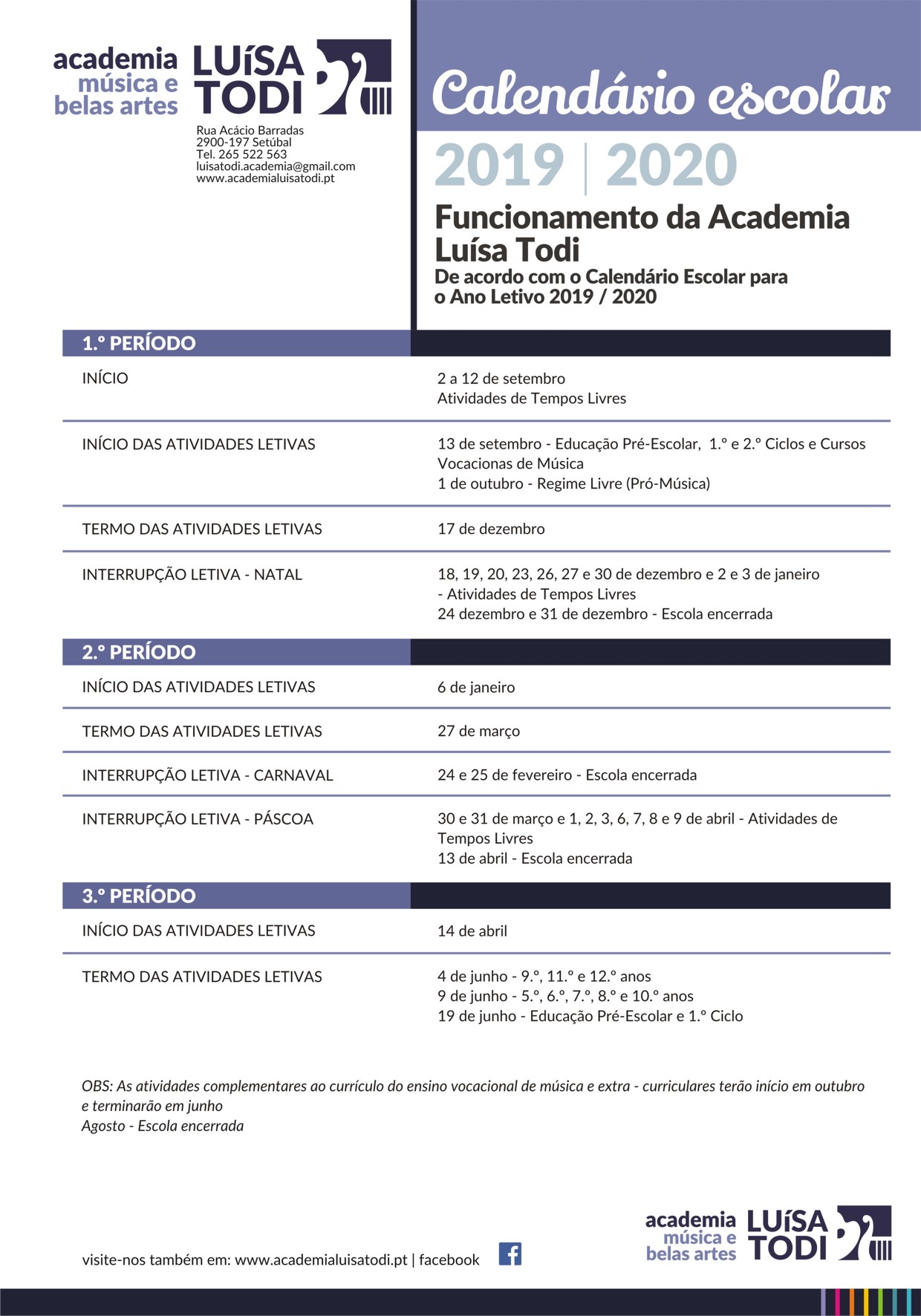Consulte aqui o calendário do próximo ano letivo e verifique todos os períodos de férias. Na pagina do ano letivo 19/20 poderá conhecer o nosso projeto para este ano e as novidades que vamos implementar. Nesta pagina estão também disponíveis para consulta todos os manuais, material escolar assim como o vestuário da escola.