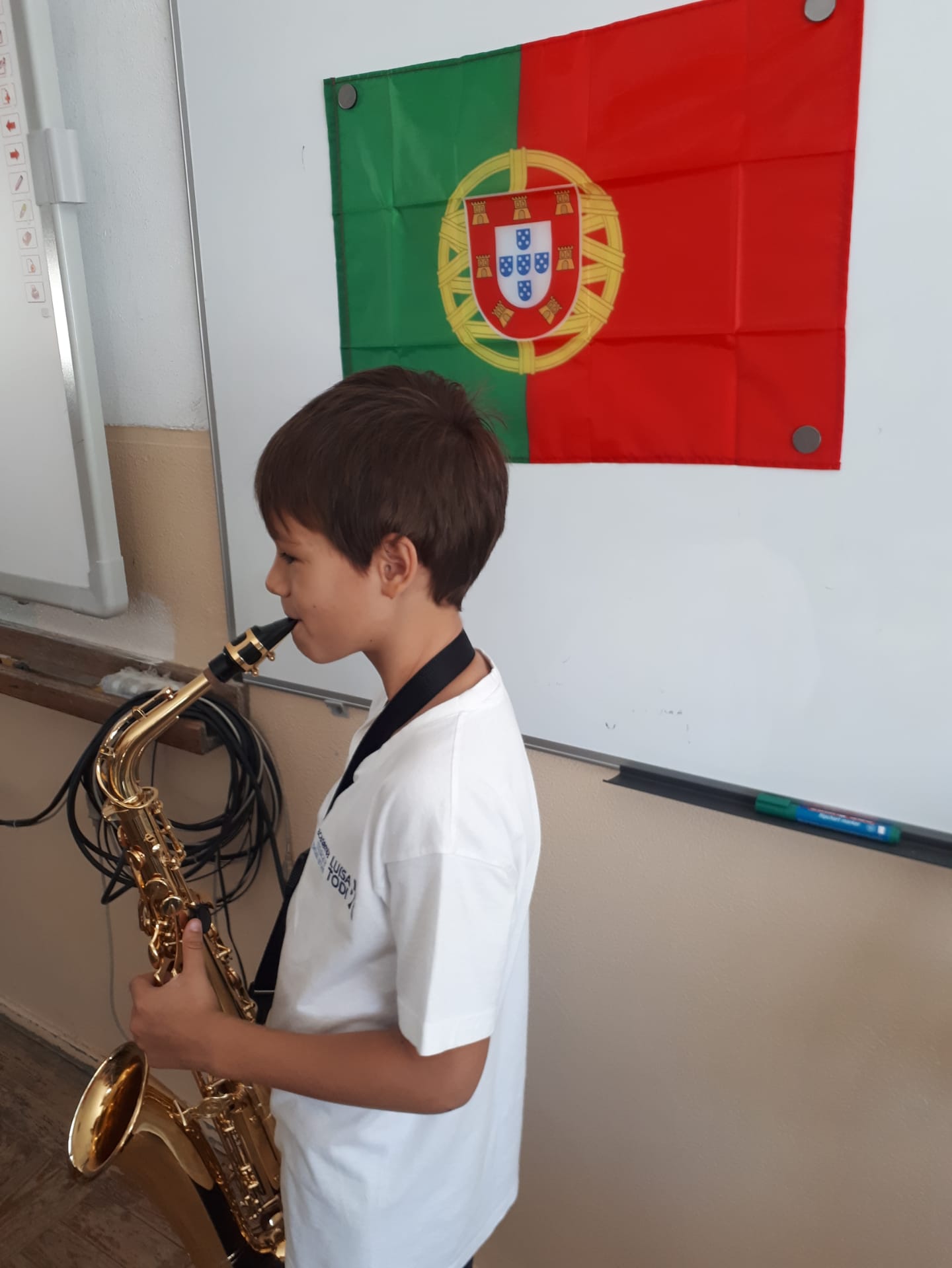 Instrumentos – Ao acordeão, o professor Óscar presenteou – nos com músicas de vários países. No saxofone, o professor João Salcedas e o aluno João de Deus tocaram o Hino Nacional. A Professora Joana Gomes e os alunos Ana Carolina e Guilherme apresentaram-nos músicas tradicionais, no violino. As alunas Matilde e Maria do Carmo tocaram uma música americana na flauta transversal, acompanhadas ao piano pela professora Margarida Quítalo. E o professor Nuno Santos, com os alunos João de Brito e Francisco apresentaram-nos duas músicas tradicionais.