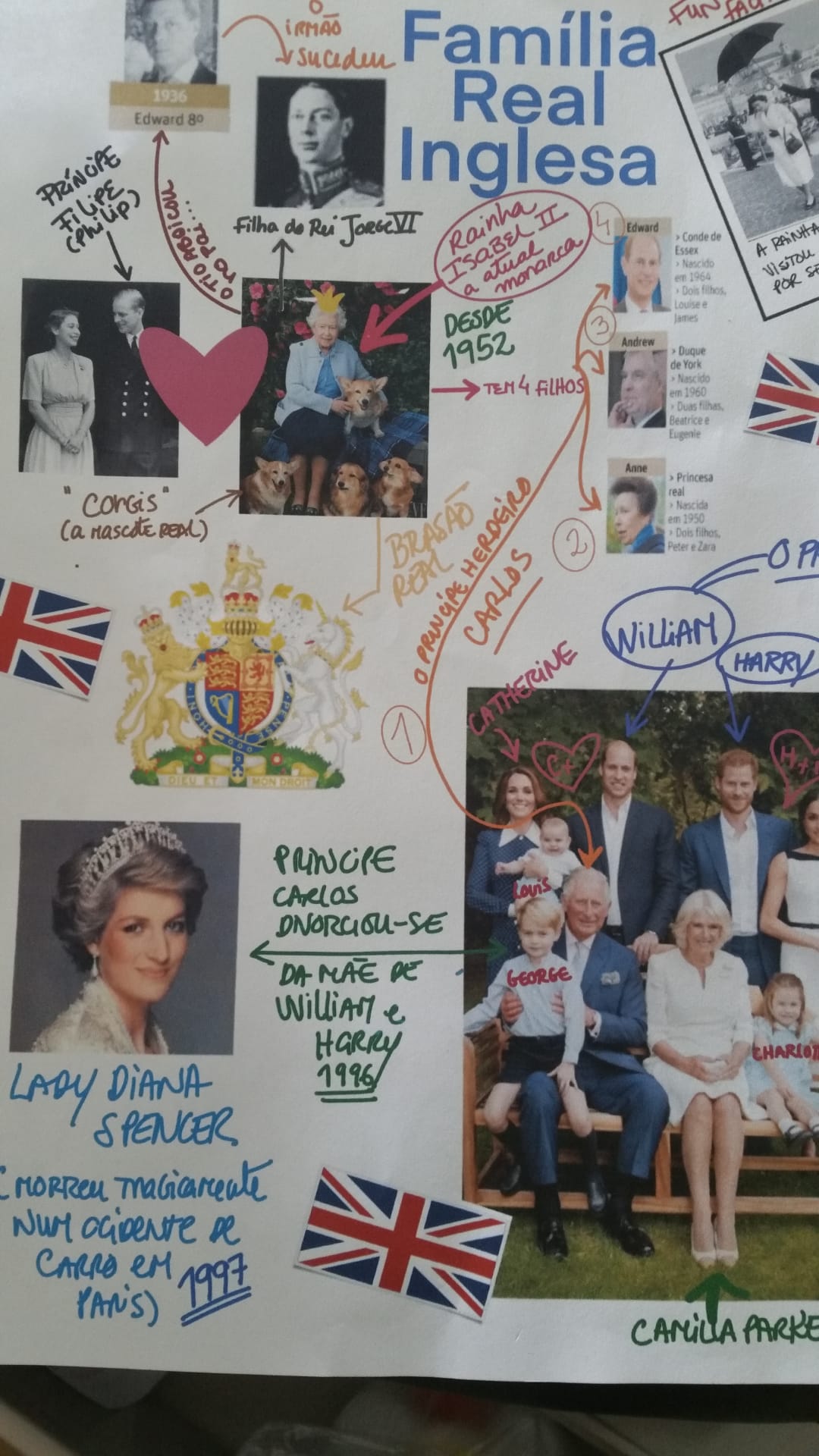 Inglês – Falámos sobre os vários países onde se fala inglês e da importância para as pessoas dos vários países comunicarem. Falámos sobre o Reino Unido em termos de história e localização, sobre a bandeira e a família real.