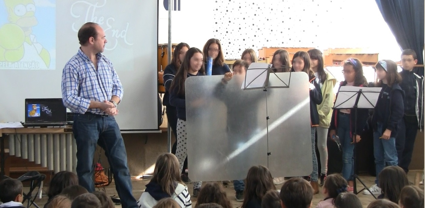 Oficina de Música – Efeitos sonoros. Construção de sons não convencionais com a reprodução de sons da floresta. Apresentação, do trabalho musical realizado, aos alunos do 1º ciclo.