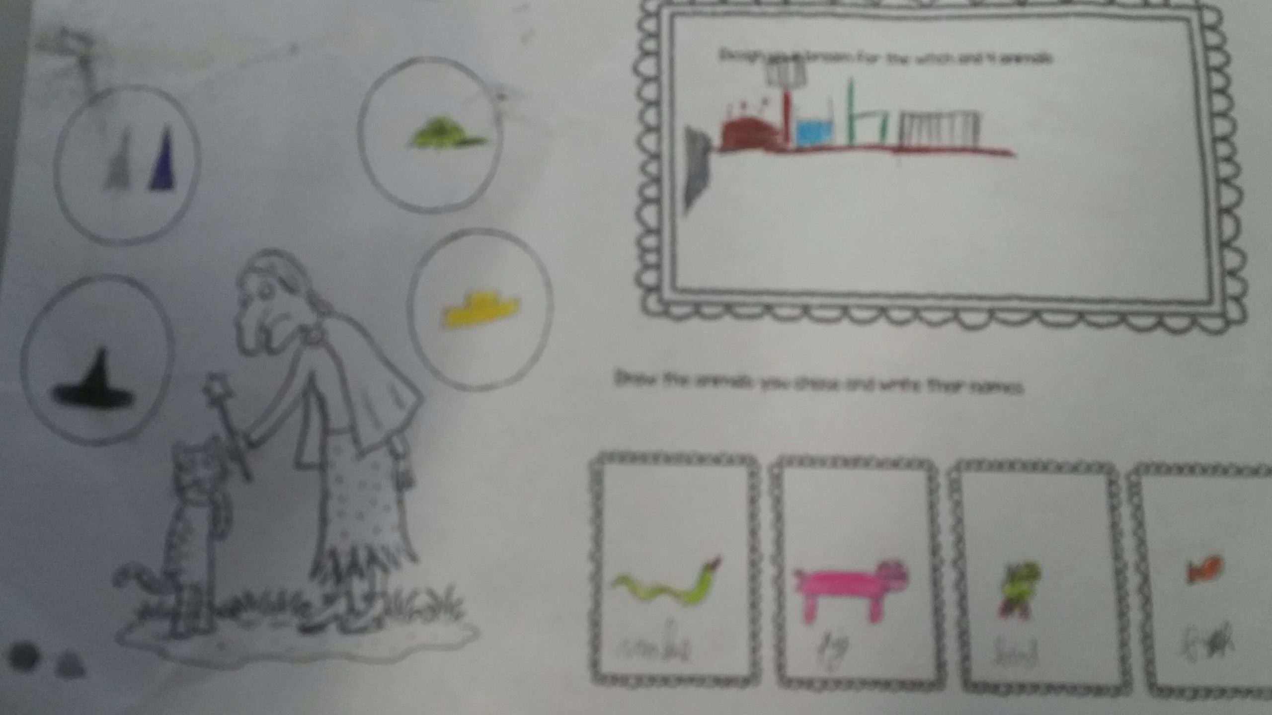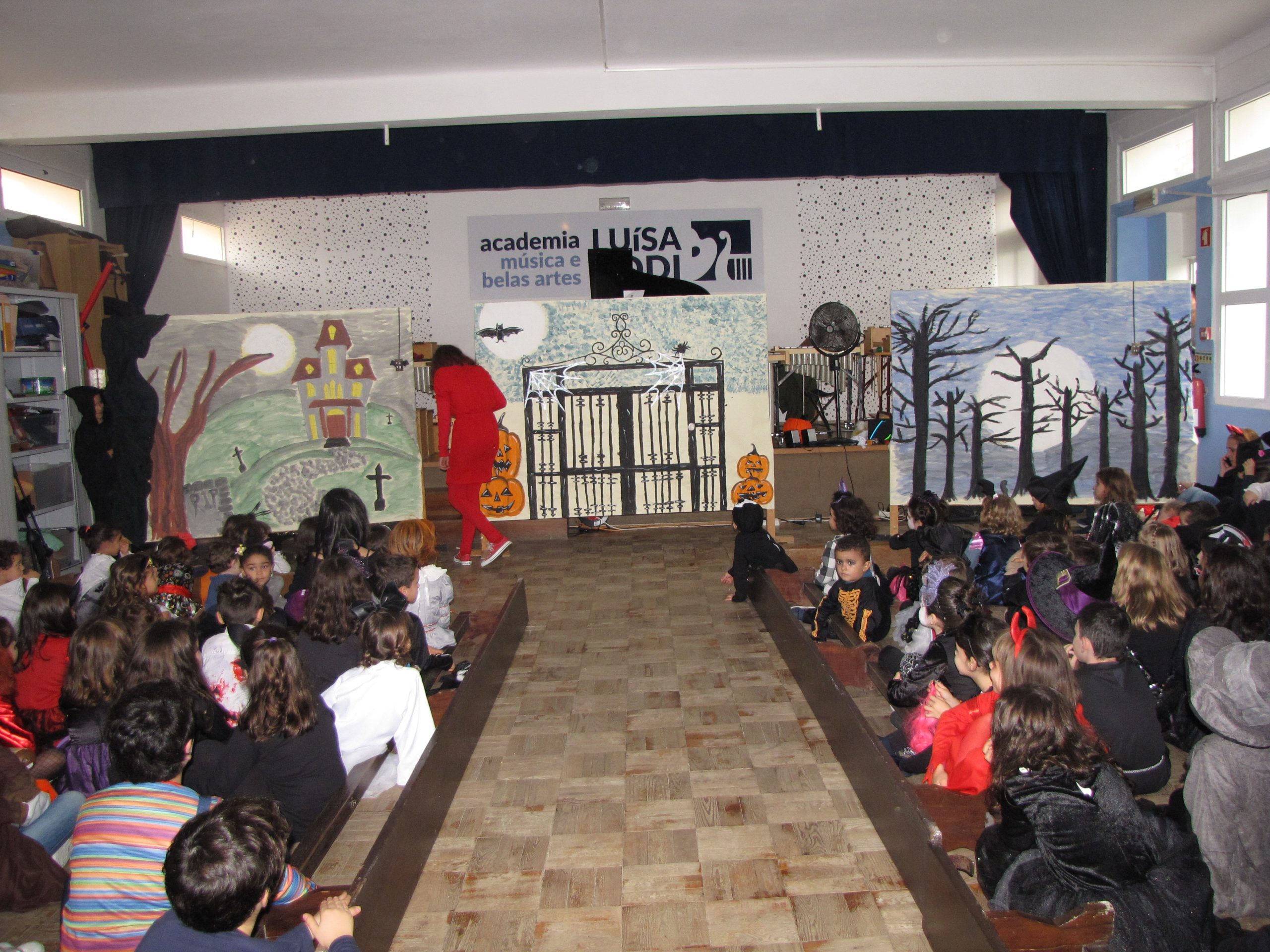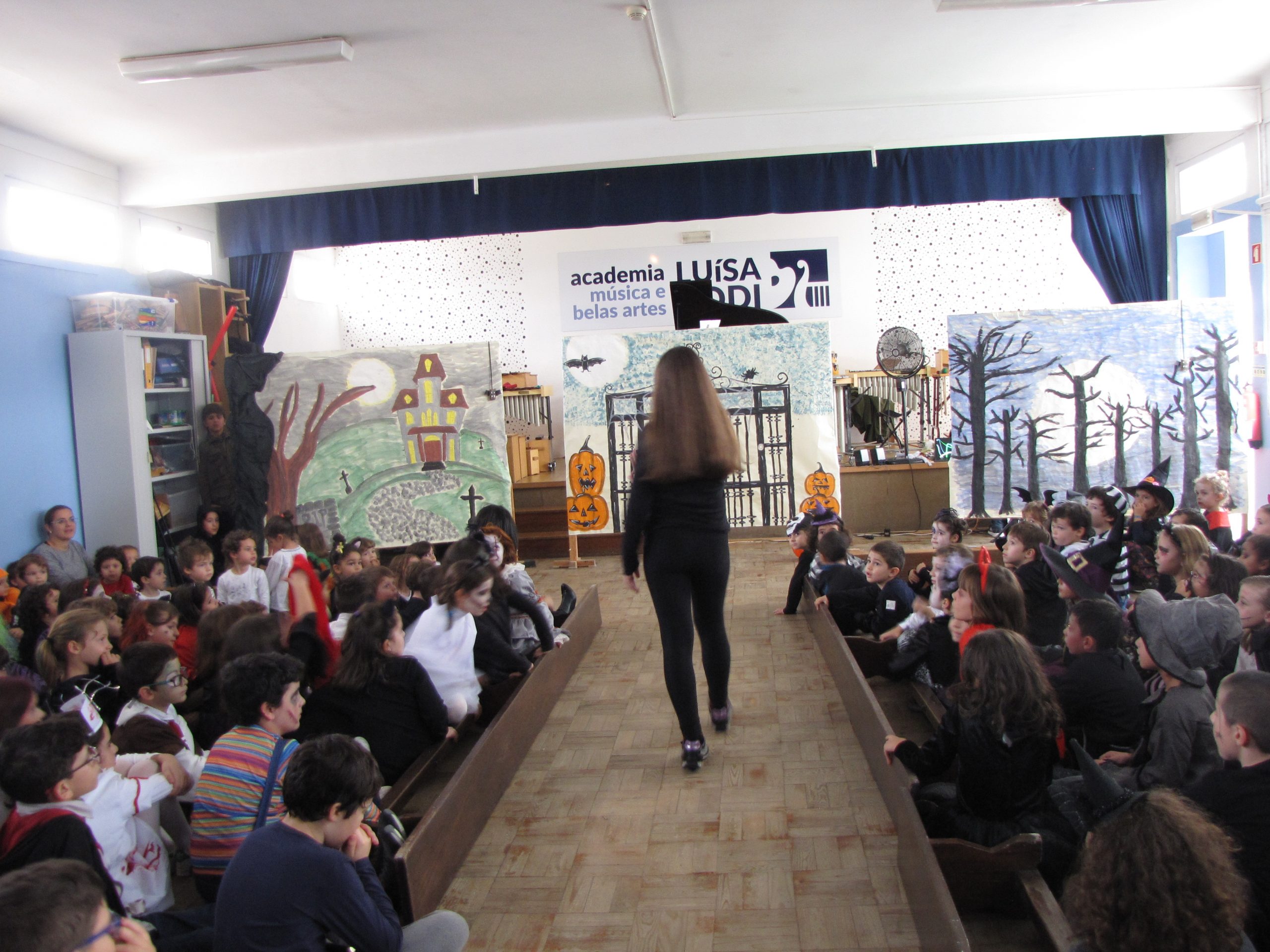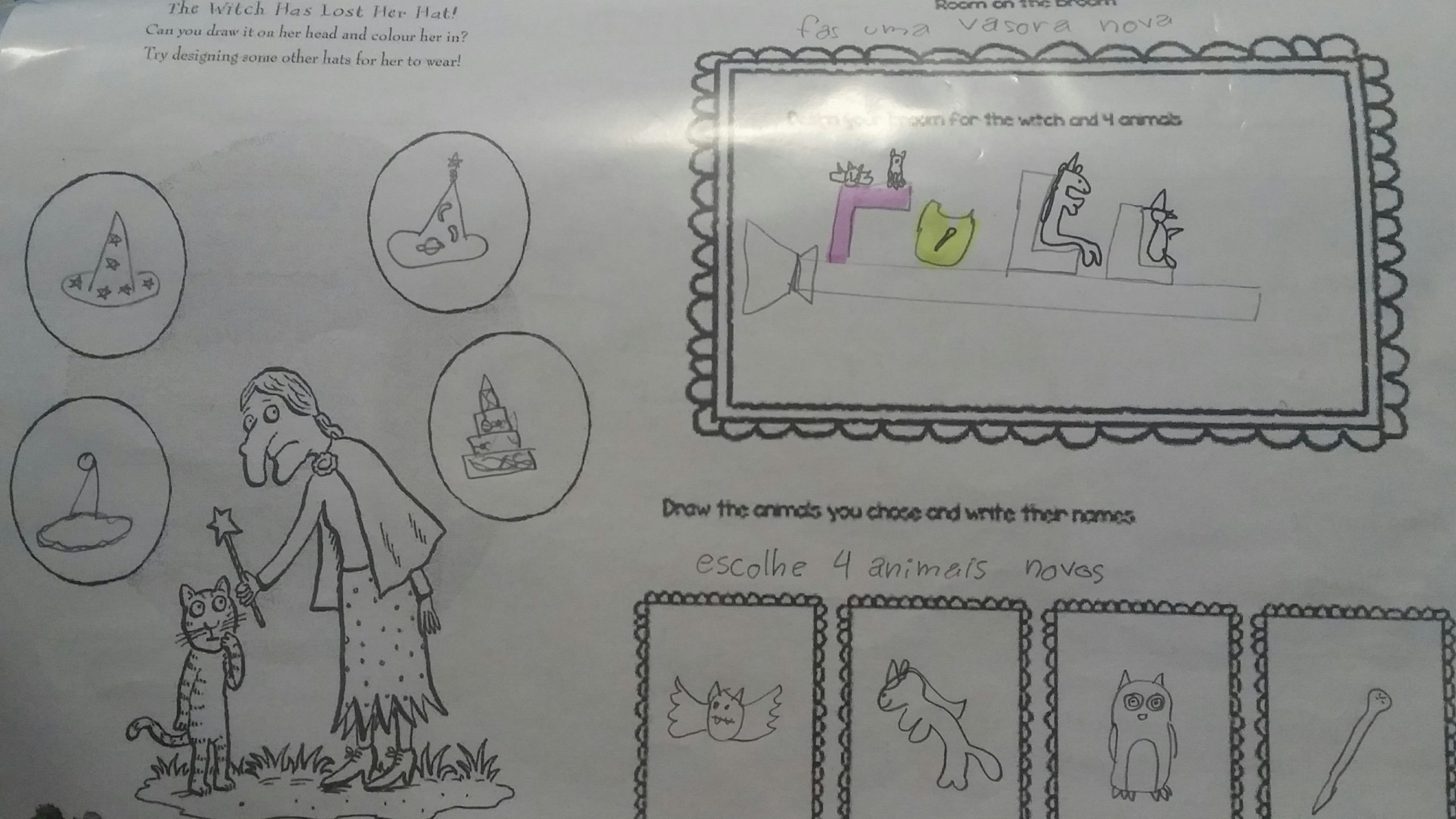Inglês- Halloween – símbolos e tradições: vocabulário, construção de textos, elaboração e ilustração dos mesmos. Exploração da História “Room on the broom”. Exploração e execução vocal de canções de Halloween para o teatro apresentado na festa de Halloween.