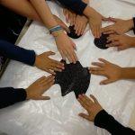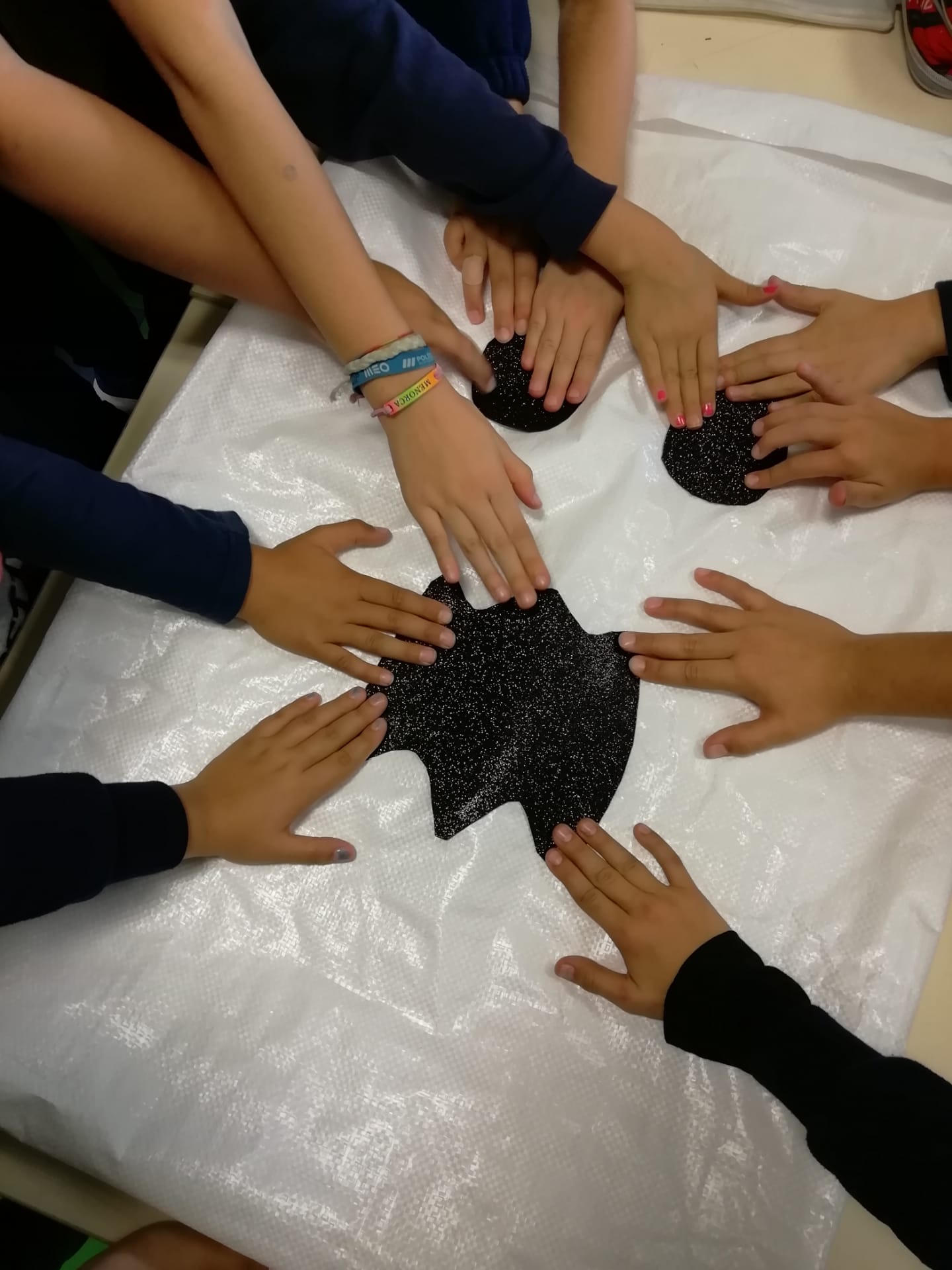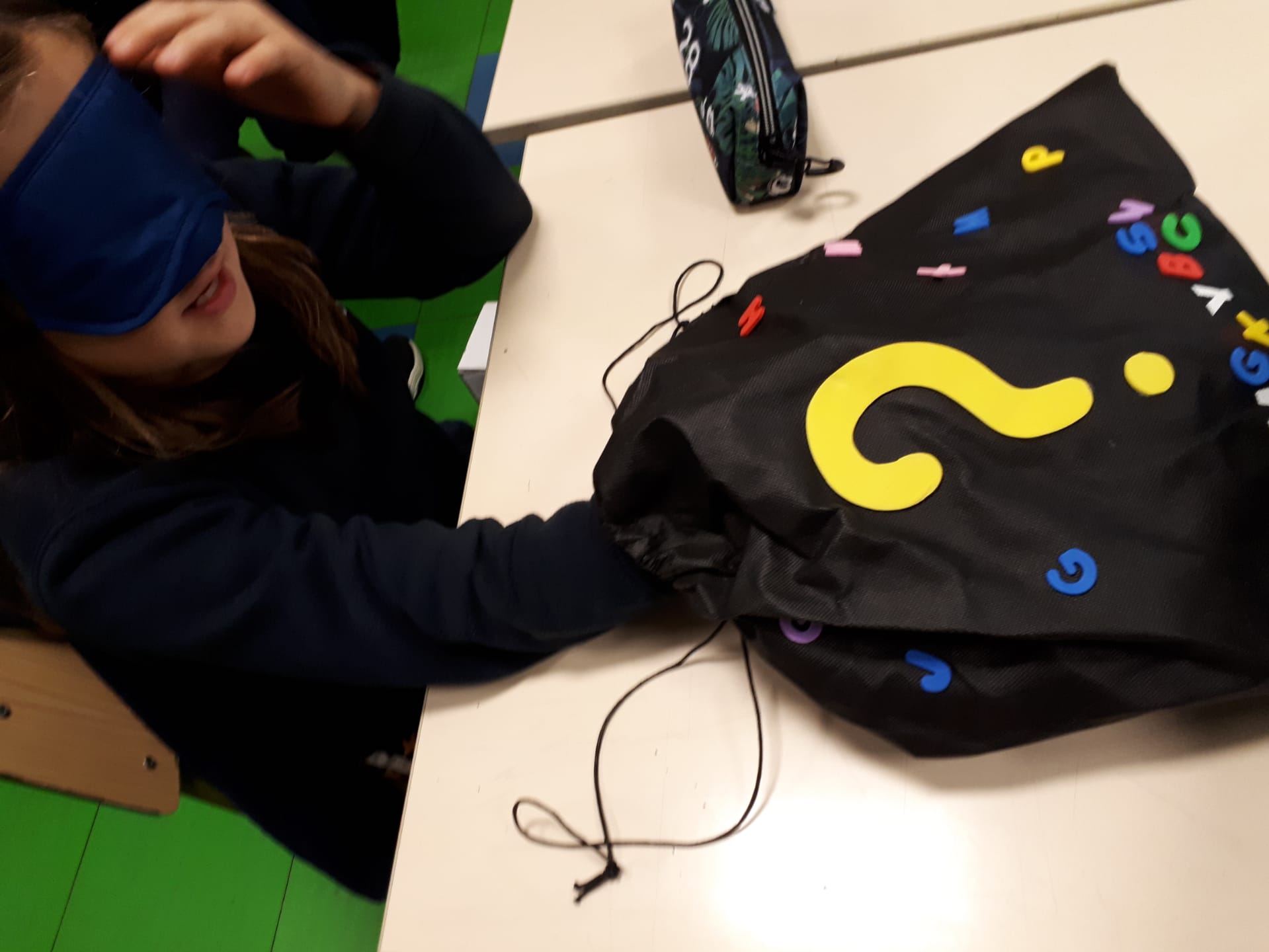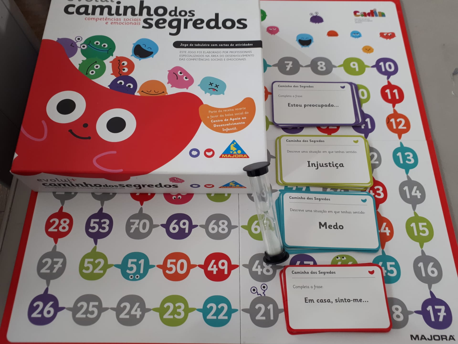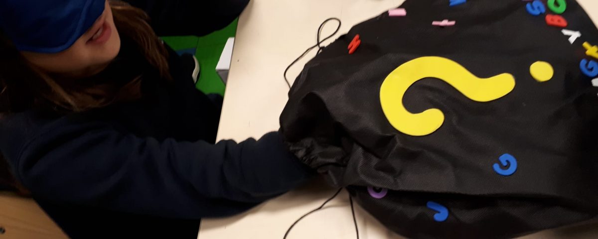 Expressão dramática – Dramatizámos ações expressando um sentimento. De olhos vendados tateámos um objeto e expressámos os nossos sentimentos e/ou reações. E jogámos o “Caminho dos segredos”, jogo para desenvolver competências sociais e emocionais.