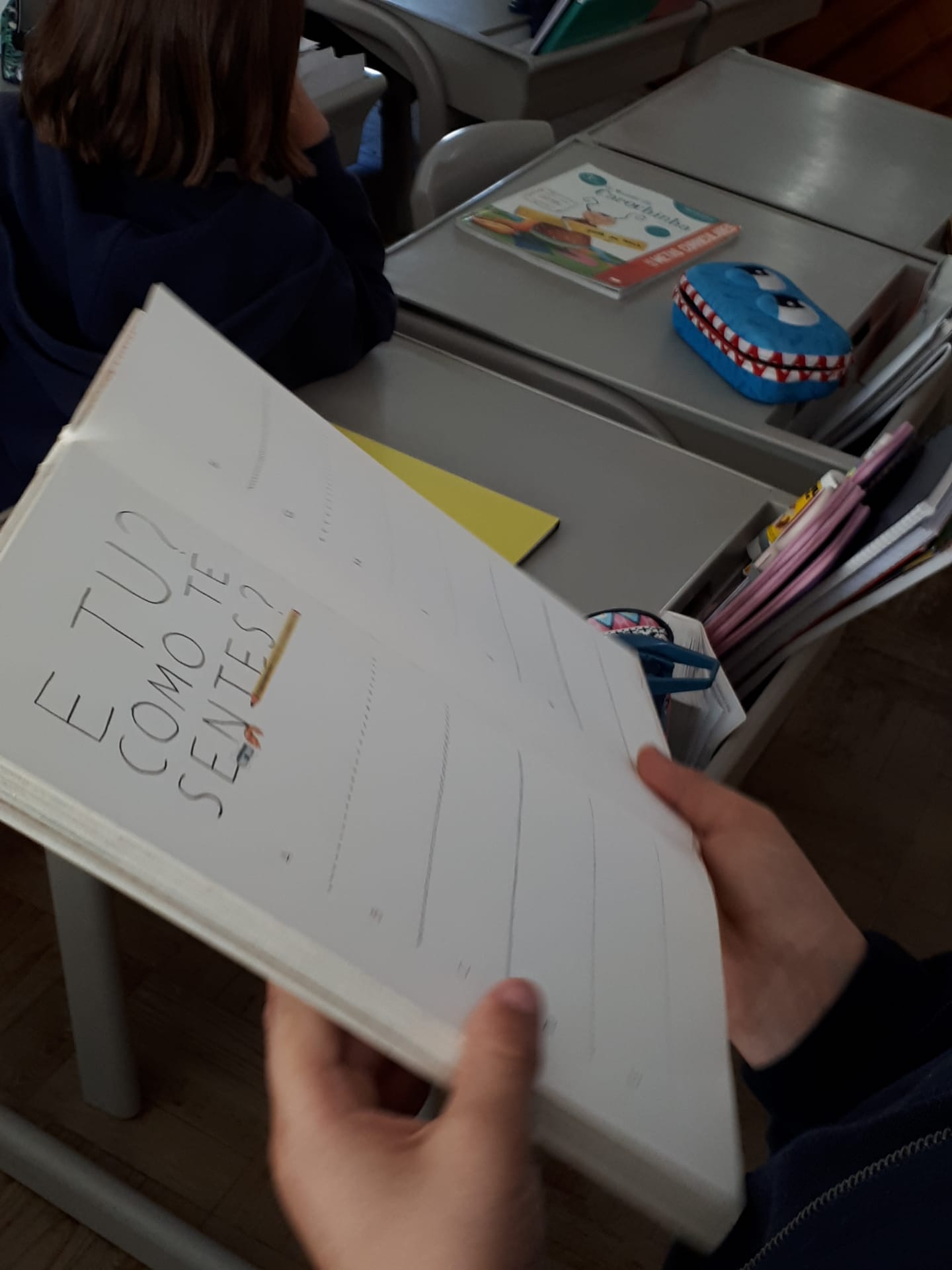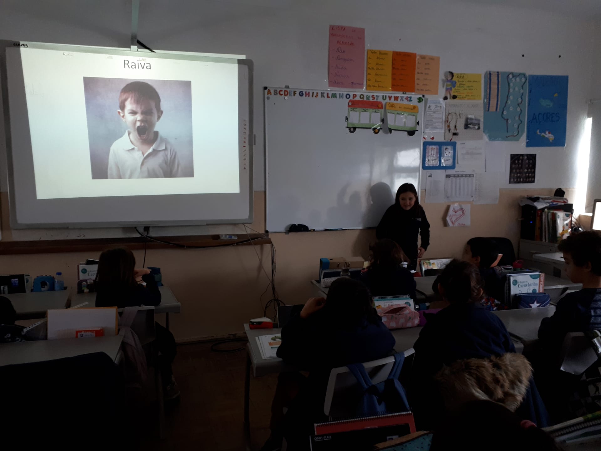 Leitura e interpretação oral e escrita do poema “Felicidade”. Revisão dos adjetivos. O nosso colega Tomé Barão trouxe de casa o livro “Hoje sinto-me…”, para nos mostrar e falar de sentimentos.