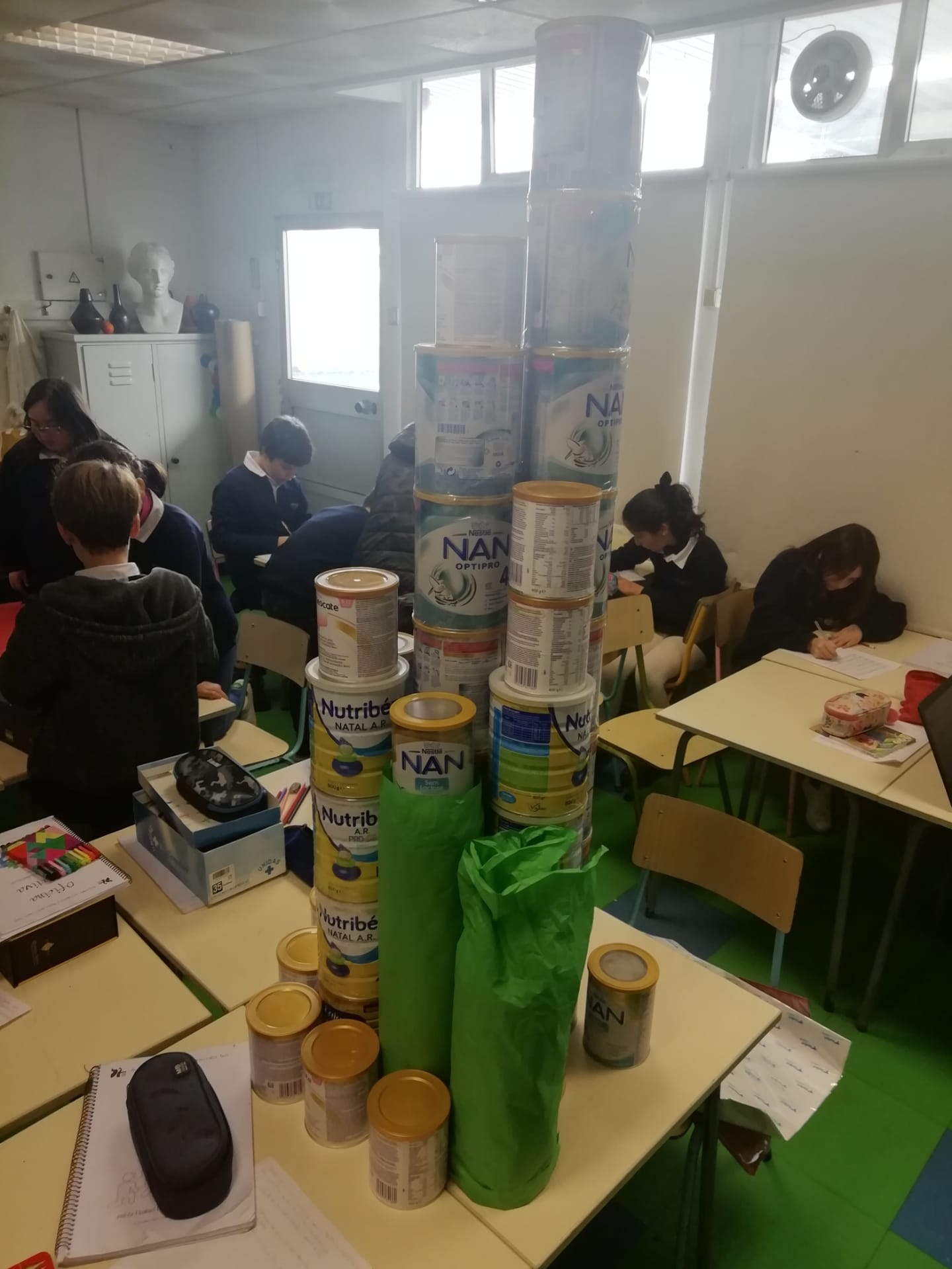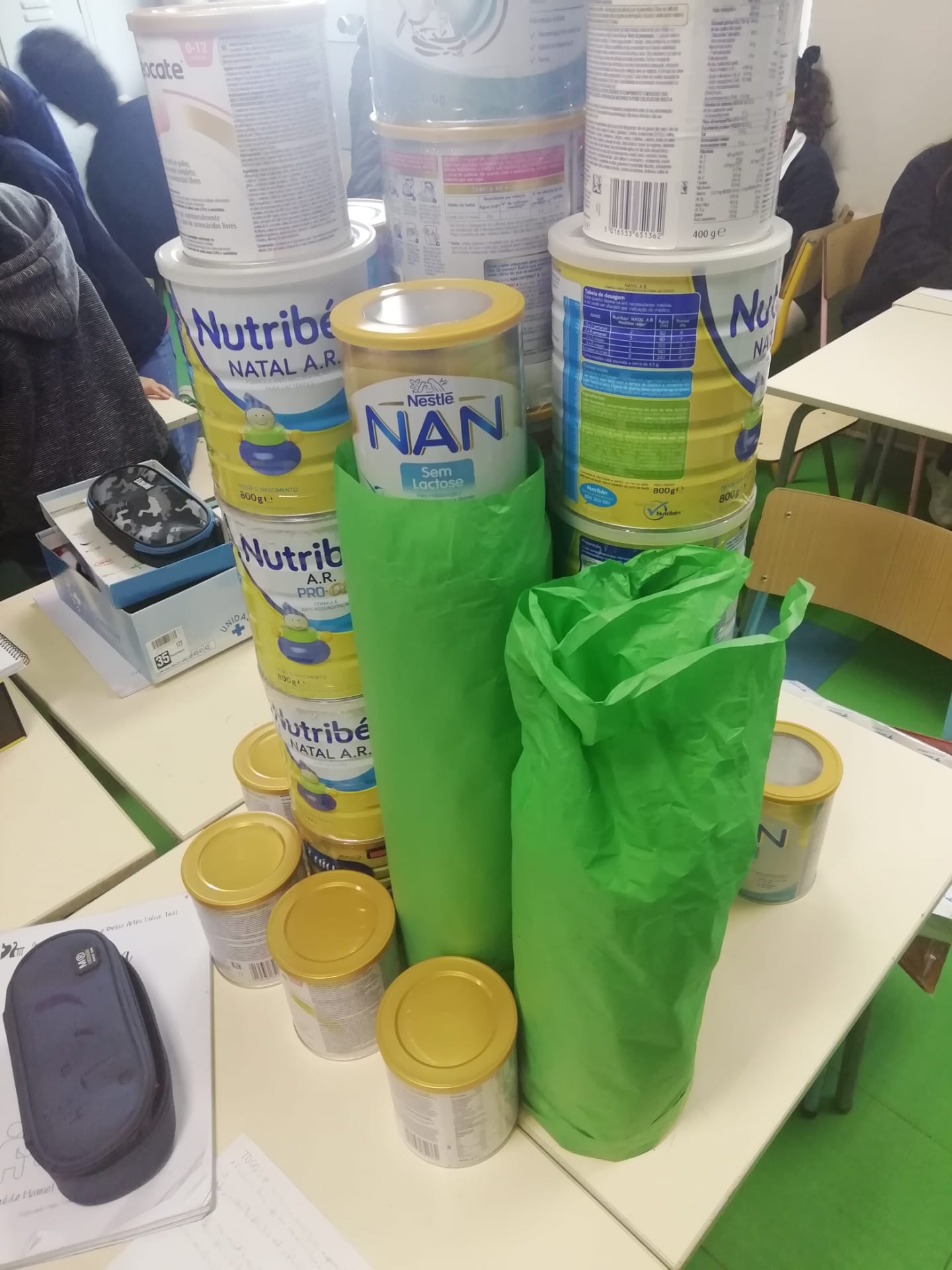 Oficina Criativa – Construção de uma árvore de natal com latas de leite para bebé.