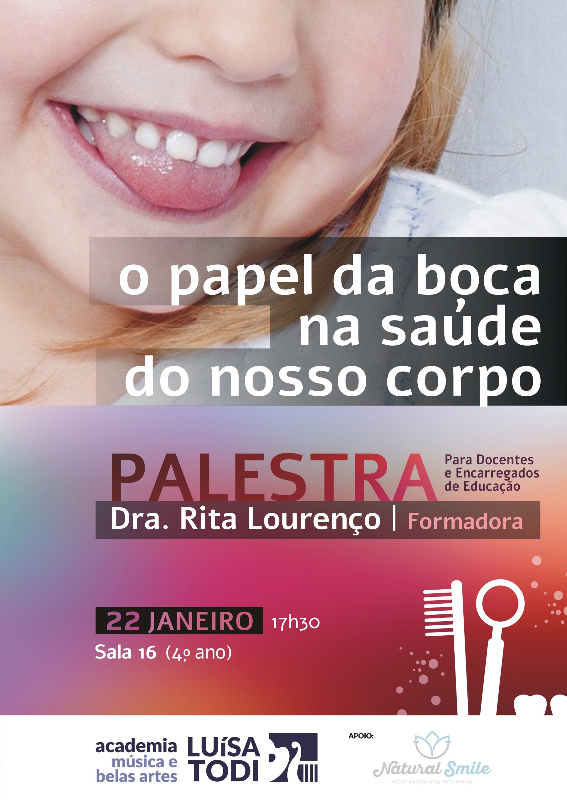 No dia 22 de janeiro de 2020, pelas 17h30, na sala do 4º ano, da Academia de Música e Belas Artes Luísa Todi, terá lugar a Palestra sobre “O papel da boca na saúde do nosso corpo”.