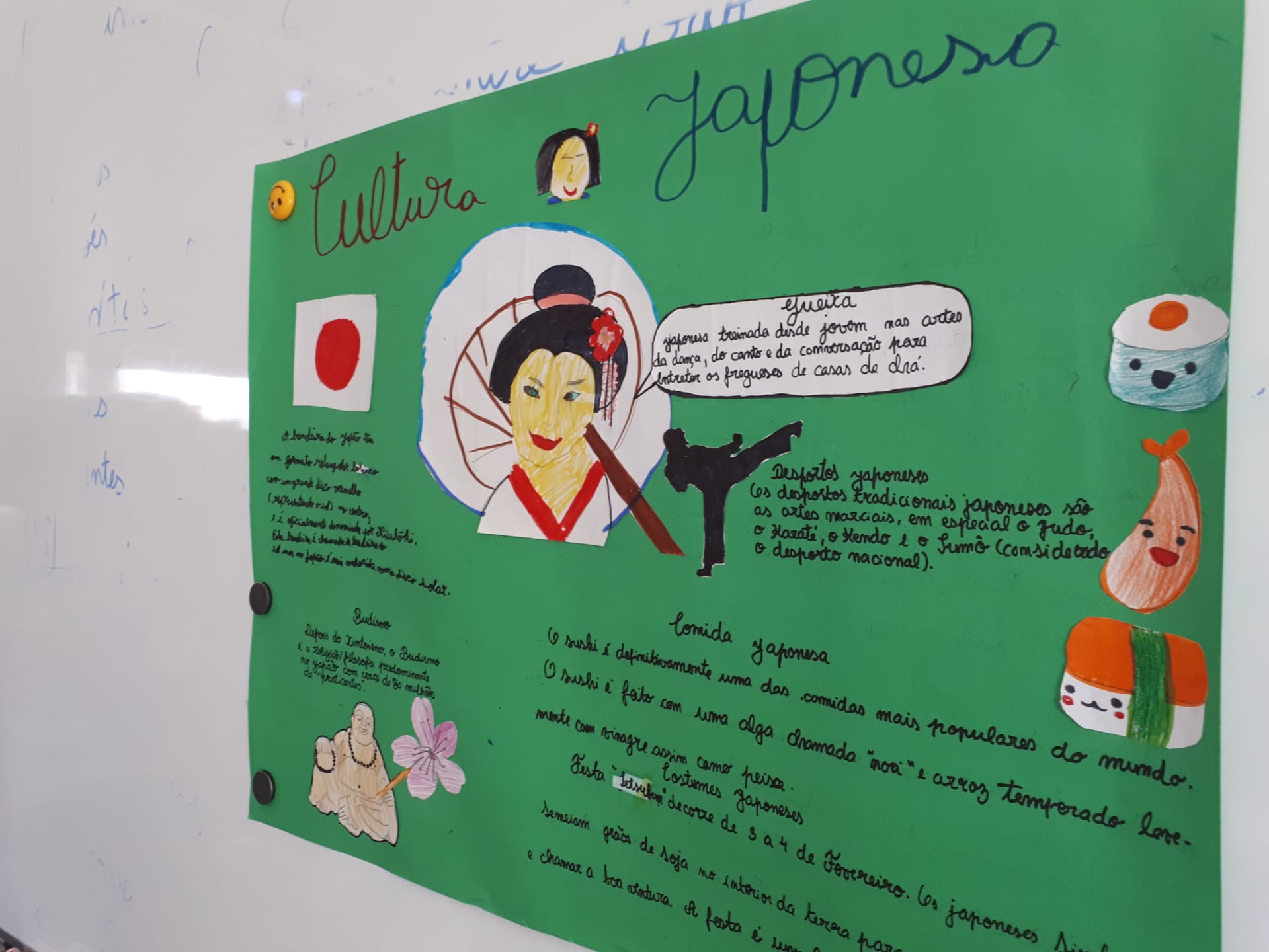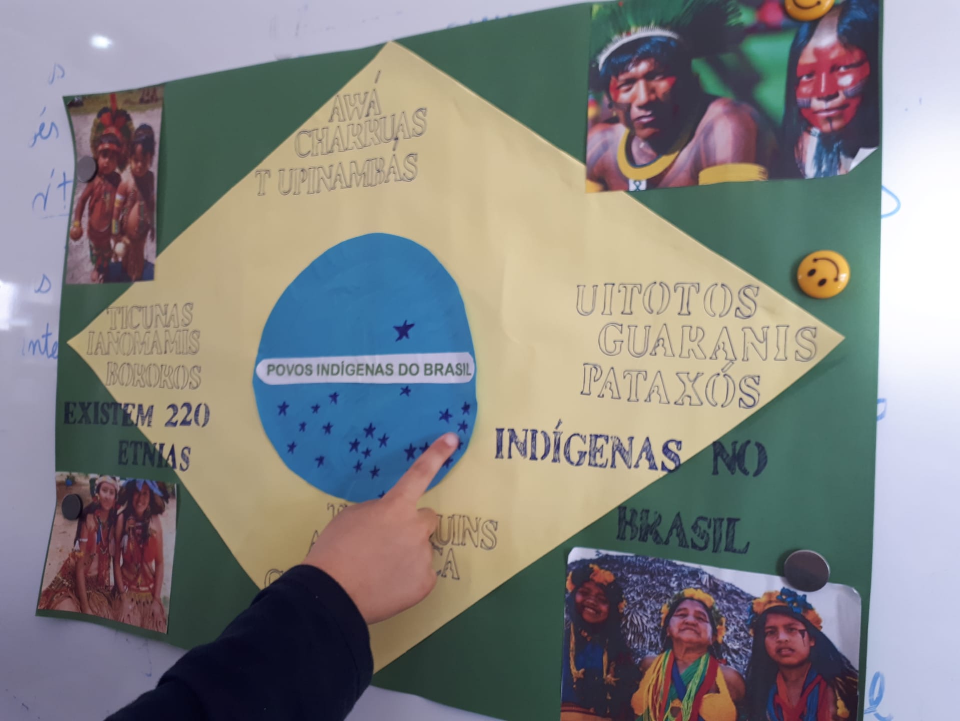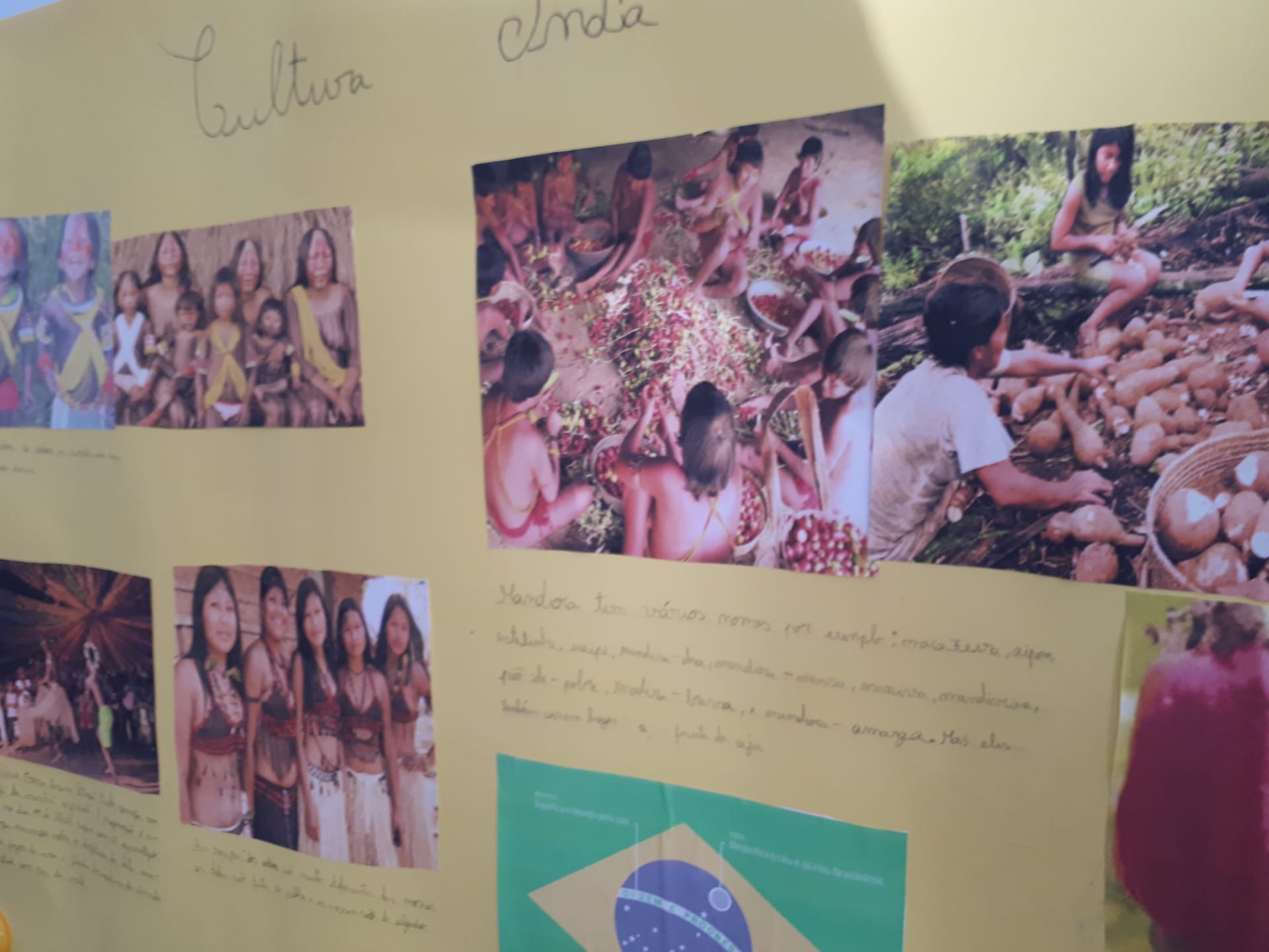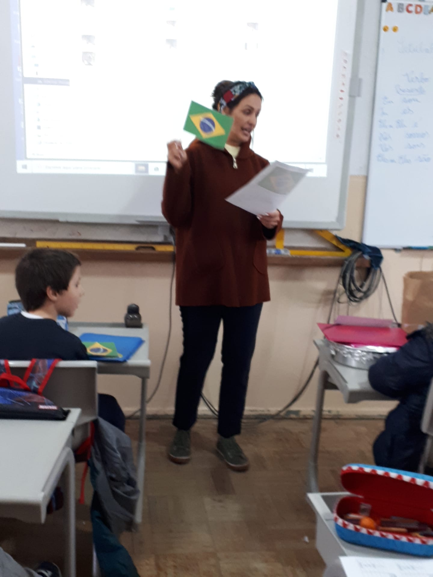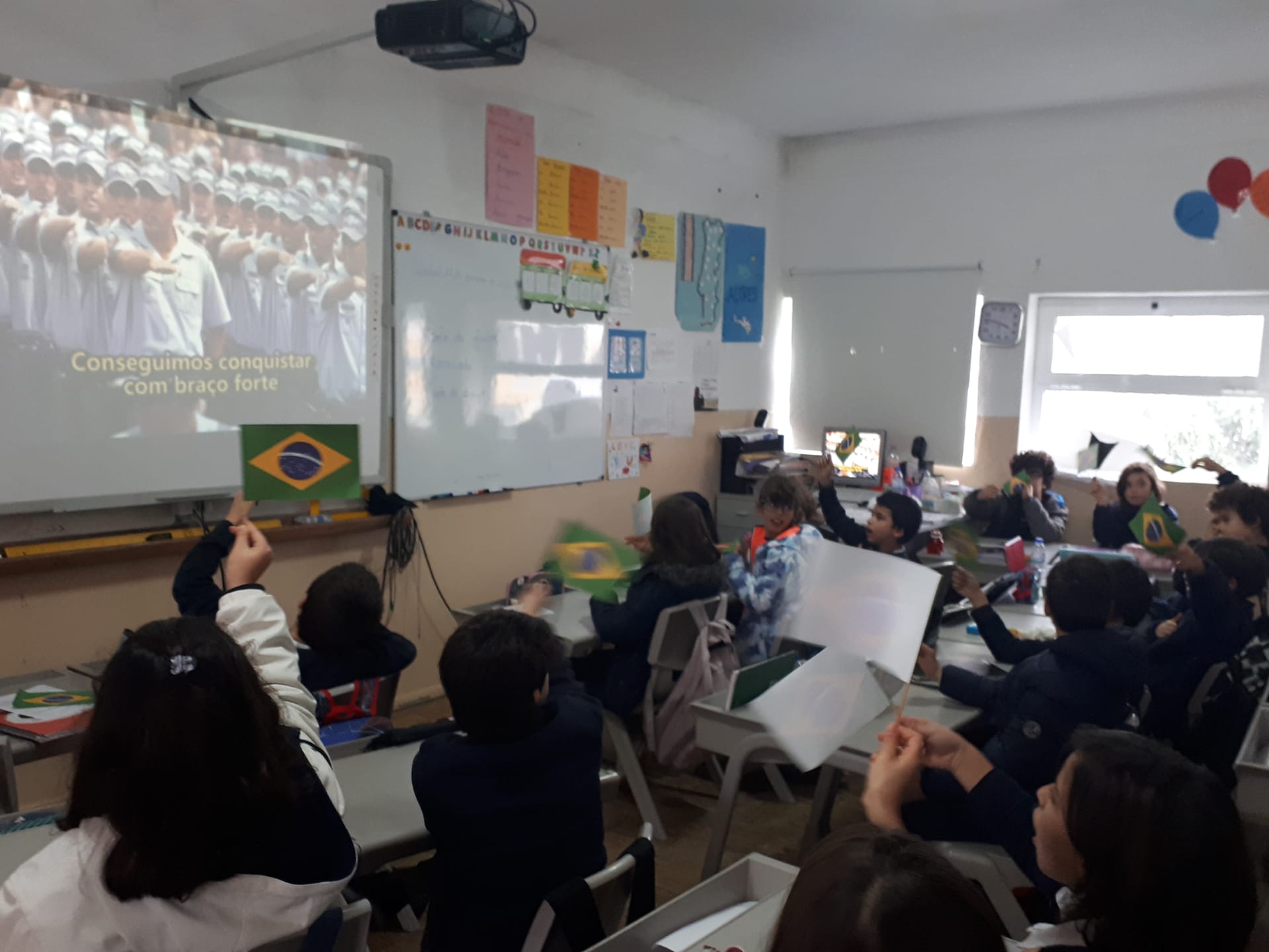 Na cultura Brasileira estudámos a bandeira, ouvimos o hino, localizámos o Brasil no mapa mundo, observámos paisagens, ouvimos histórias, vimos arquitetura parecida com a que existe em Portugal, “demos” mergulhos em cascatas, “dançámos” em festas parecidas com as tradicionais portuguesas, vimos índios e deliciámo-nos com a gastronomia. Comemos bolo de fubá, goiabada, doce de leite, paçoca, pão de queijo, canjica de milho e mané pelado.