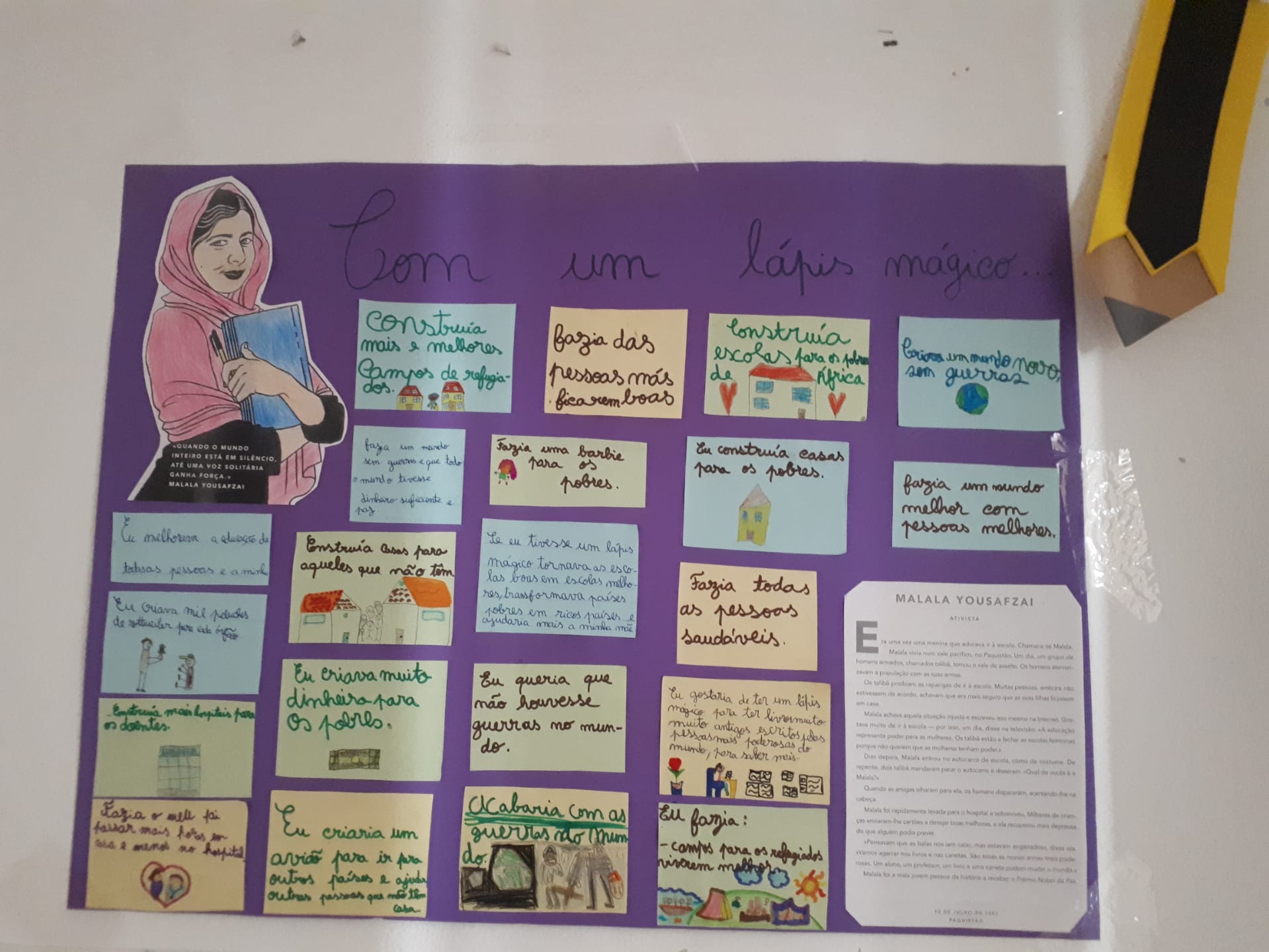 Português – Começámos por ouvir a história “Meninos e meninas do Mundo”, fizemos o reconto oral e a ilustração. Lemos e interpretámos o texto “De volta à Terra” e abordámos os advérbios de afirmação e de negação. Ouvimos a história de Malala, lemos o livro “O lápis mágico” e lemos a biografia de Malala. Ouvimos a história “Porque somos de cores diferentes”. E construímos acrósticos sobre a multiculturalidade.