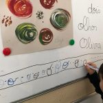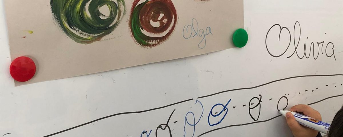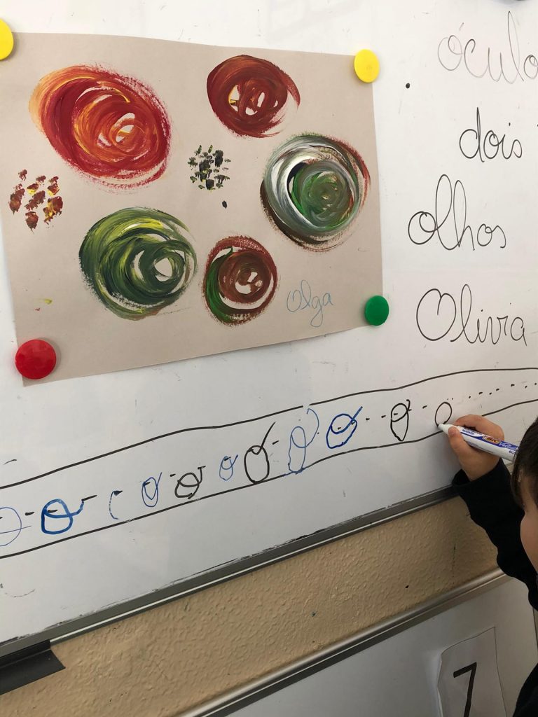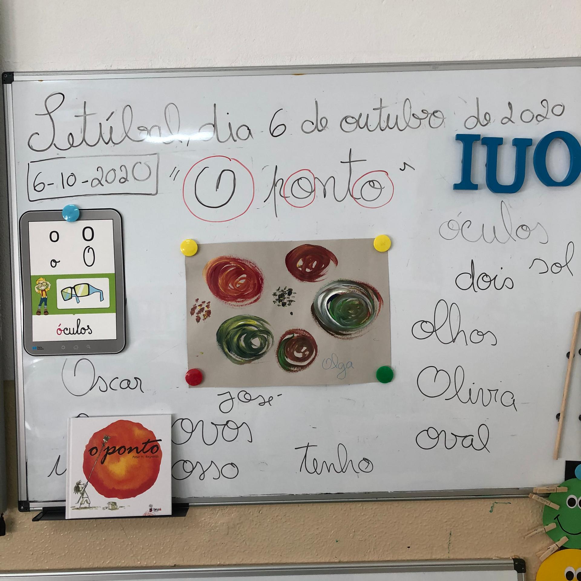Esta semana introduzimos a letra “o” com a Olga, a personagem da nossa história – “O Ponto” de Peter H. Reynolds. Ao contrário do “i” e do “u”, reparámos que o “o”, às vezes, é um pouco maroto! Por exemplo, na palavra “tio” faz-se passar por “u”! Assim, descobrimos que esta letra pode ter quatro sons diferentes! Para além disso, aprendemos dois ditongos novos: “oi” e “ou”! Descobrimos que existe uma ordem quando começamos a escrever, seja no quadro, numa folha ou no nosso caderno! Começamos sempre da esquerda para a direita e não pelo meio ou fim da folha! |