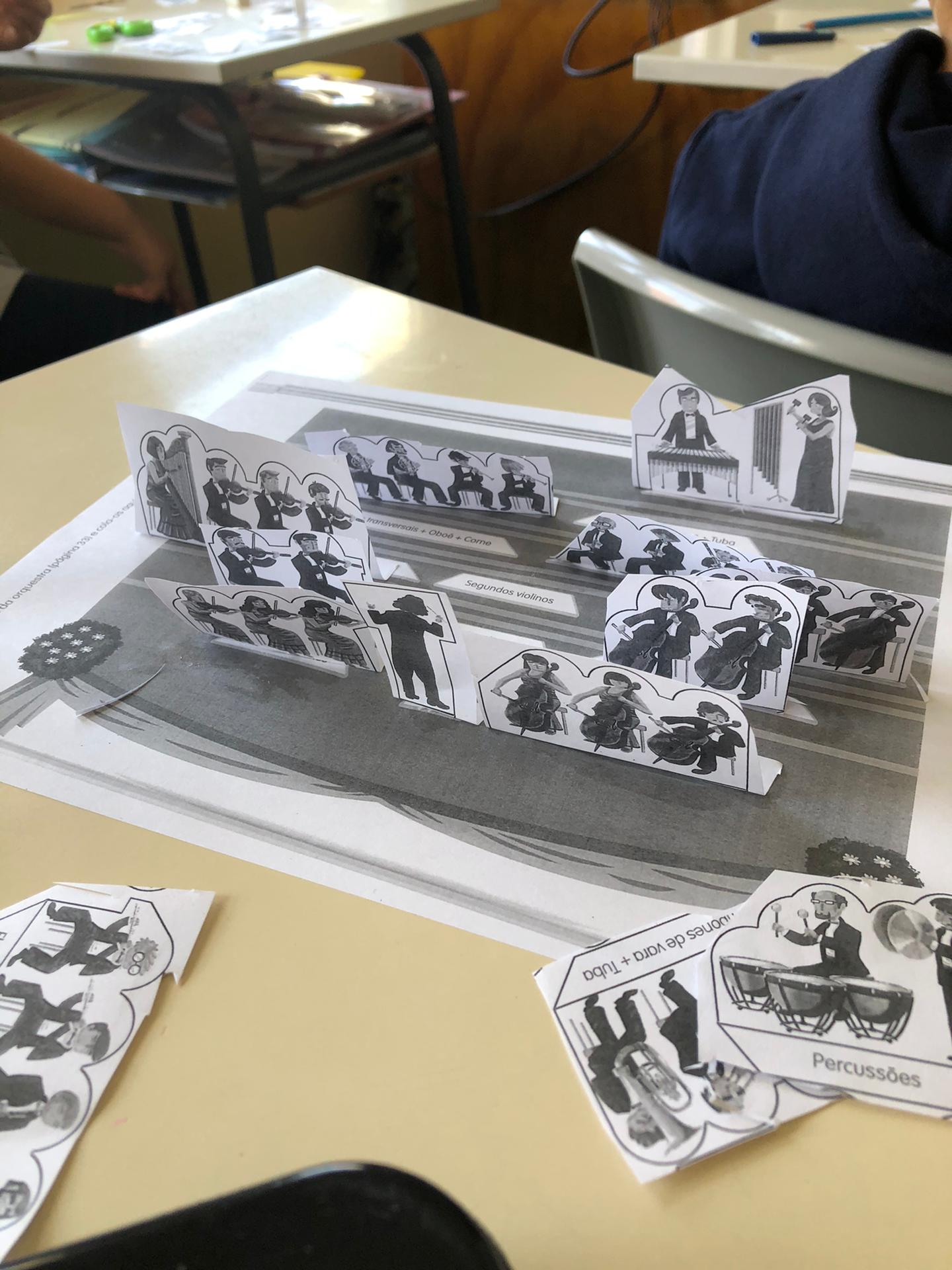 Falámos sobre Orquestras e descobrimos que esta é composta por imensos músicos e instrumentos diferentes! Para além disso, vimos que numa orquestra há muitos instrumentos que têm o “o” no seu nome – o Oboé, por exemplo, para além de começar pela letra “o” tem um “o” que tem o som de “u”. No final, construímos a nossa própria orquestra. |