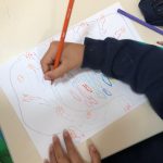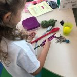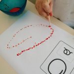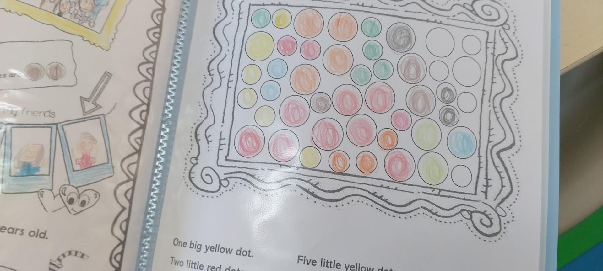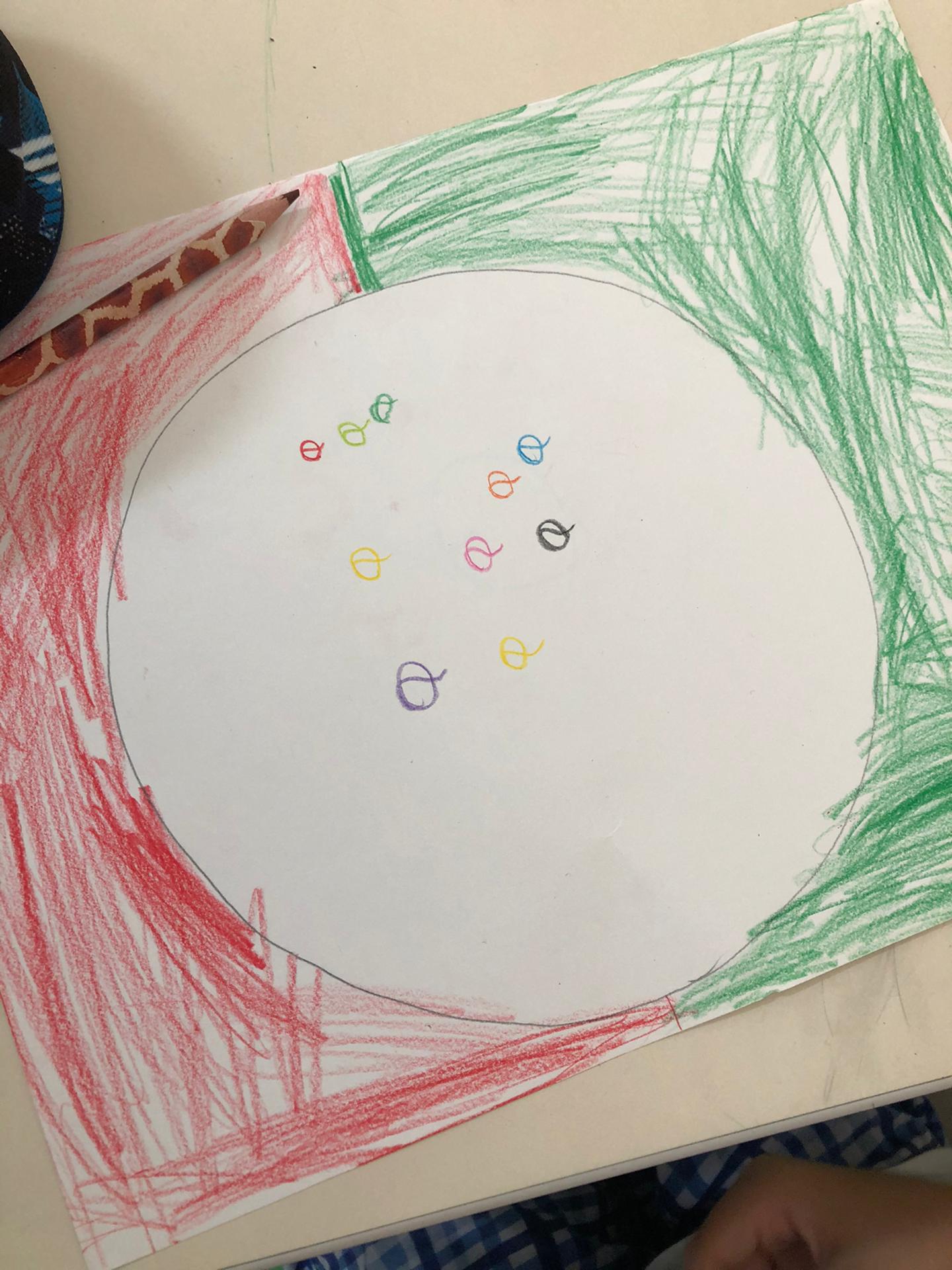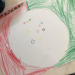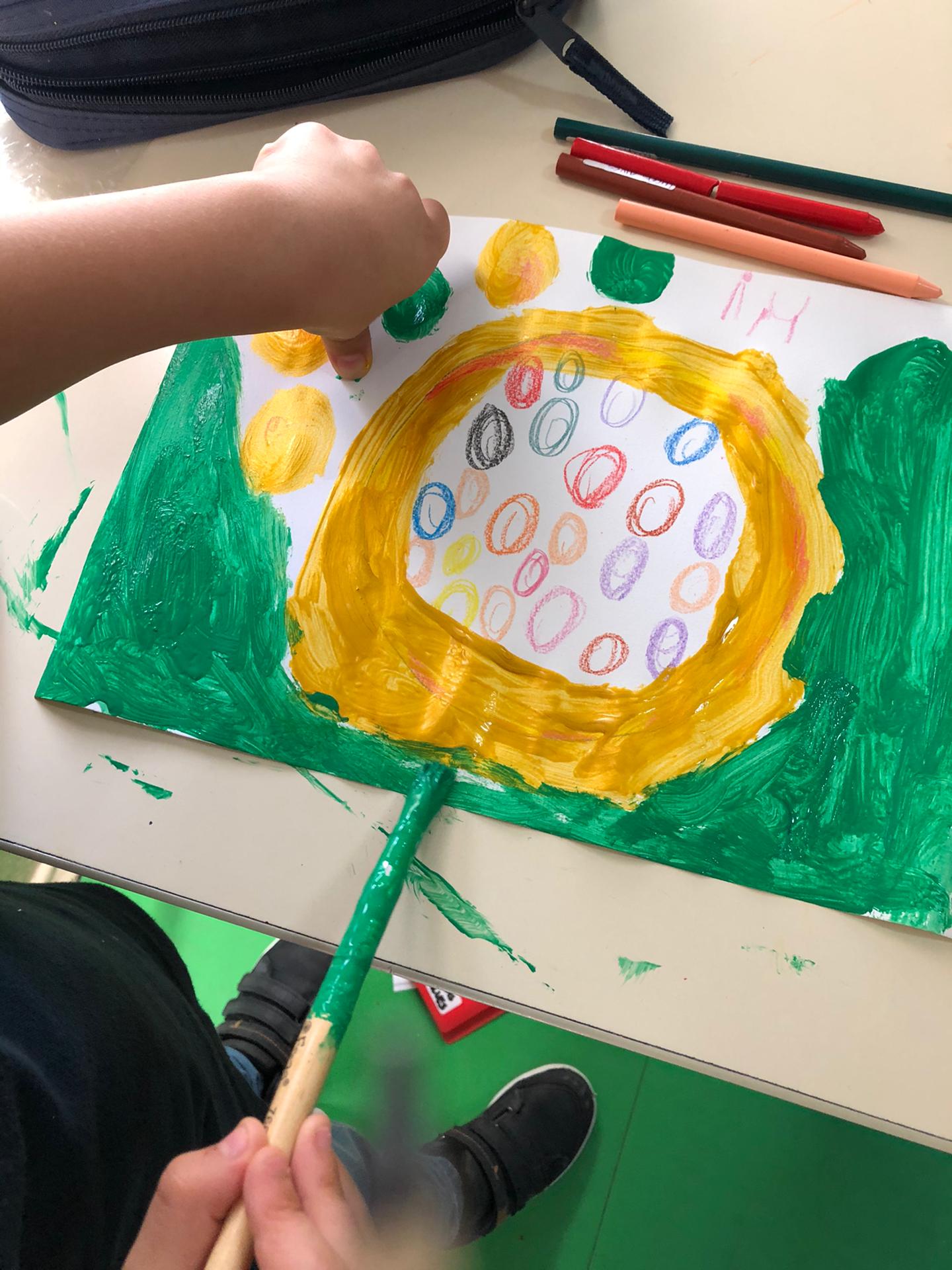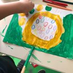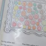 Ouvimos a mesma história que em Português, mas na sua versão original, em inglês – “The Dot”. Pintámos pontos grandes e pequenos de várias cores, mas não foi de qualquer forma, recebemos uma ordem para os pintar (por exemplo, ponto grande de amarelo). |