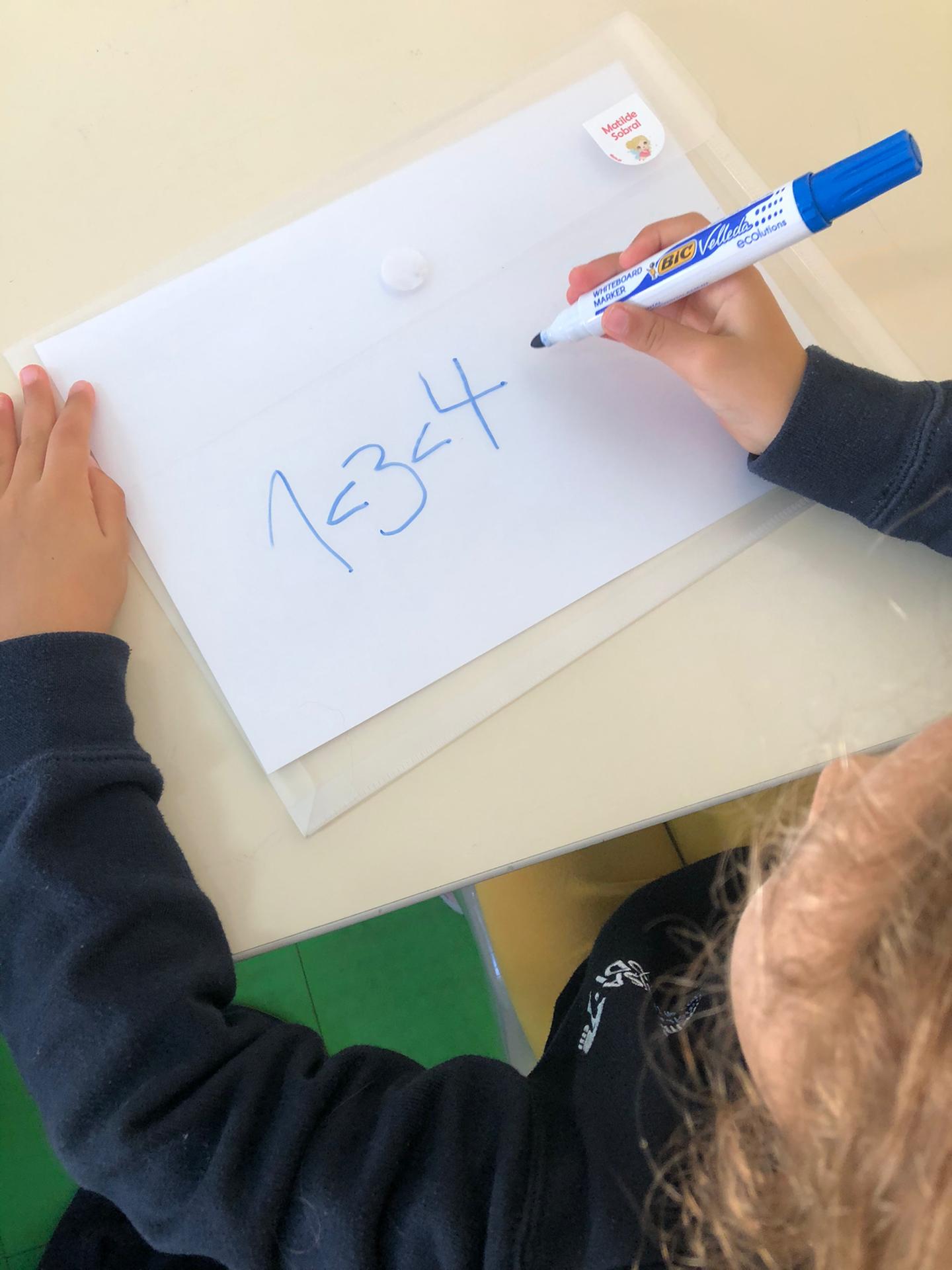 Na matemática descobrimos que podemos ordenar os números: ora seja por ordem crescente (do menor para o maior), ora por ordem decrescente (do maior para o menor)! Para isso relembrámos os símbolos matemáticos já aprendidos: < e >. Também descobrimos que o ditongo “oi” está no número dois! |