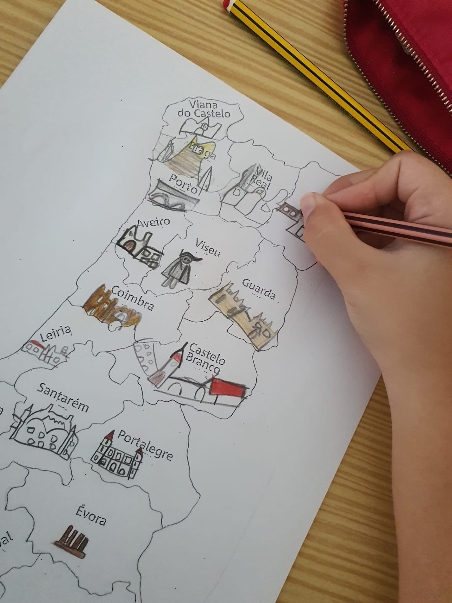 Na disciplina de Artes Visuais os alunos pesquisaram evidências de locais do nosso país onde estiveram com a família e trouxeram-nas para a escola. A seguir elaboraram um mapa identificando esses pontos.