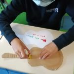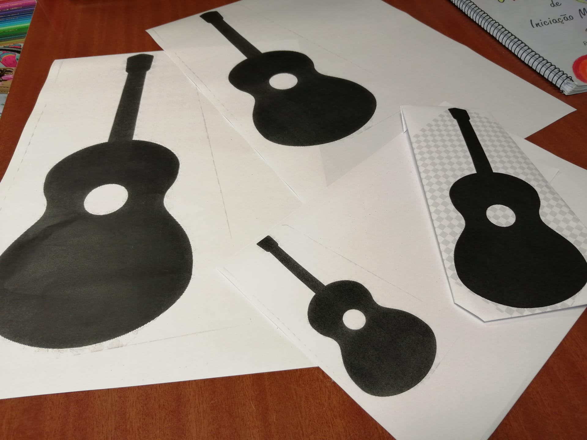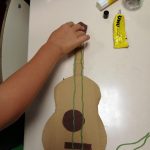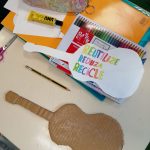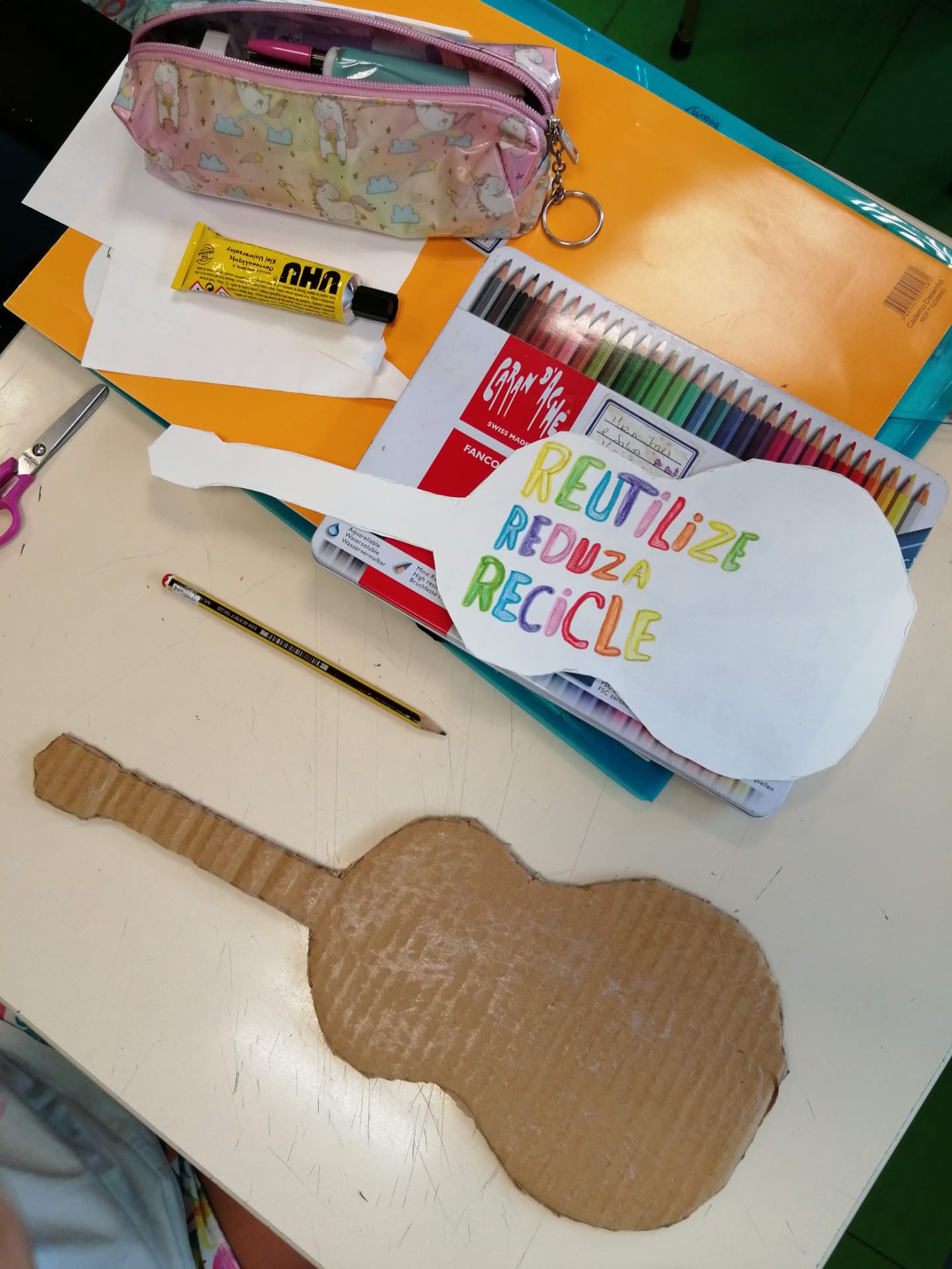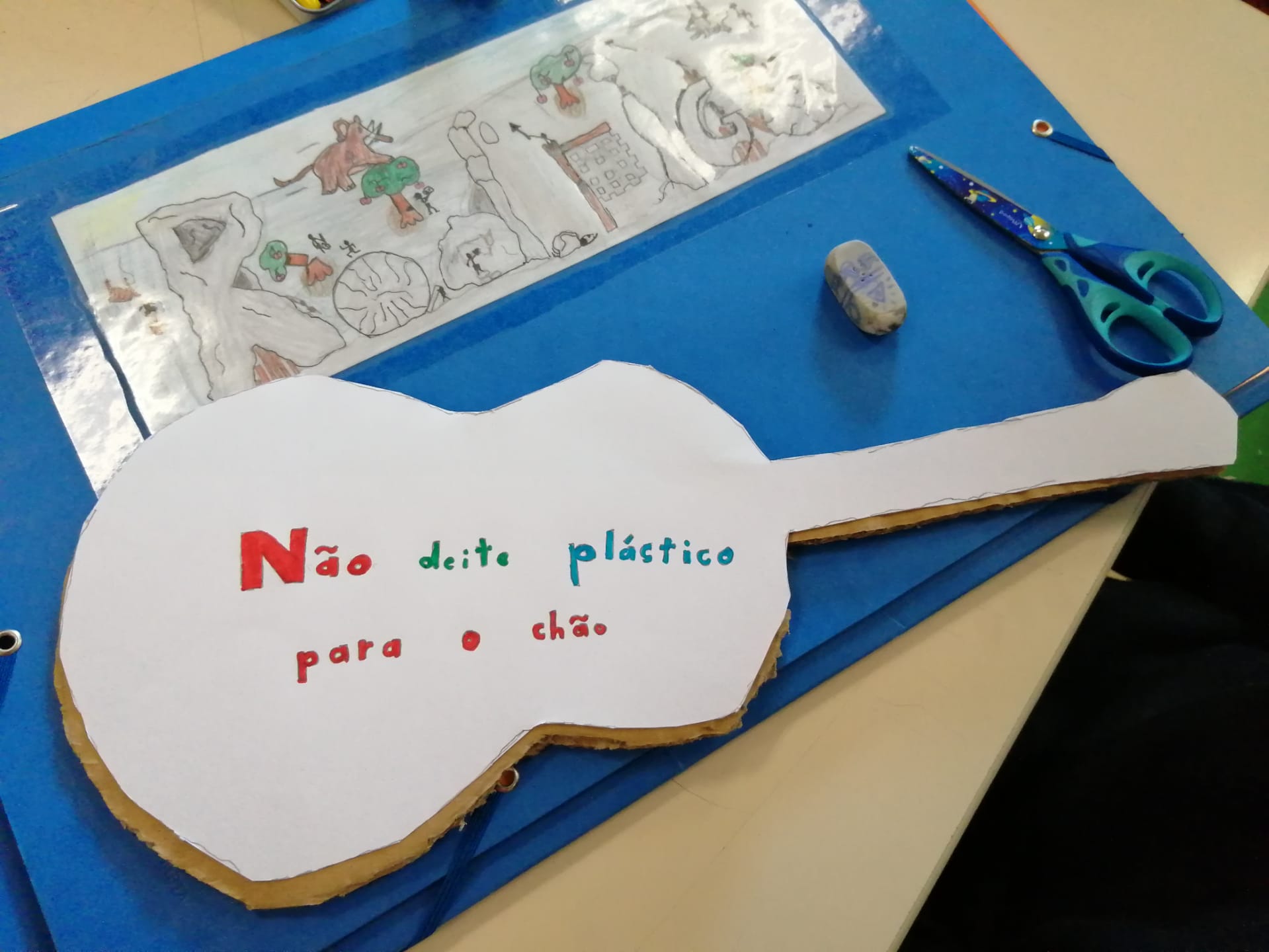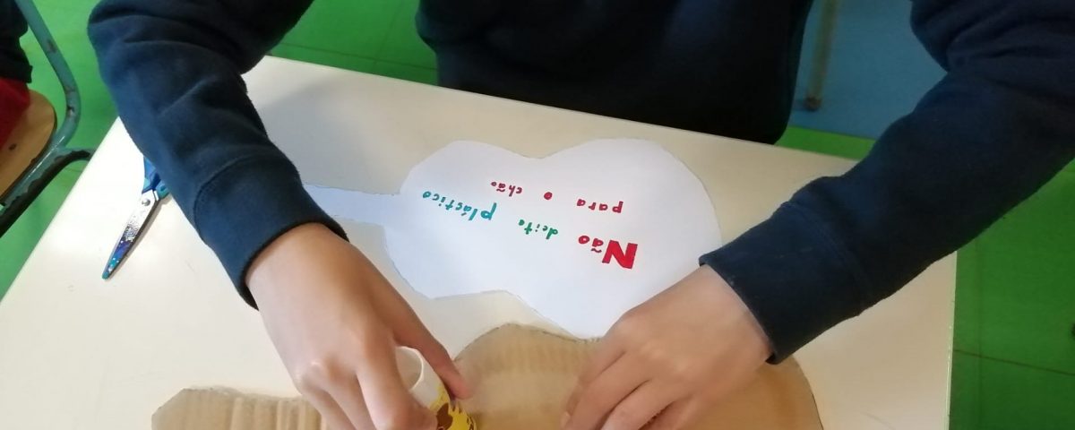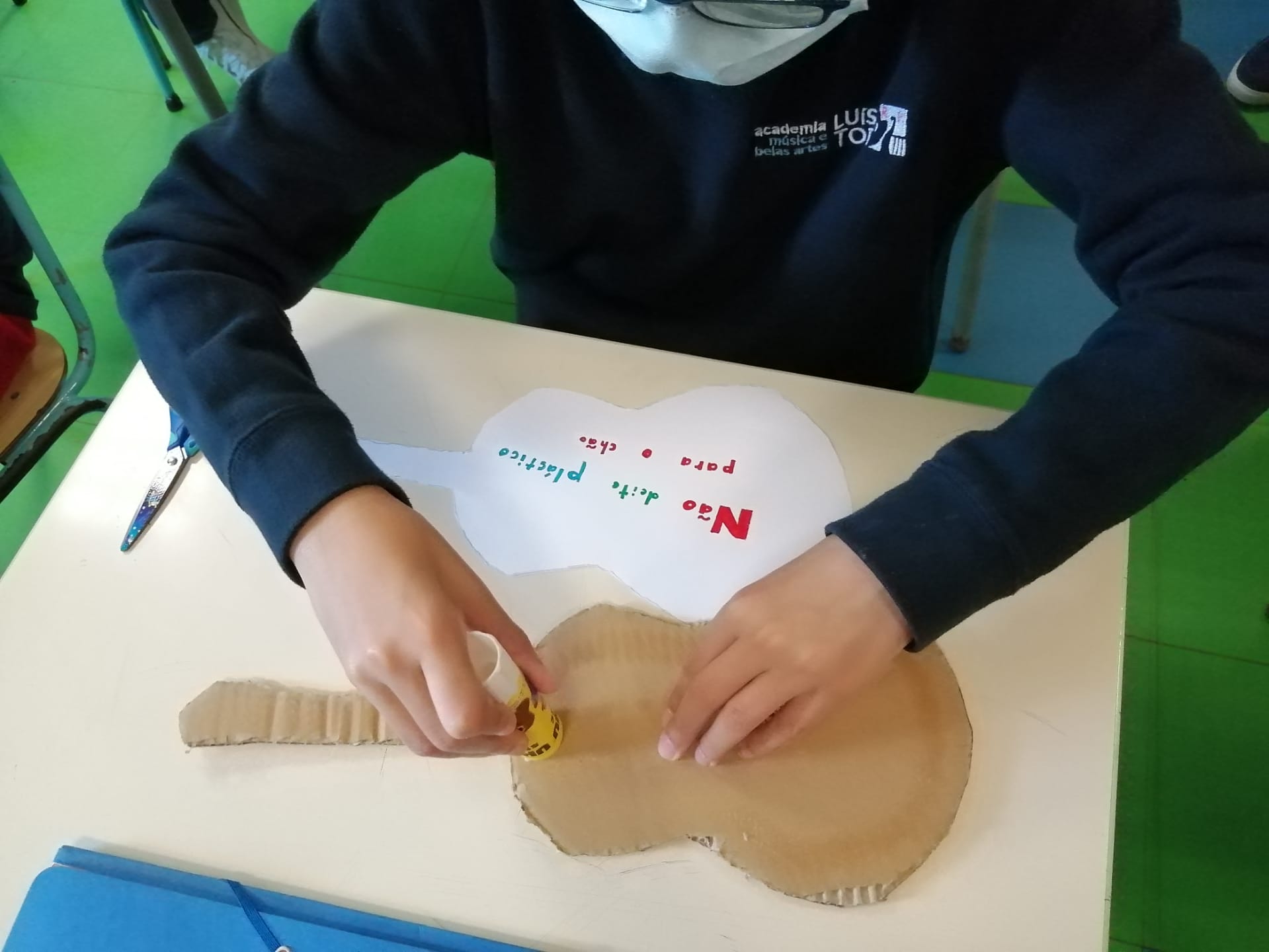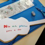 Educação Visual – Construção de guitarras com materiais recicláveis com base na silhueta de uma guitarra que os alunos reproduziram e recortaram numa base de cartão. Para a decoração recorreu-se à utilização de materiais diversos como lã e restos de cartolina e outros papéis (por exemplo: para representar as cordas do instrumento). Ilustração e criação de uma mensagem alusiva ao tema da “Sustentabilidade”. O trabalho ficou concluído após a colagem da ilustração e mensagem na silhueta da guitarra feita com o cartão.