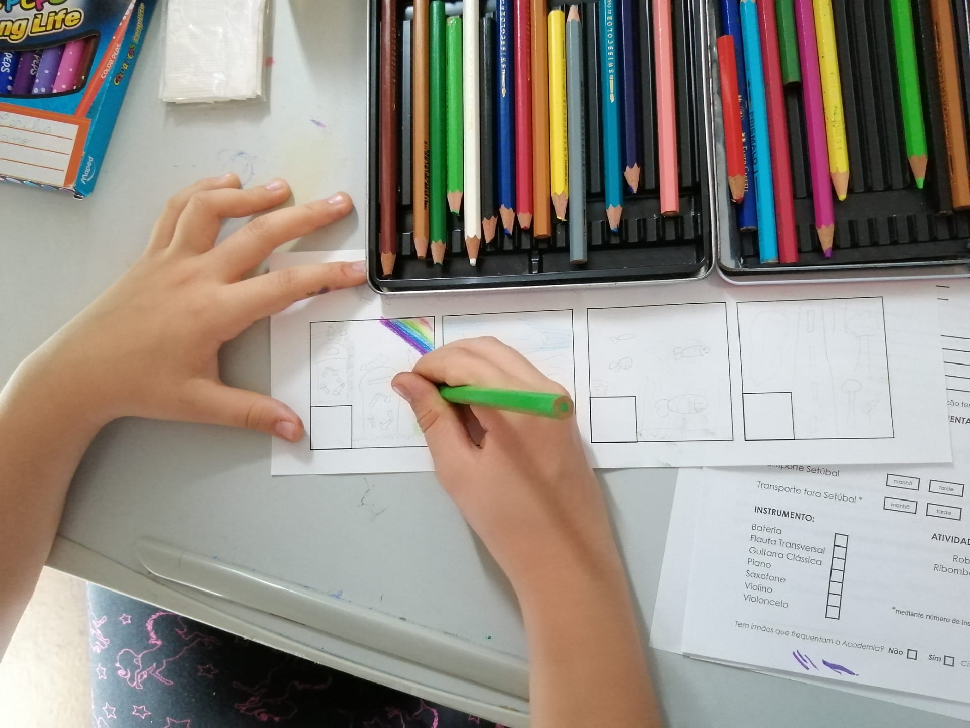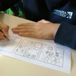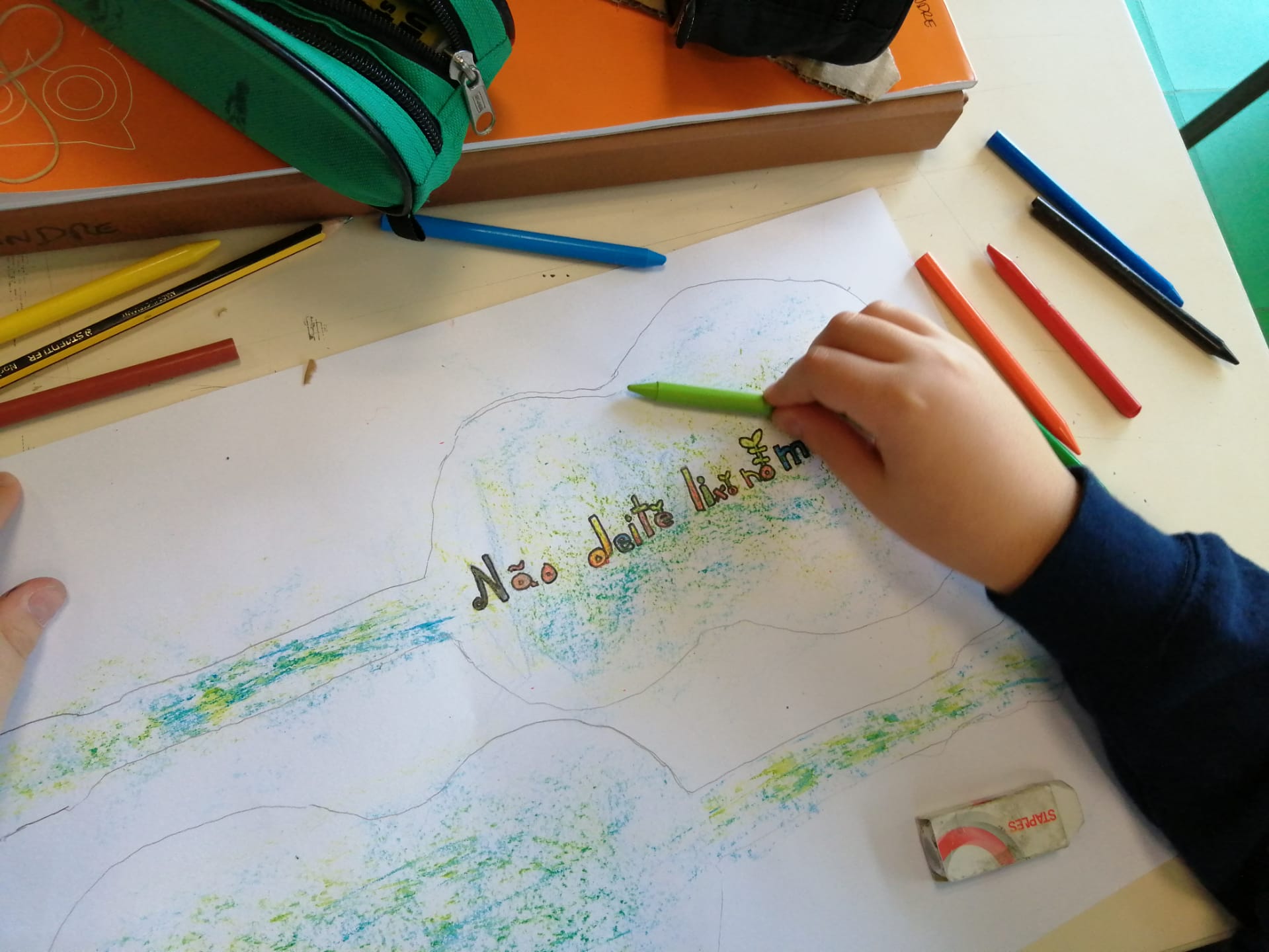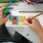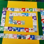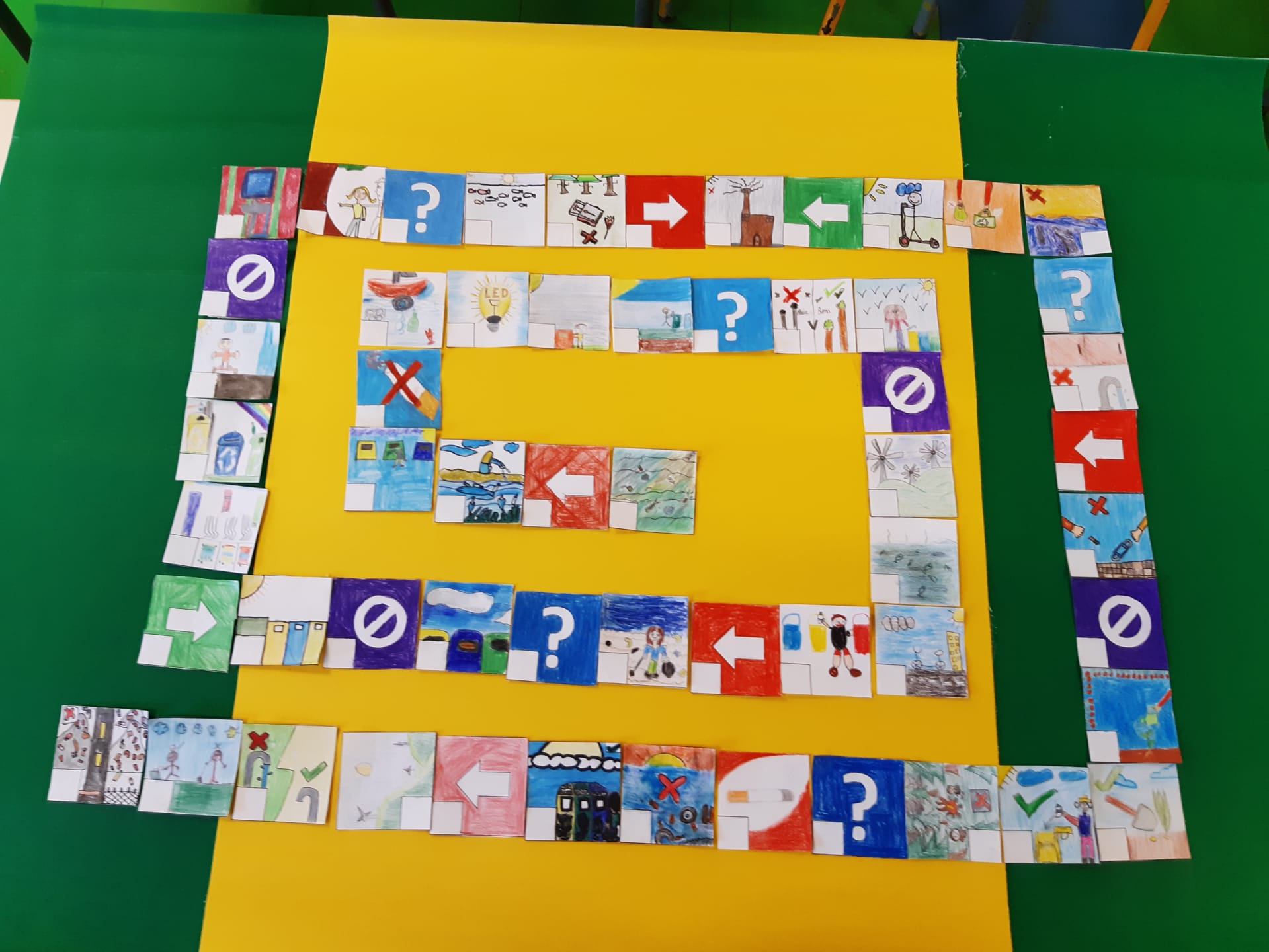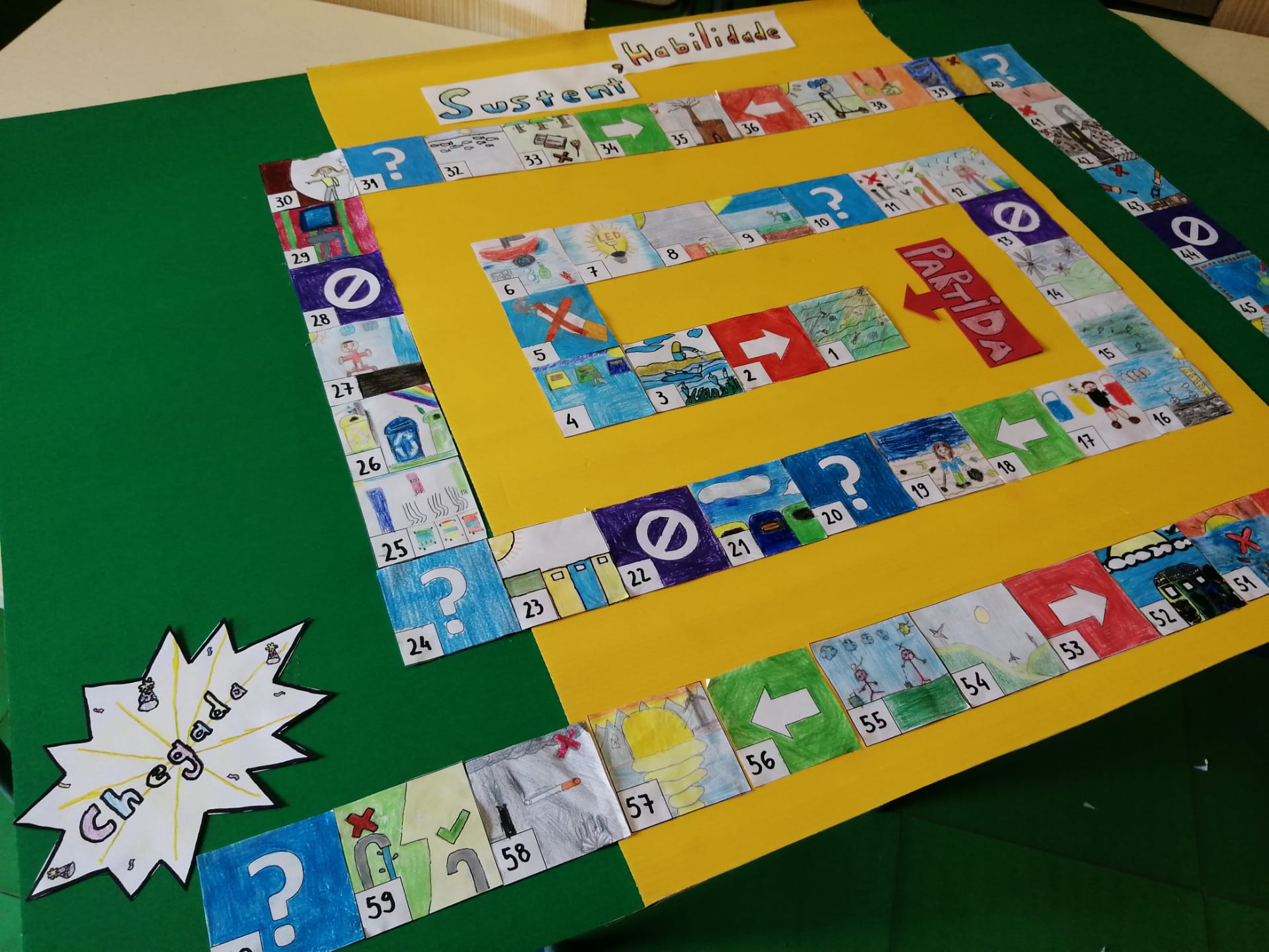 Oficina Criativa – Os alunos do 5º e 6º anos trabalharam em parceria com tarefas definidas para cada ano. O objetivo final foi realizar um tabuleiro do Jogo da Glória da Sustentabilidade. Ao 5º ano coube ilustrar os quadrados do jogo (tal como o 6º ano) e escolher o título do jogo.