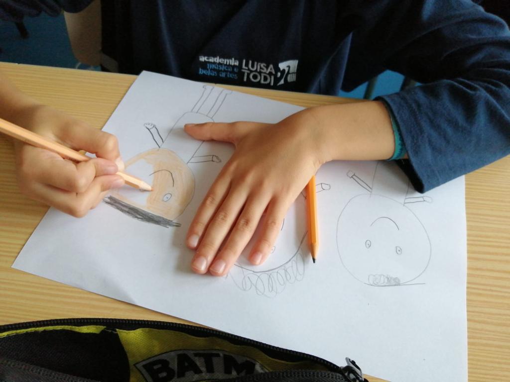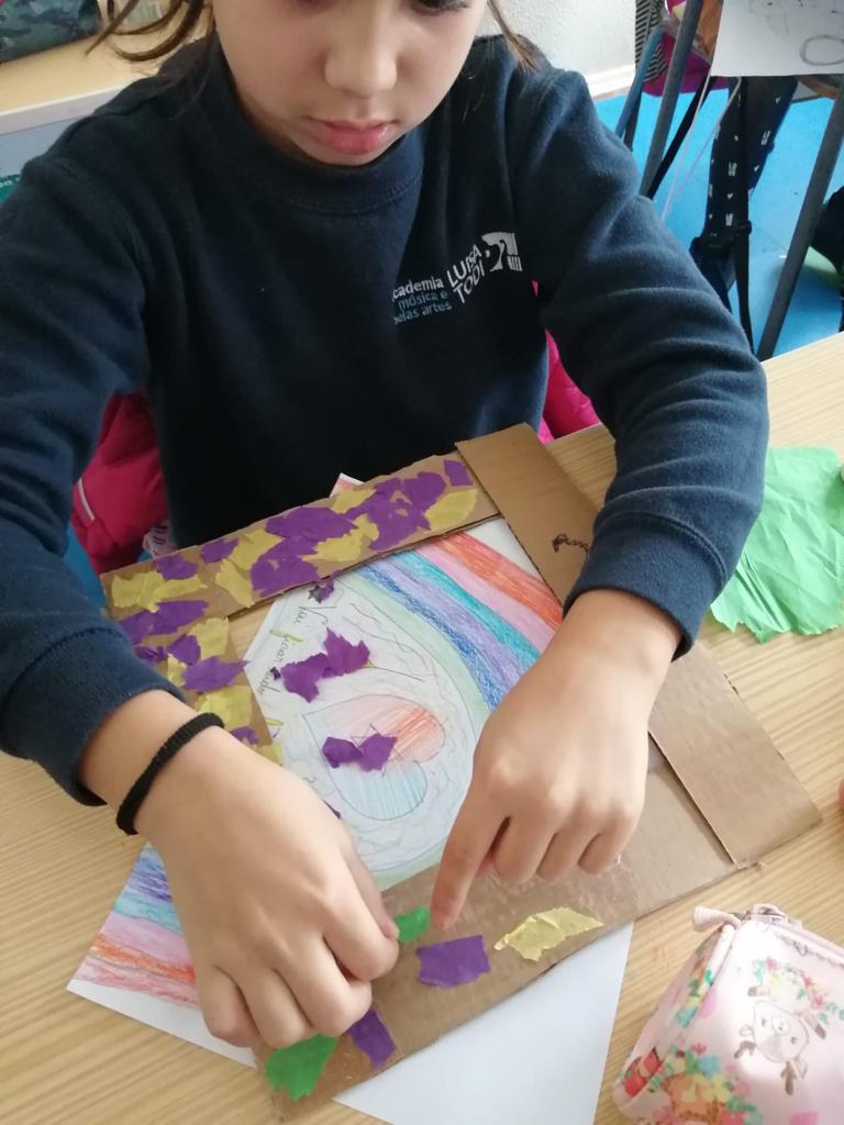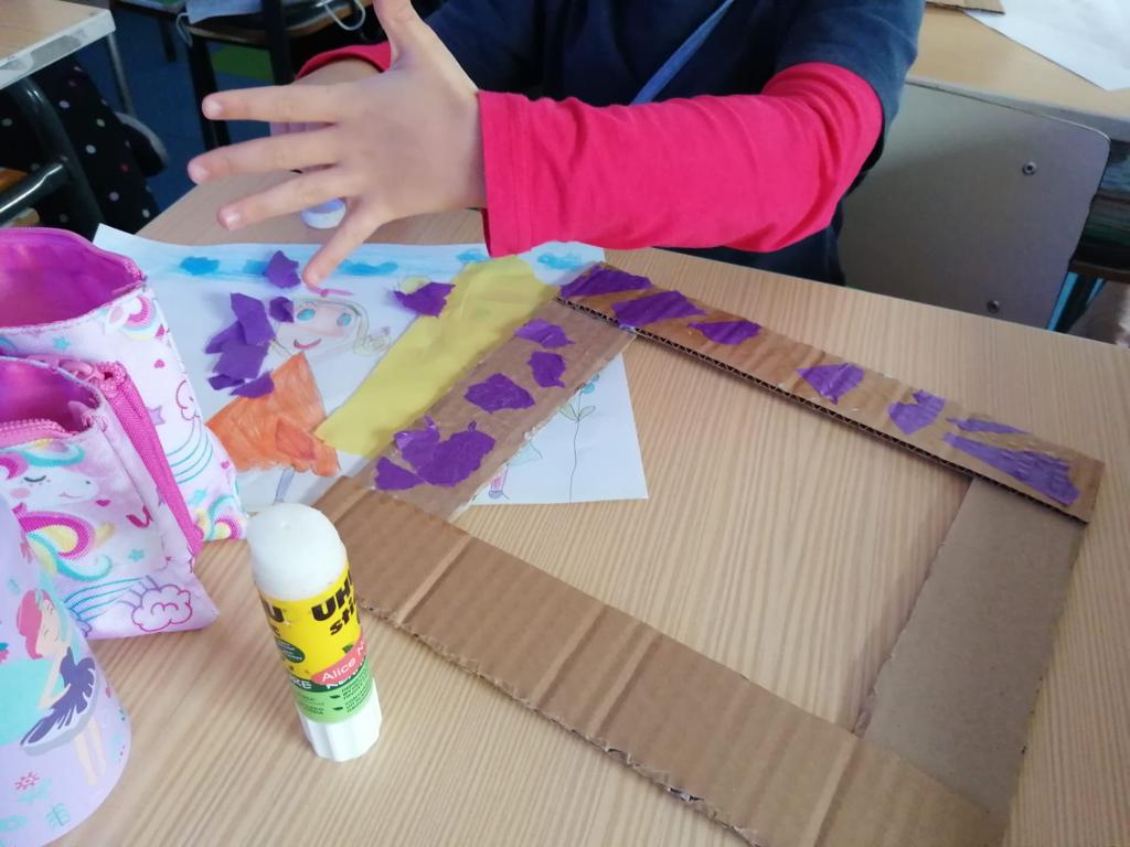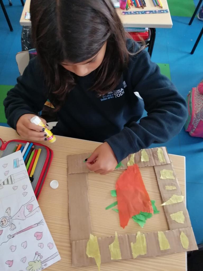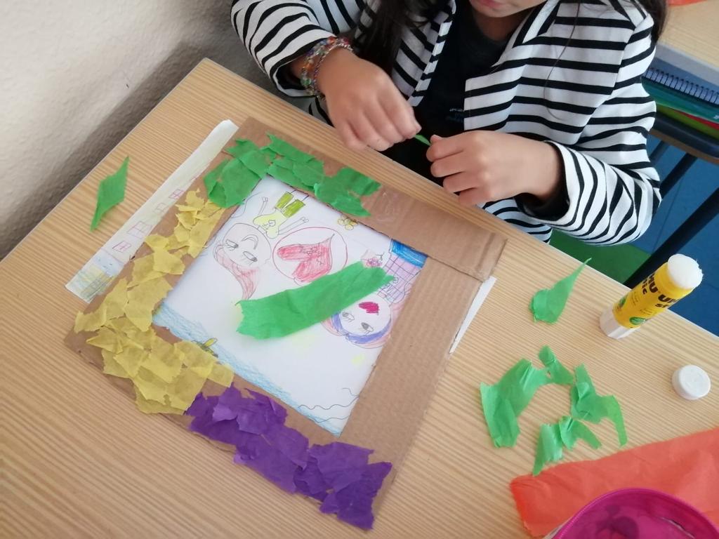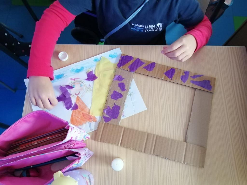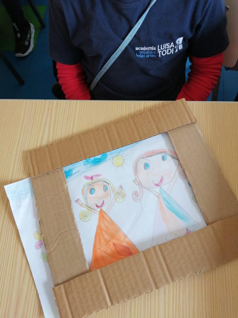 Nas Artes Visuais construíram molduras e colaram alguns desenhos para a elaboração de um painel.