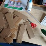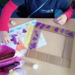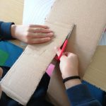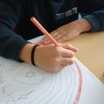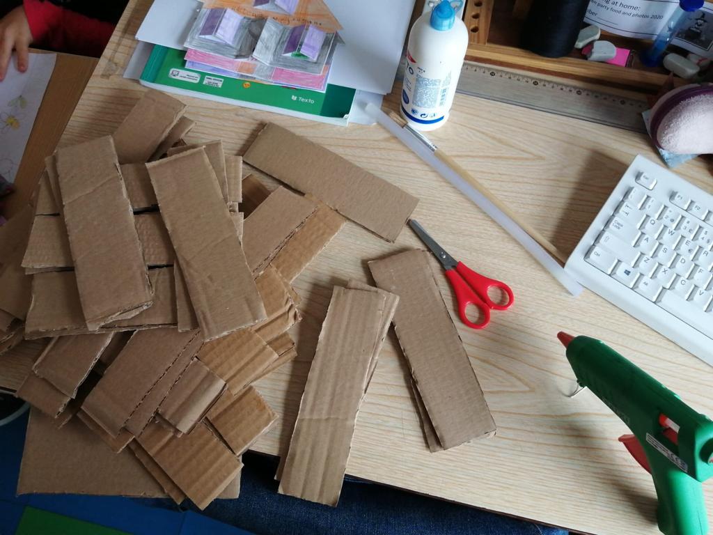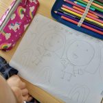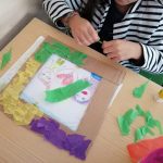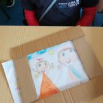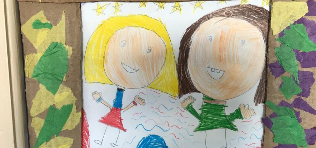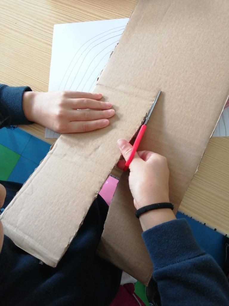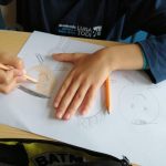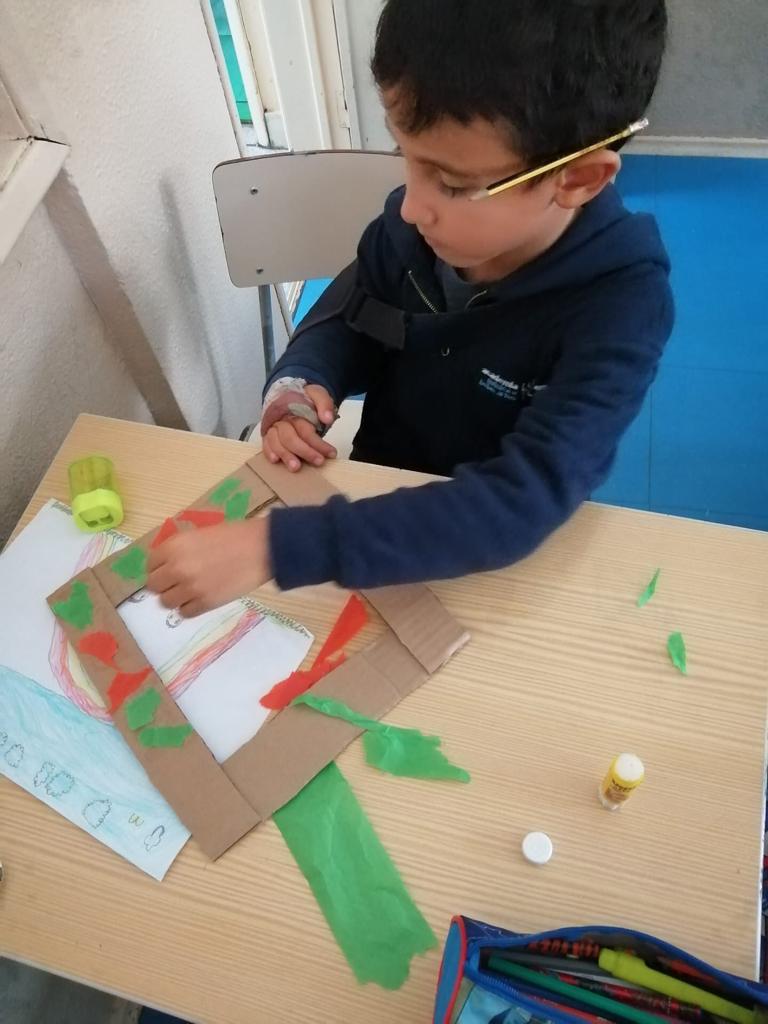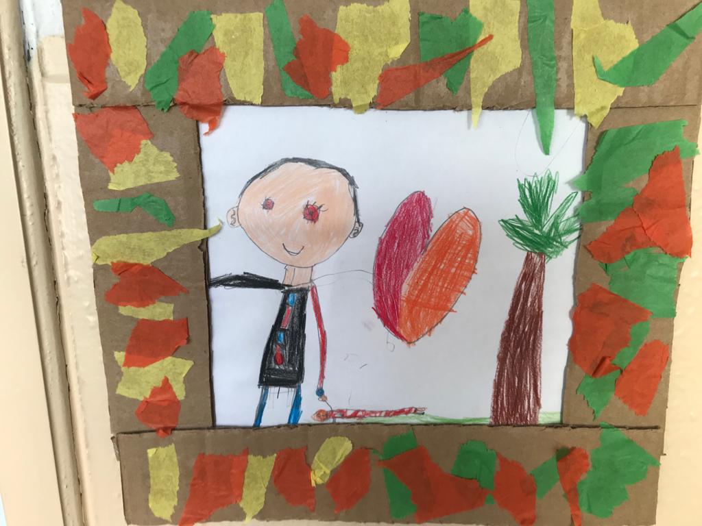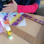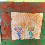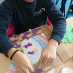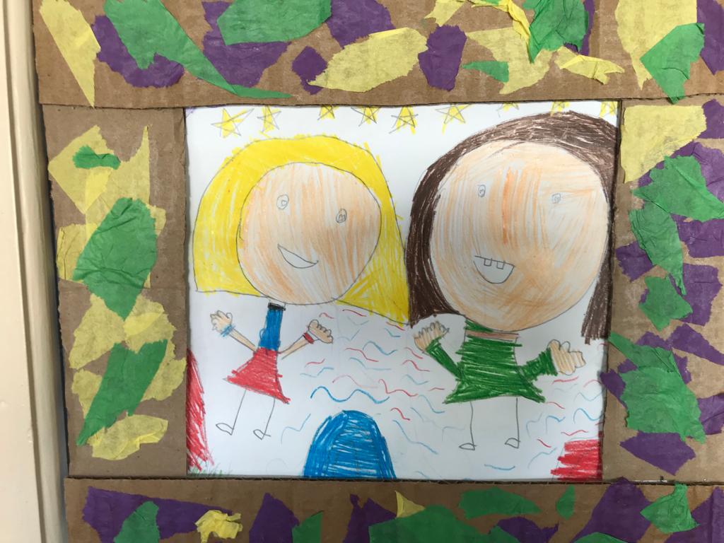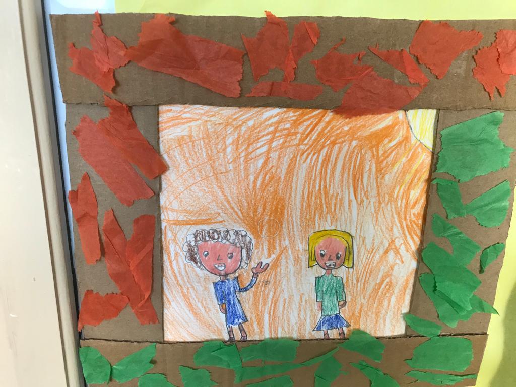 Nas Artes Visuais construíram molduras e colaram alguns desenhos para a elaboração de um painel.