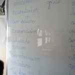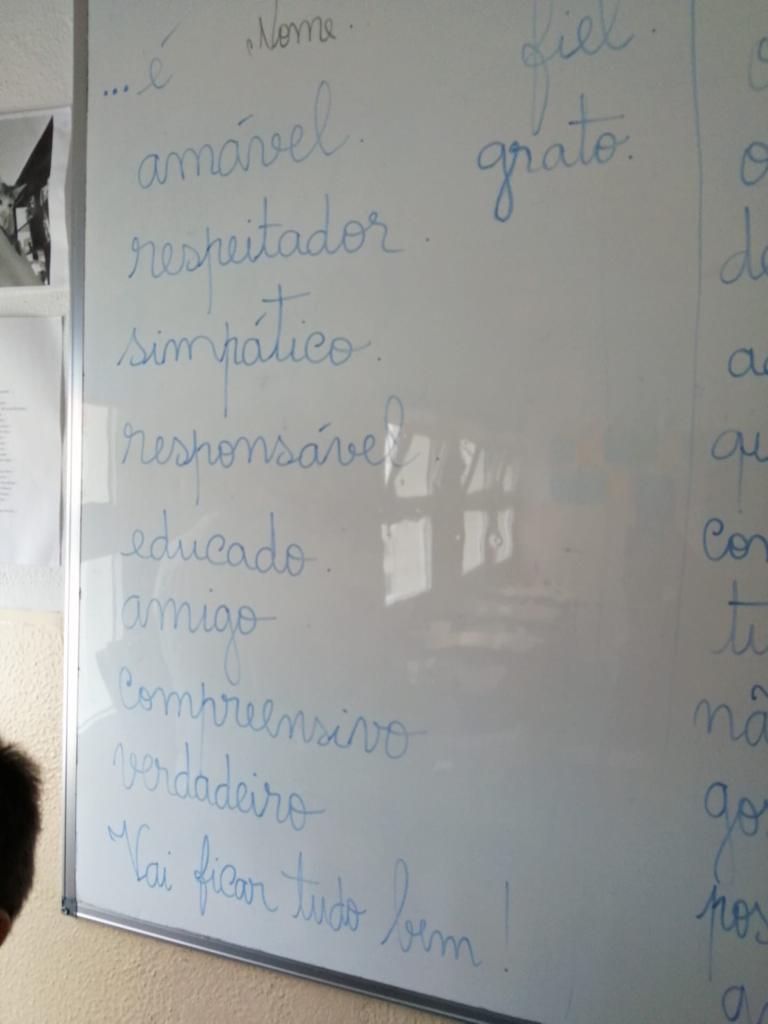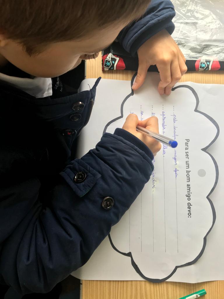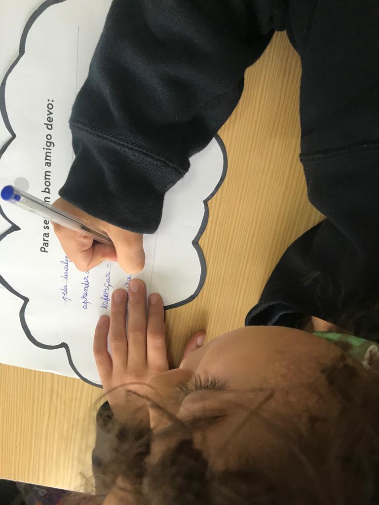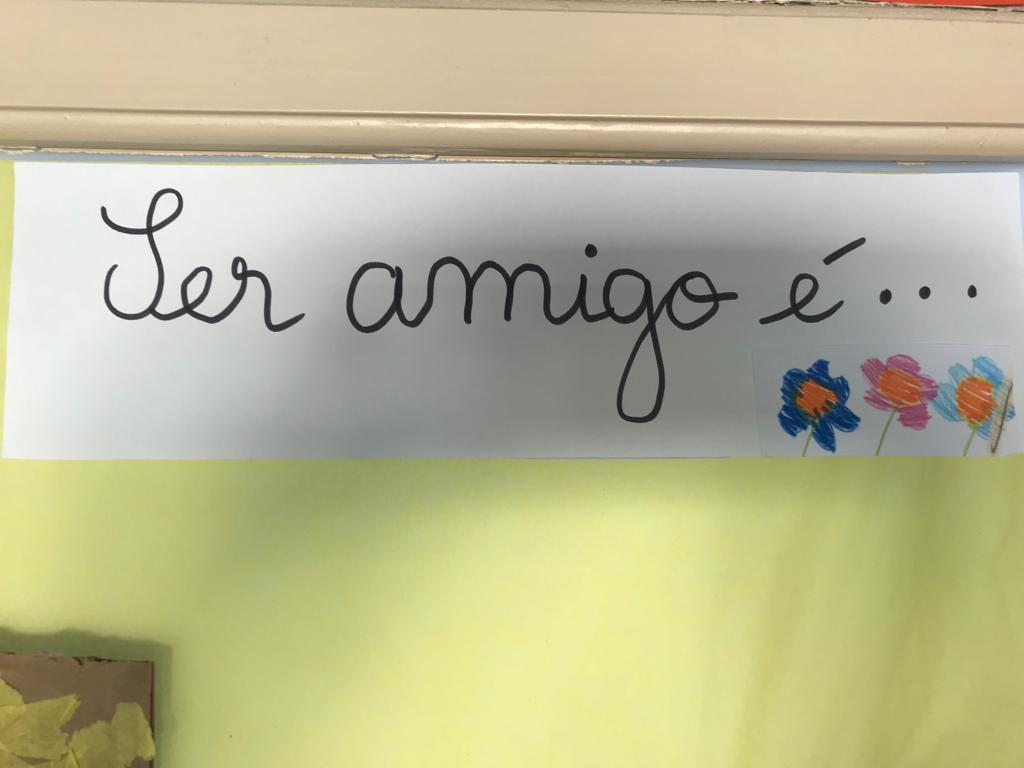 Os alunos escreveram regras, expressões, frases e desenharam aquilo que é necessário para sermos todos amigos.