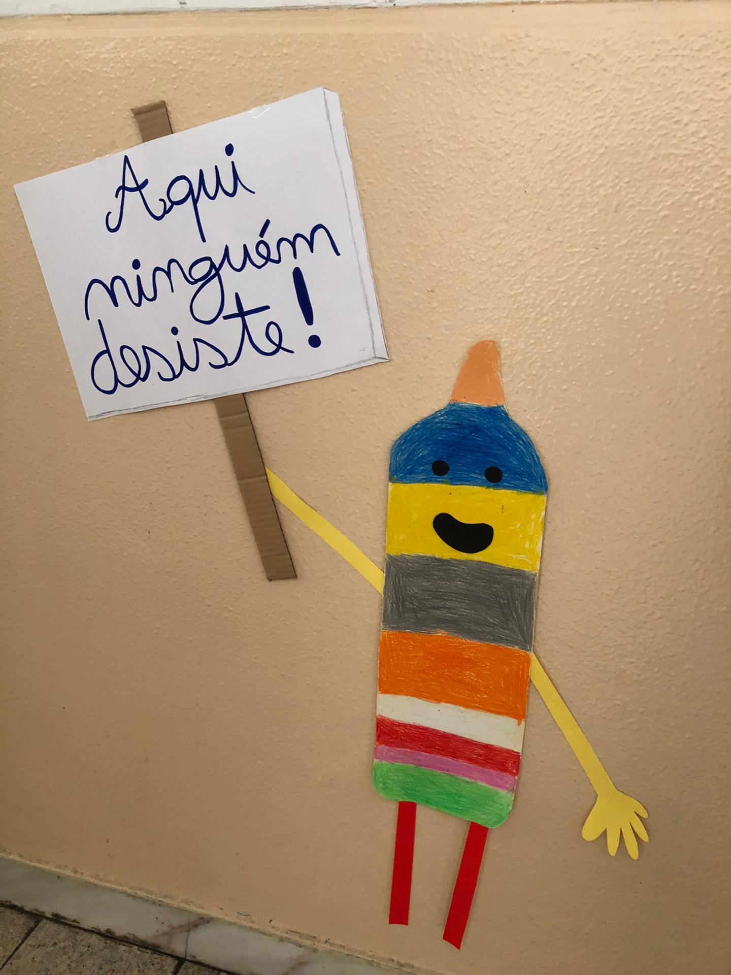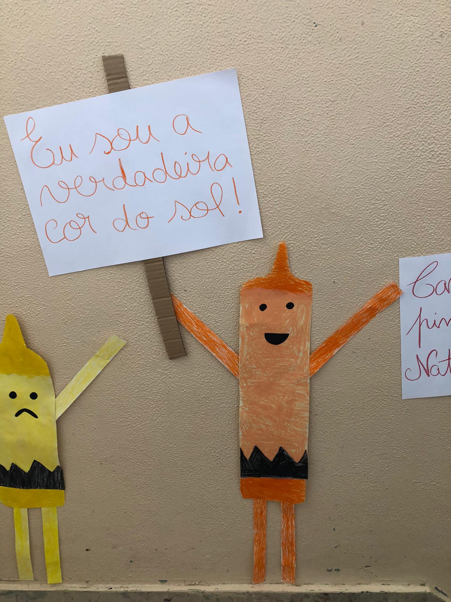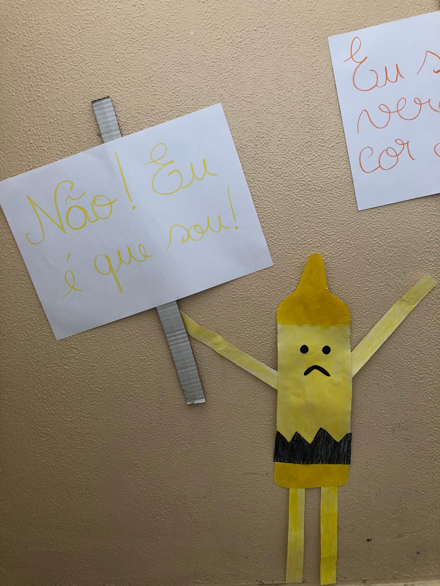 Quando nos é pedido para fazermos um desenho ou para pintar, muitos de nós usam sempre as mesmas cores ou até mesmo só uma ou duas… Para além disso, andamos a utilizar mal a cor de pêssego, pois costumávamos designa-la “cor de pele” e fomos comparar esta cor com a da nossa pele e em nada se assemelham! Assim, falámos sobre a importância de utilizarmos várias cores quando pintamos e/ou desenhamos, tendo como ponto de partida a obra “O dia em que os lápis desistiram”. Atribuímos vida às personagens do livro utilizando: lápis de cera, lápis de pastel e aguarelas para as caracterizar. Para além disso, alguns dos alunos da nossa turma utiliza, constantemente, a expressão “Desisto!” ou “Não consigo!”. Por esta razão, como não queremos ser como os lápis da história, colocámos um lápis especial à porta da nossa sala com um cartaz “Aqui ninguém desiste!”. Utilizámos os nossos trabalhos para os espalhar pela escola, com o objetivo de sensibilizar outros alunos para estas questões. |