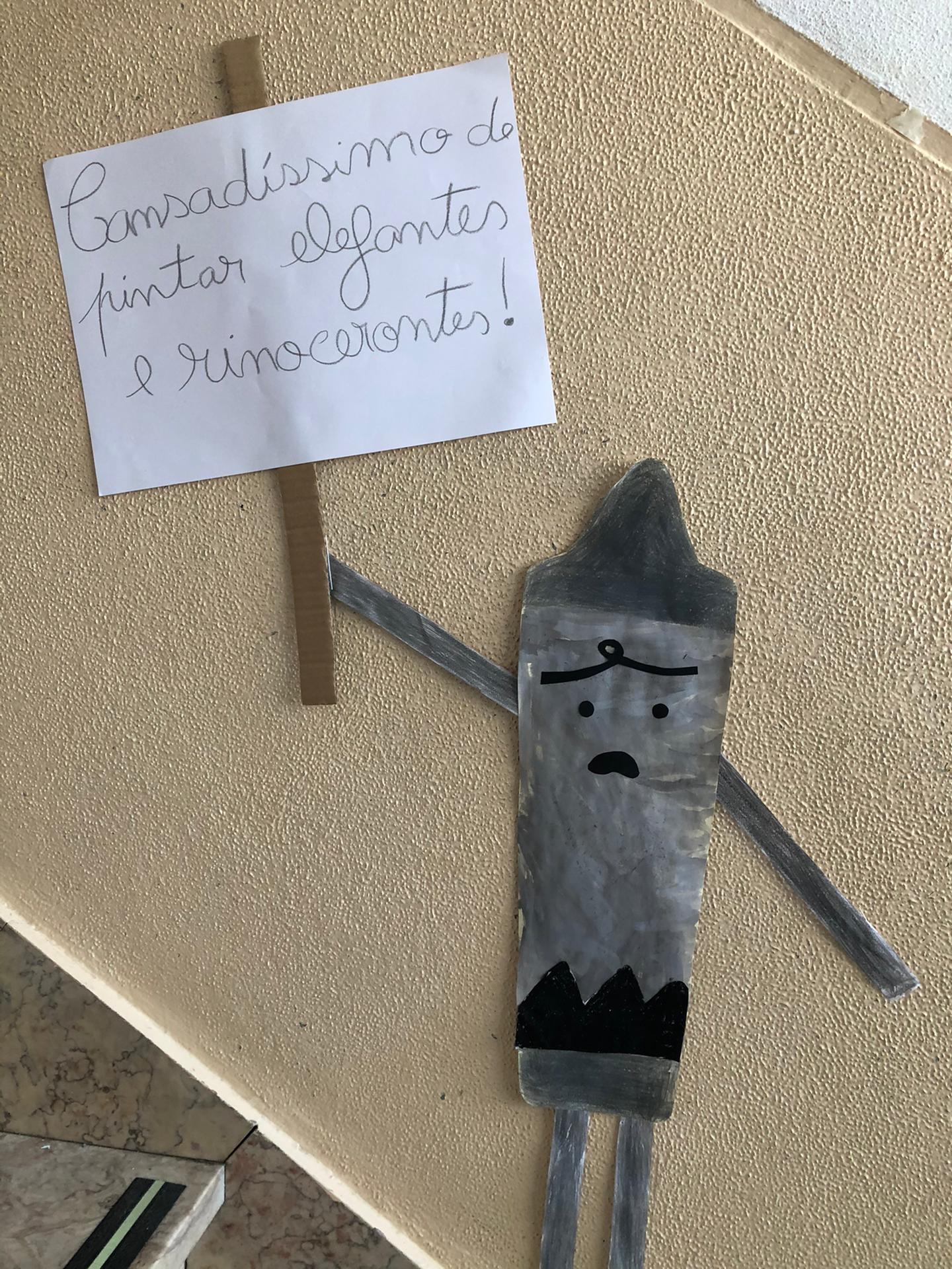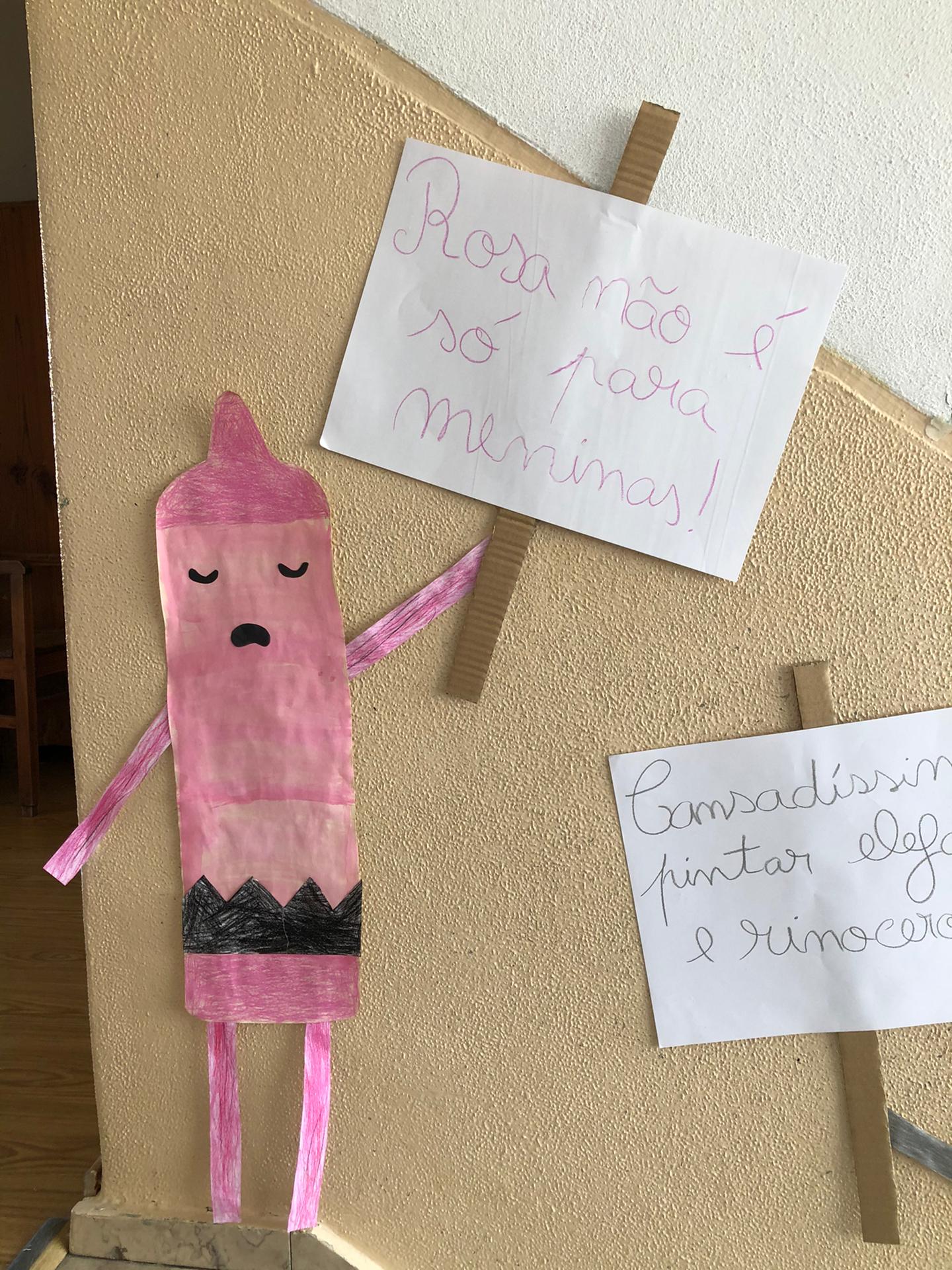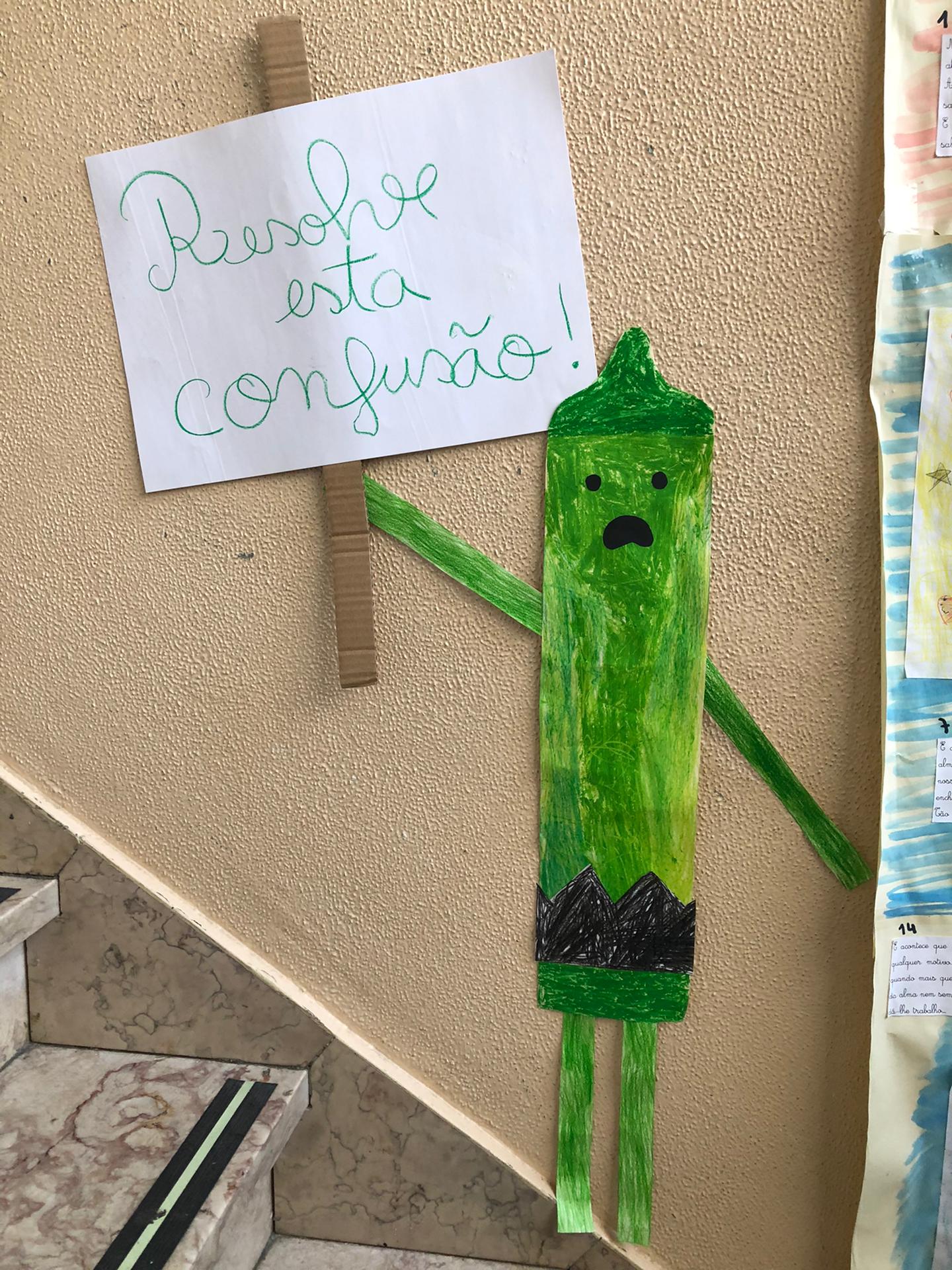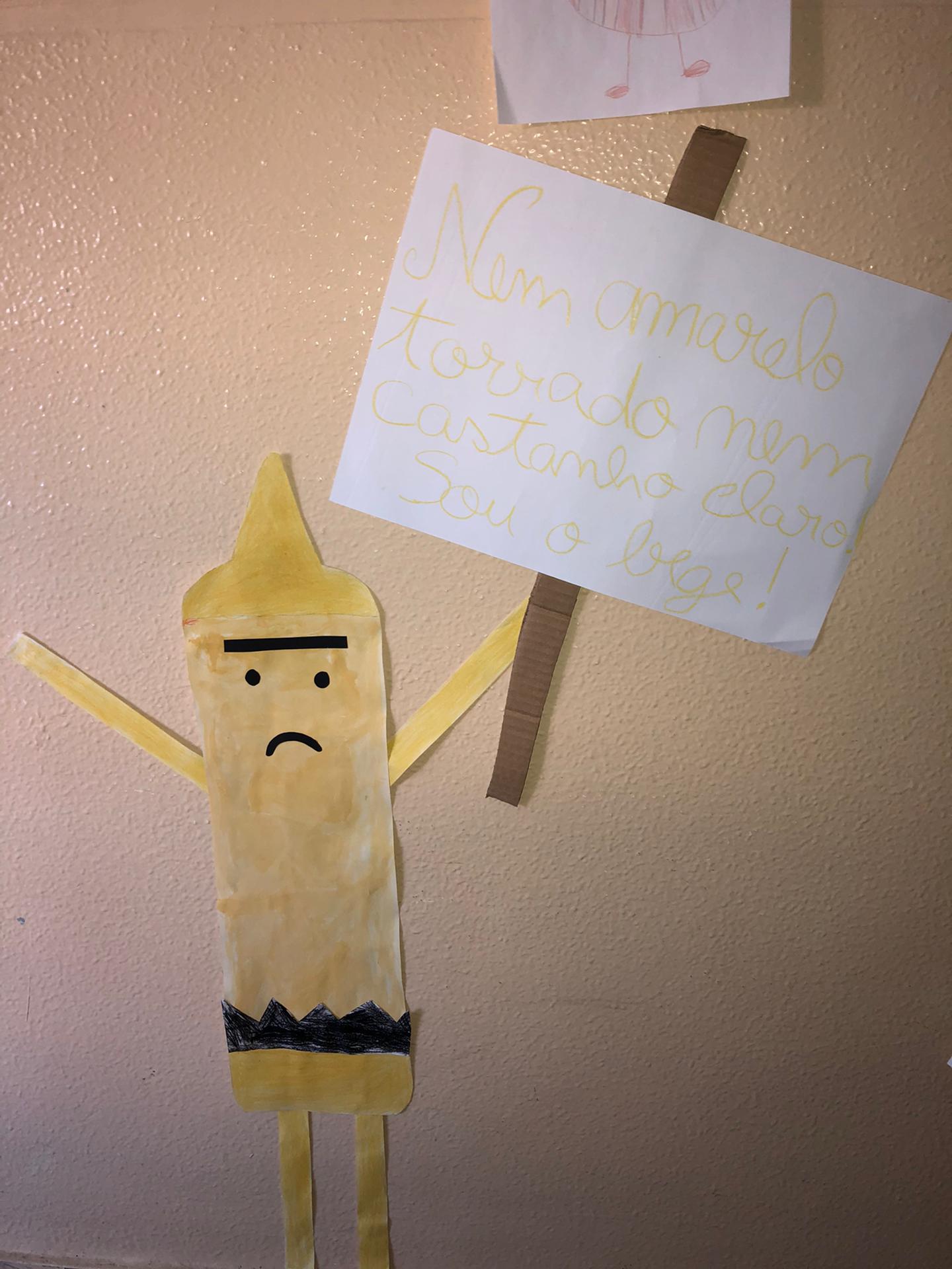 Quando nos é pedido para fazermos um desenho ou para pintar, muitos de nós usam sempre as mesmas cores ou até mesmo só uma ou duas… Para além disso, andamos a utilizar mal a cor de pêssego, pois costumávamos designa-la “cor de pele” e fomos comparar esta cor com a da nossa pele e em nada se assemelham! Assim, falámos sobre a importância de utilizarmos várias cores quando pintamos e/ou desenhamos, tendo como ponto de partida a obra “O dia em que os lápis desistiram”. Atribuímos vida às personagens do livro utilizando: lápis de cera, lápis de pastel e aguarelas para as caracterizar. Para além disso, alguns dos alunos da nossa turma utiliza, constantemente, a expressão “Desisto!” ou “Não consigo!”. Por esta razão, como não queremos ser como os lápis da história, colocámos um lápis especial à porta da nossa sala com um cartaz “Aqui ninguém desiste!”. Utilizámos os nossos trabalhos para os espalhar pela escola, com o objetivo de sensibilizar outros alunos para estas questões. |