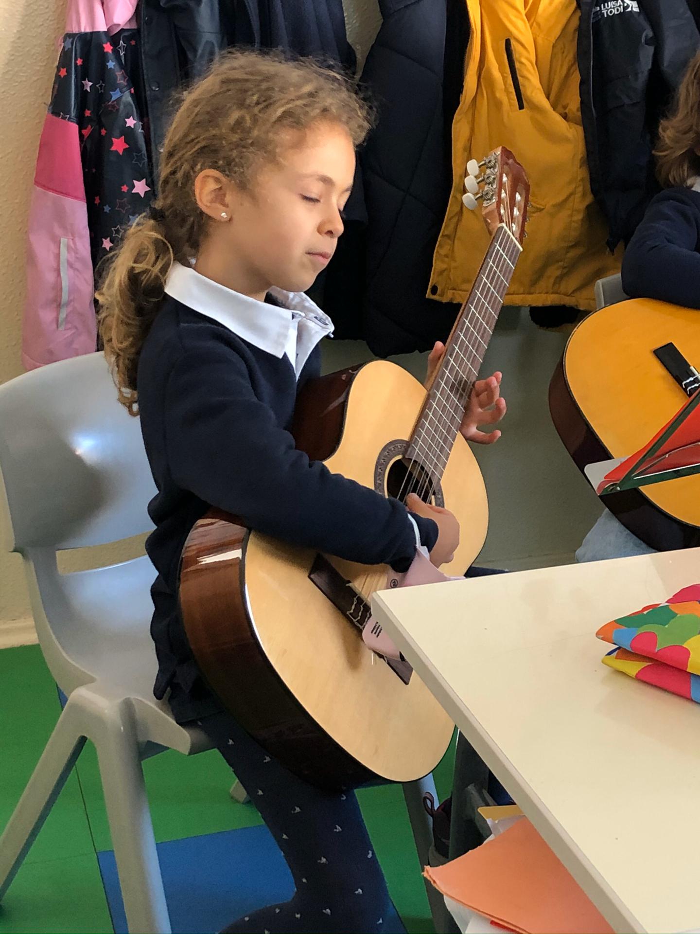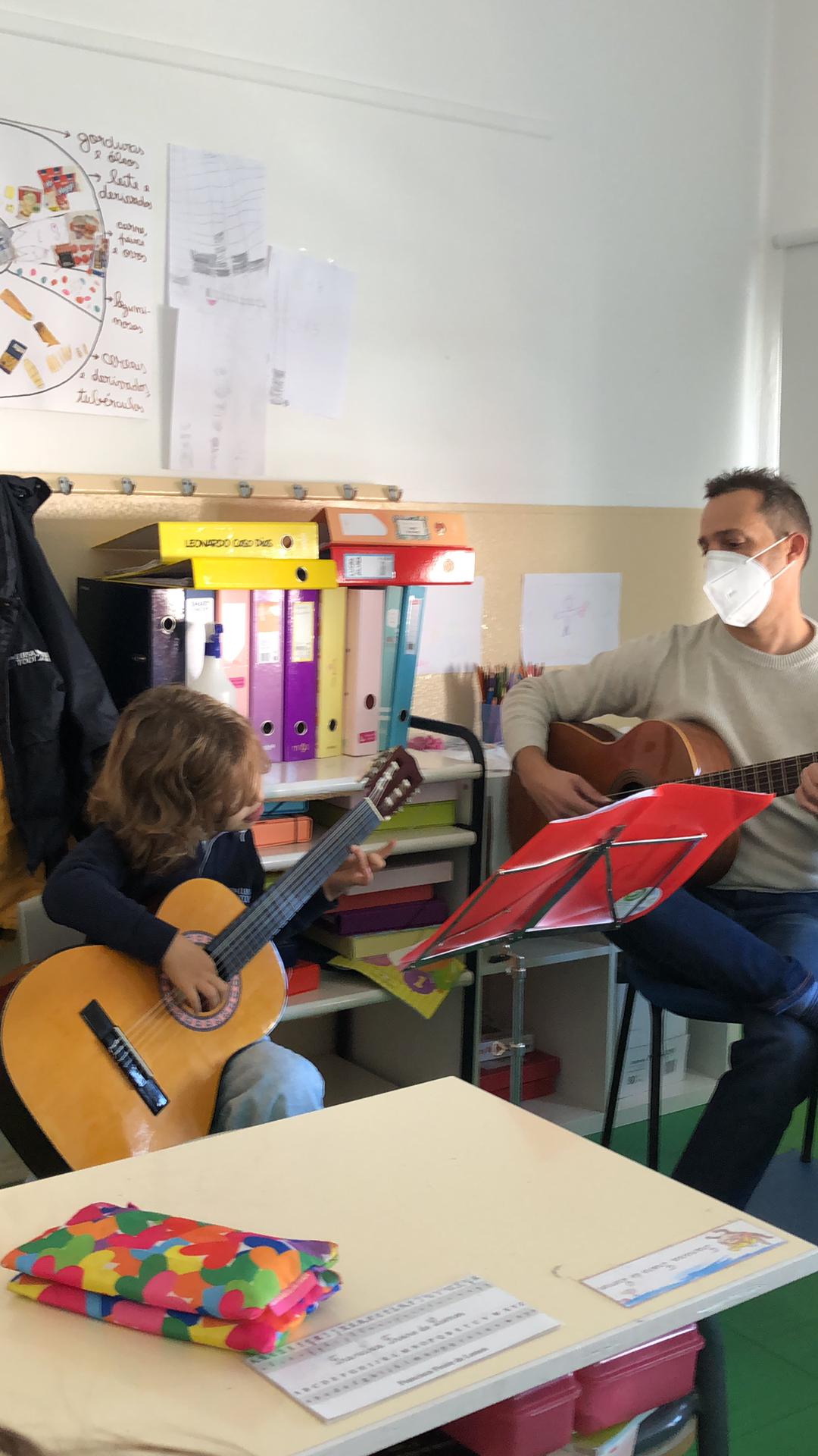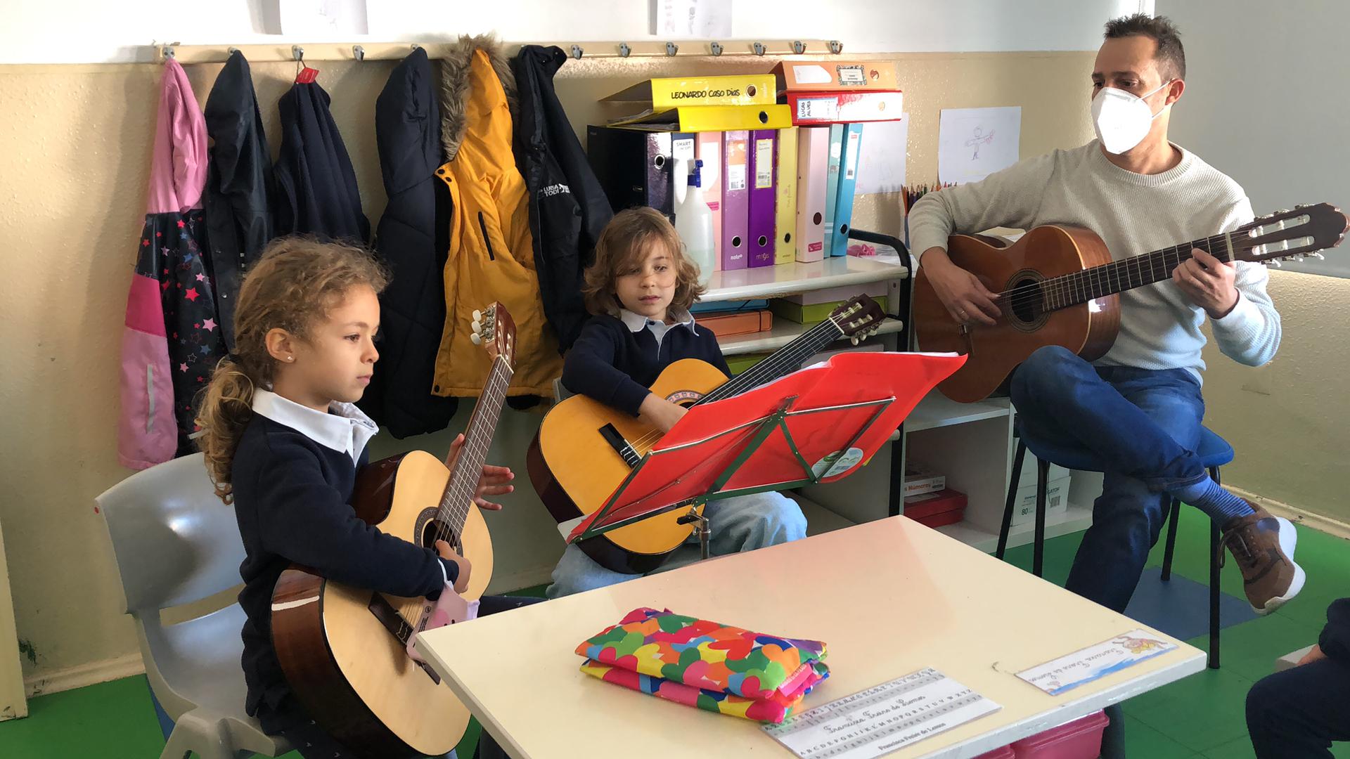 Recebemos a visita do professor de guitarra que chegou acompanhado com as alunas Francisca Lemos e Matilde Sobral, alunas da nossa turma. Falaram-nos das designações dos dedos para tocar guitarra e quais os respetivos números. Por fim, cada um deles, acompanhado da sua guitarra, presenteou-nos com uma apresentação. |