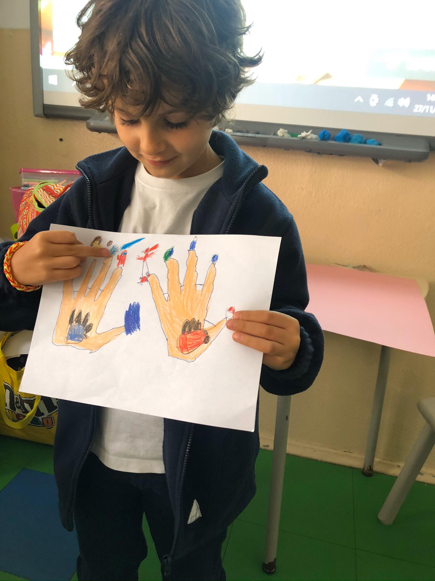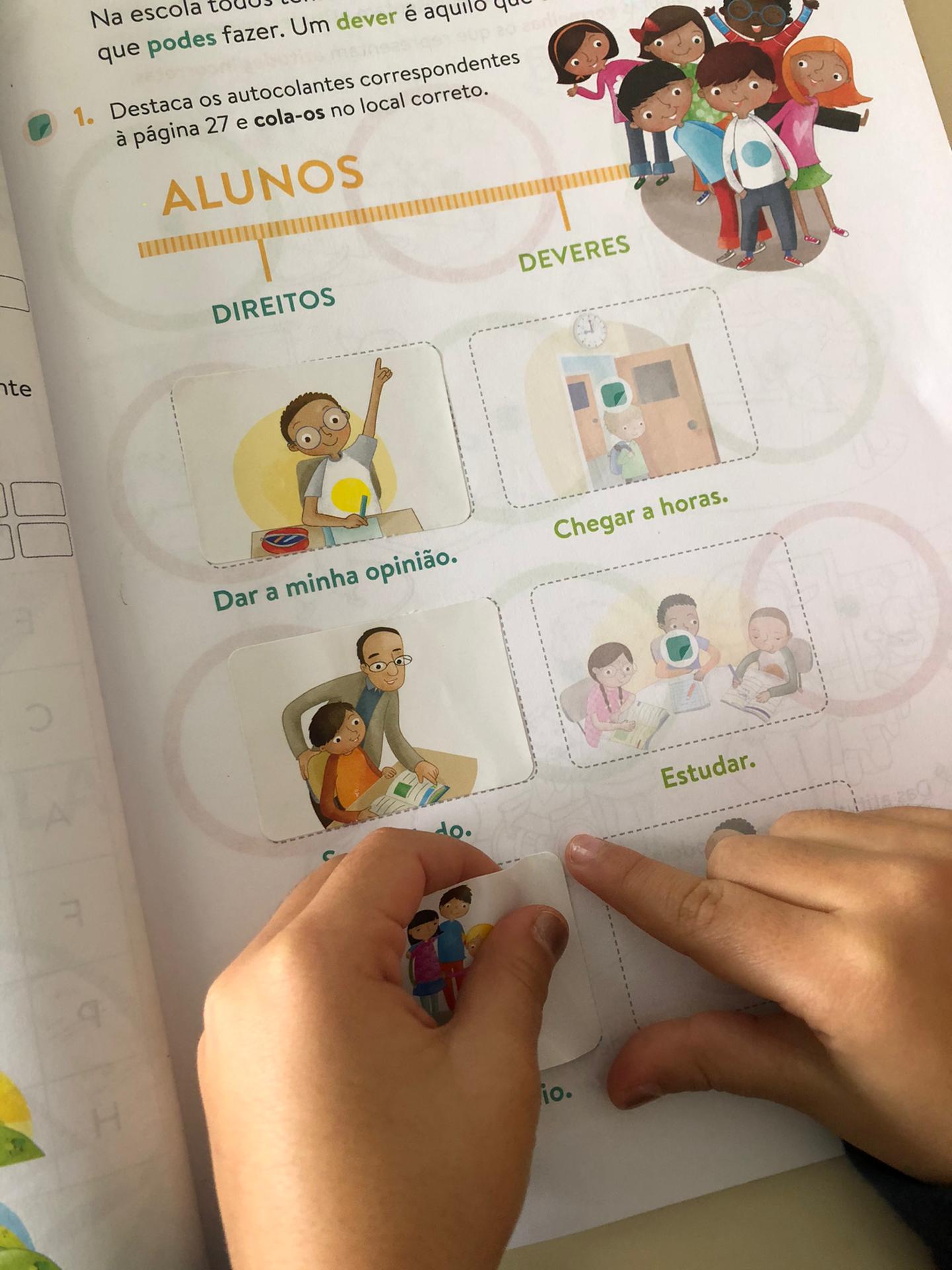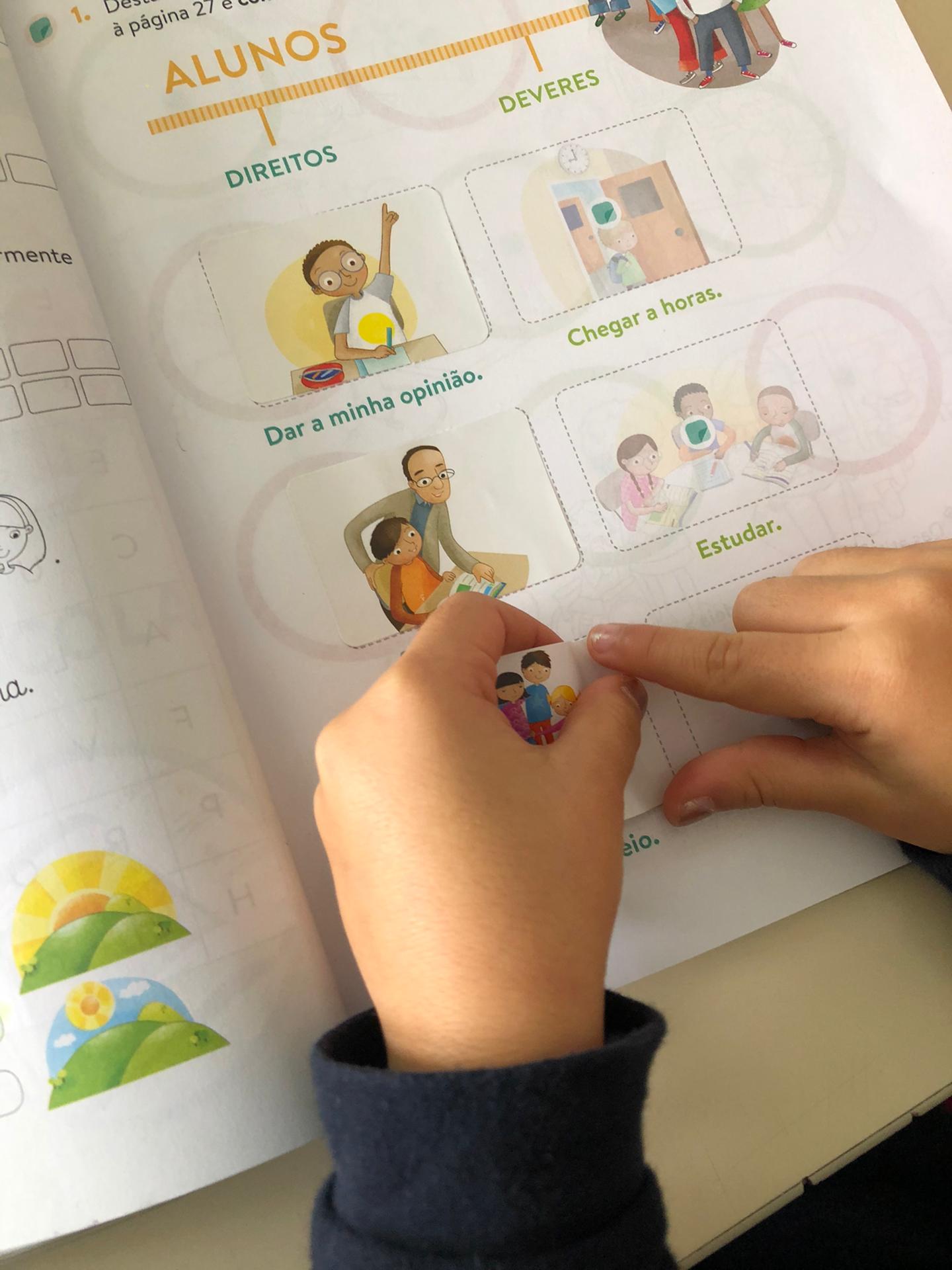 Tendo como ponto de partida a história da semana, distinguimos a mão esquerda da mão direita e falámos sobre a designação que é dada a cada dedo (polegar, indicador, …). Fizemos uma chuva de ideias – O que são os direitos dos alunos? E os deveres? |