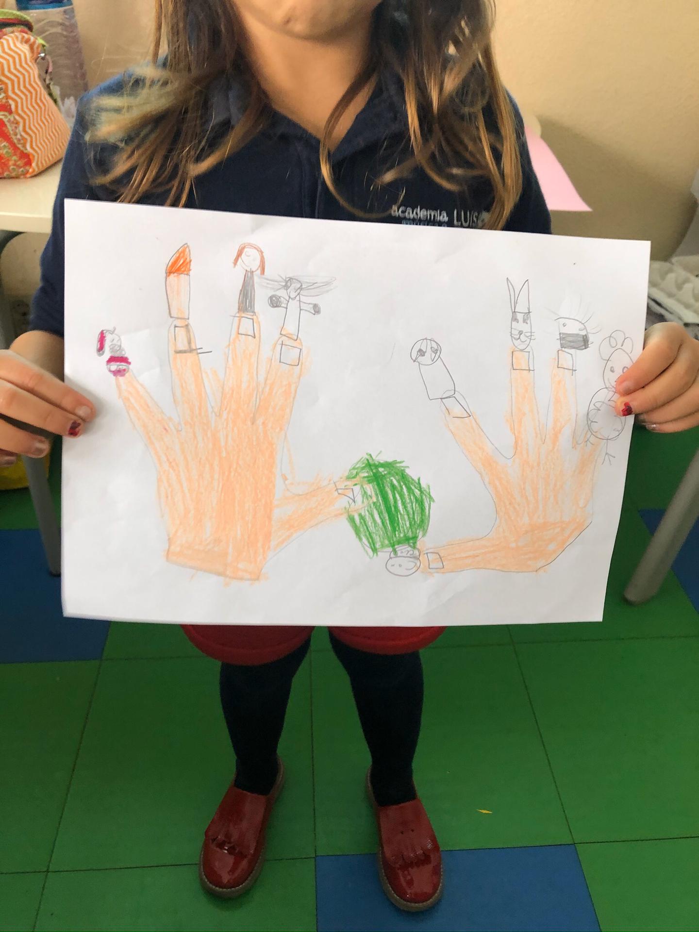 Introduzimos a consoante “d” com a obra “Dez dedos dez segredos” de Maria Alberta Meneres. Esta é uma obra que nos presenteia com dez histórias, cinco contadas por cada dedo da mão esquerda e outras cinco pelos dedos da mão direita. Durante a semana, criámos o lema: “Duas histórias por dia, não sabes o bem que te fazia!” e tivemos o prazer de receber, na nossa sala, dois mini convidados (fantoches de dedo) que nos vieram contar a sua história. Para testarmos a nossa atenção, em relação à história, realizámos uma ficha de compreensão leitora. Para além disso, com os desenhos realizados em Belas Artes, cada um de nós fez uma apresentação à turma. |
