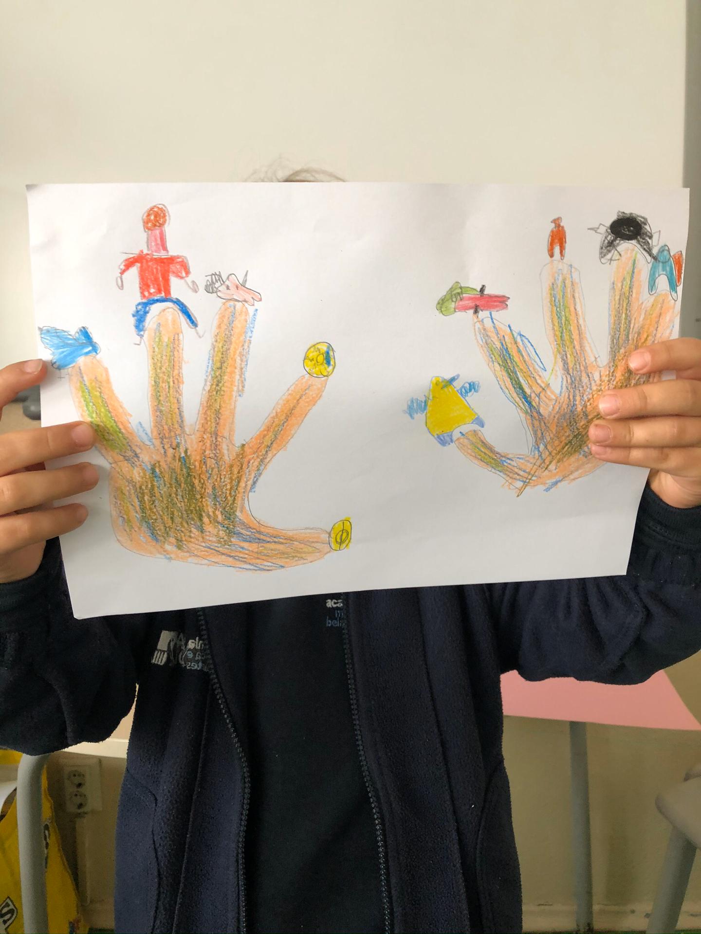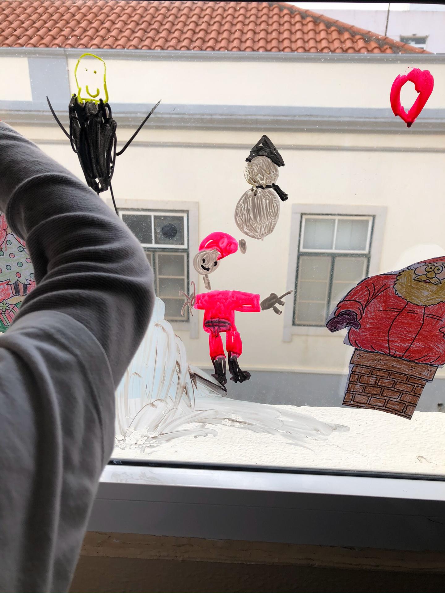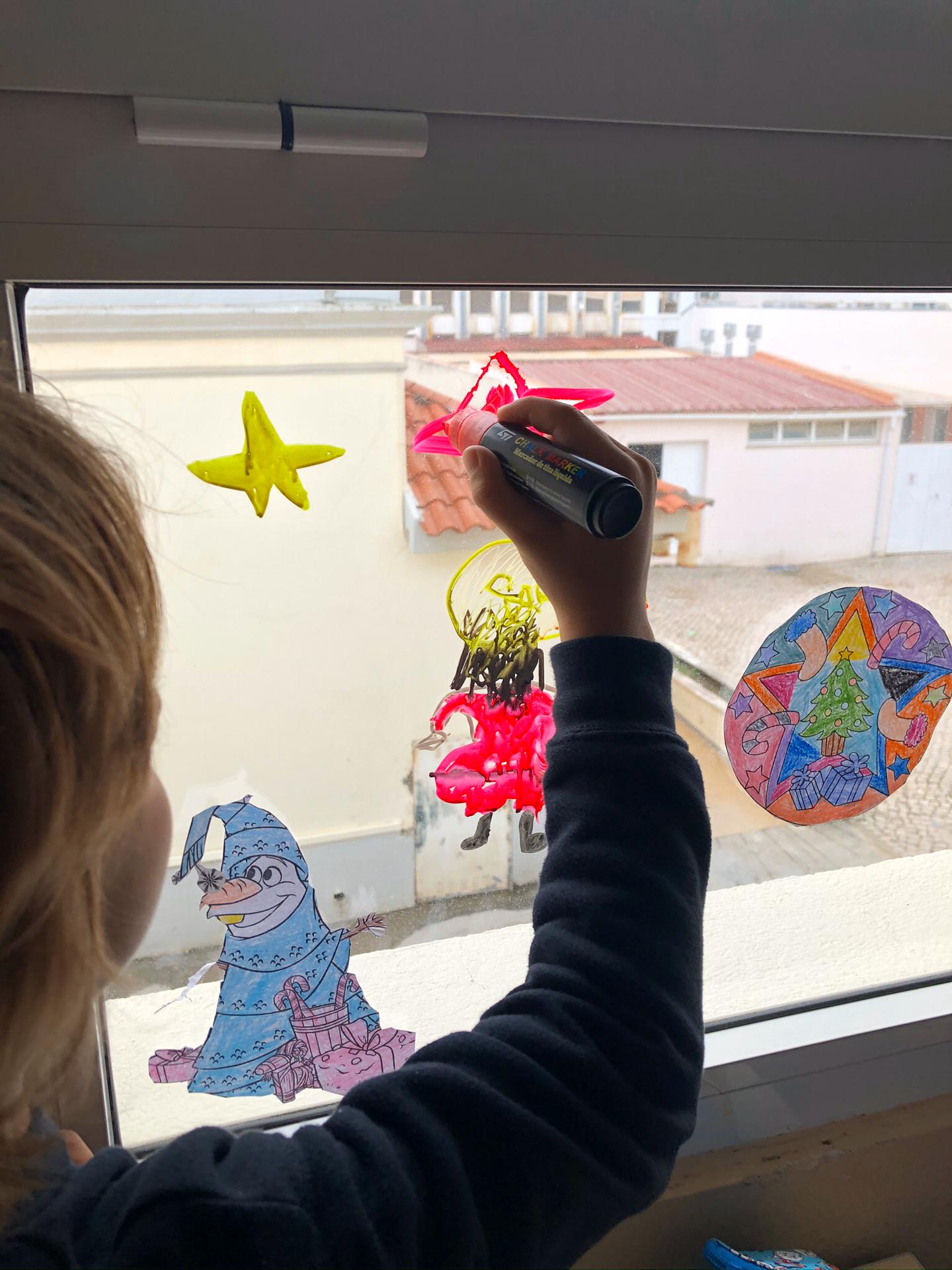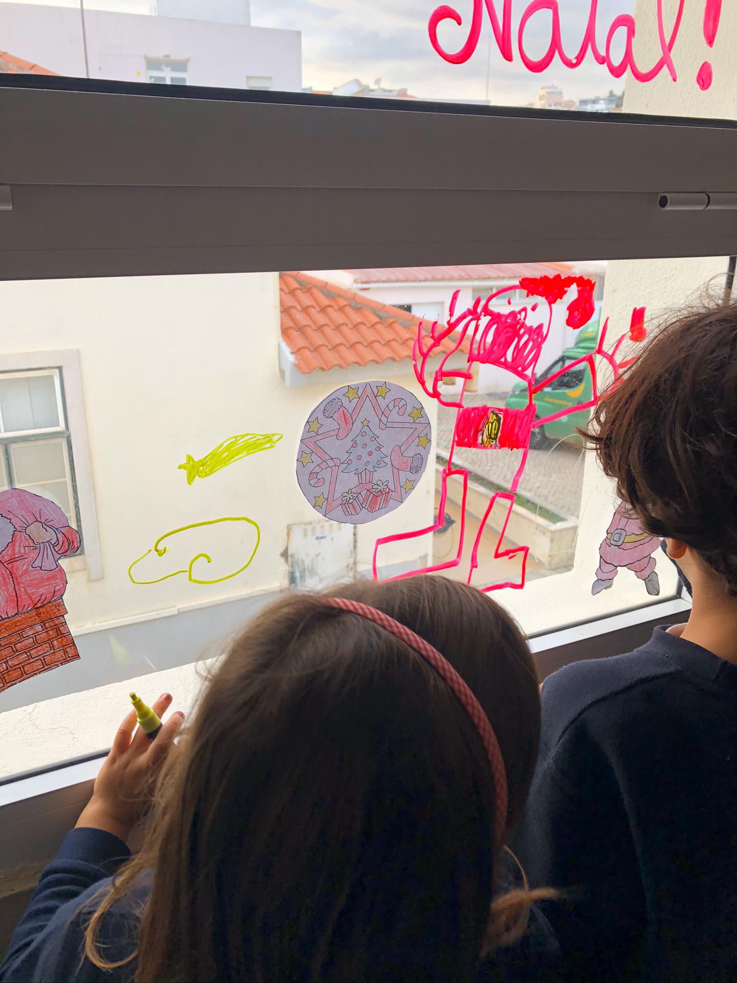 Depois de conhecermos a livro “Dez dedos dez segredos” contornámos as nossas próprias mãos, utilizando um lápis e uma folha, e criámos uma personagem para cada um dos nossos dedos. Como o Natal está a aproximar-se, pensámos em várias ilustrações caraterísticas do Natal e desenhámos nas janelas da nossa sala, utilizando canetas de tinta de água. Aproveitámos também para começar a construir a nossa árvore de Natal (utilizámos garrafas de água vazias, tampas, cartões de cerais, …) |
