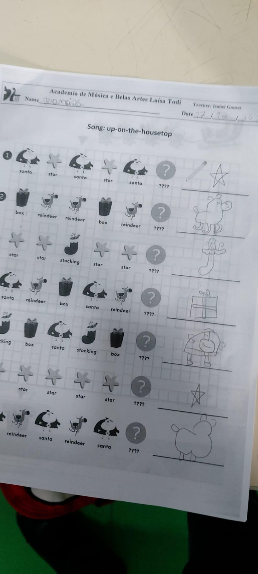 Introduzimos a letra “m” apartir de uma canção do alfabeto e como o Natal está a chegar, introduzimos esta temática com a expressão “Merry Christmas”. Por fim, ouvimos a canção “Up on the house top”. |