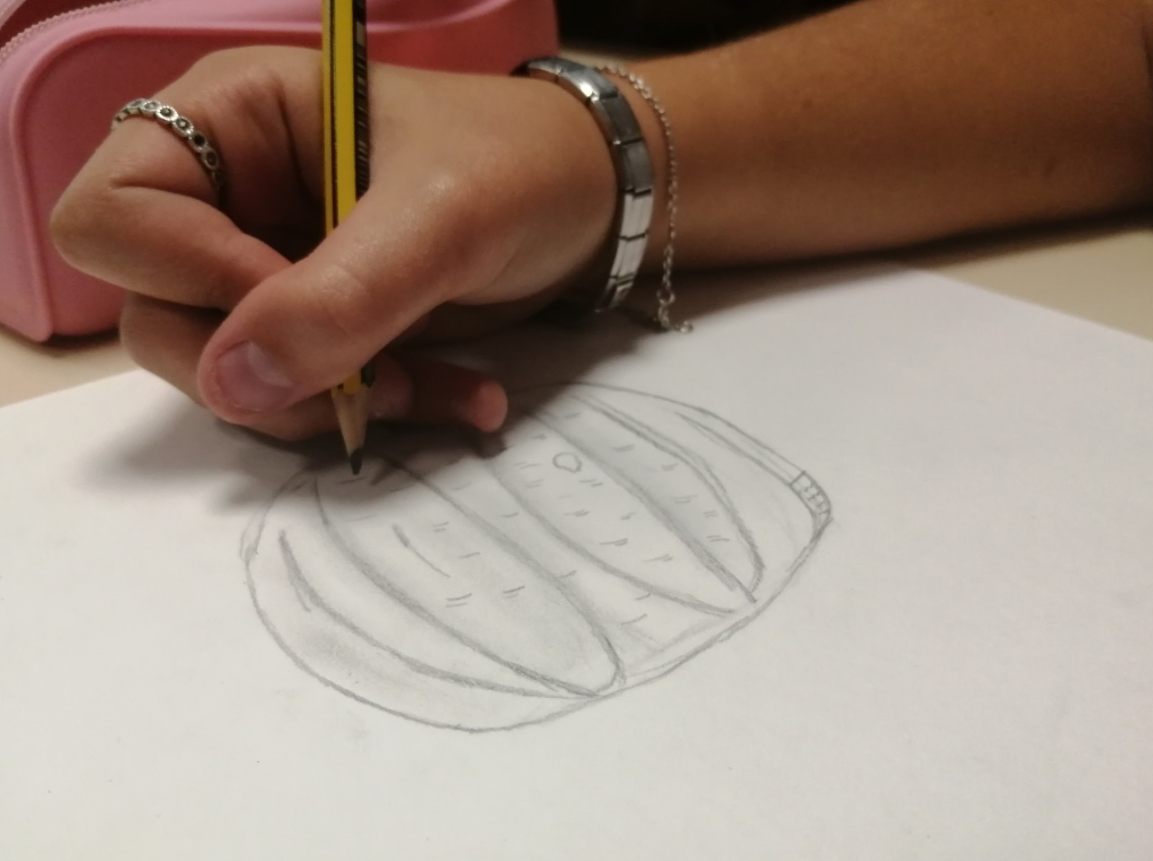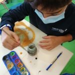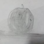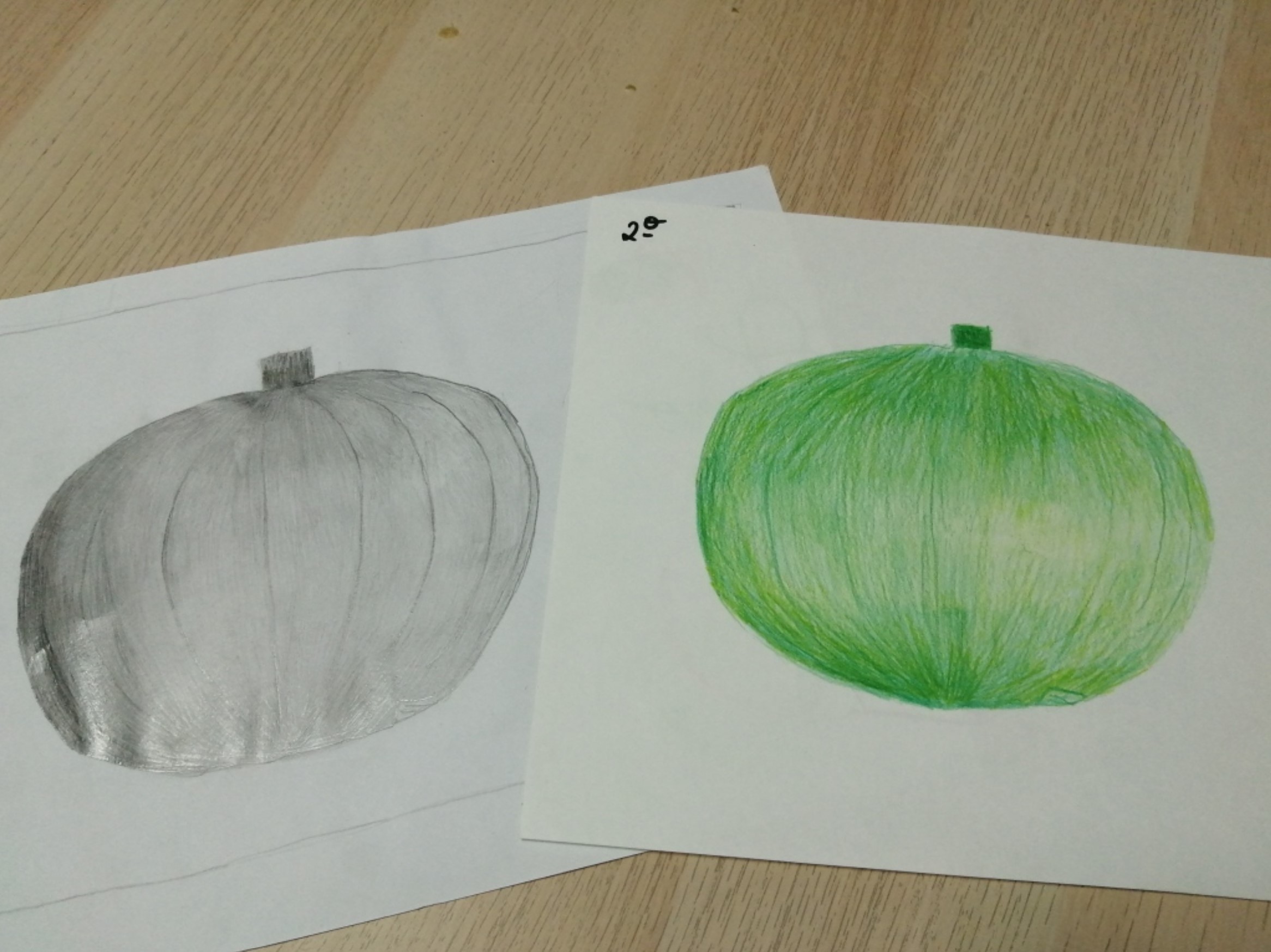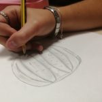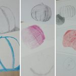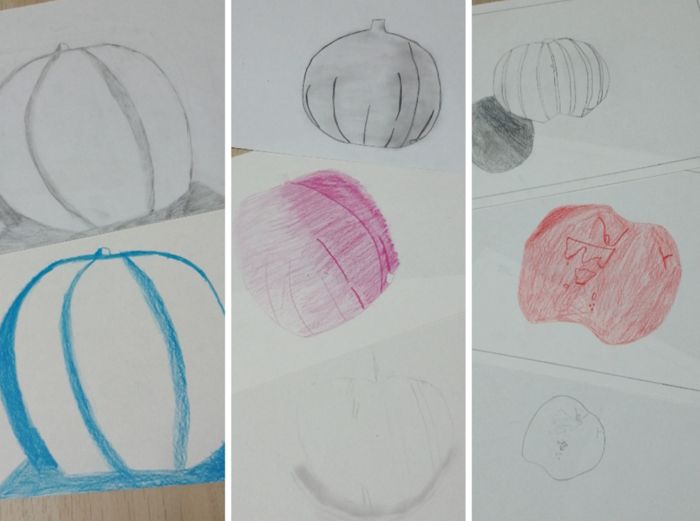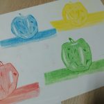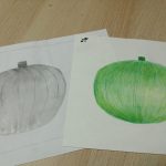 Educação Visual – Realização de desenhos à vista de alimentos com diversos materiais riscadores. De acordo com o tema de Halloween, foi feito um desenho à vista de uma abóbora com a utilização da noção de tridimensionalidade. Com o material riscador Lápis de Cor, foi feita a reprodução do referido desenho para trabalhar a bidimensionalidade.