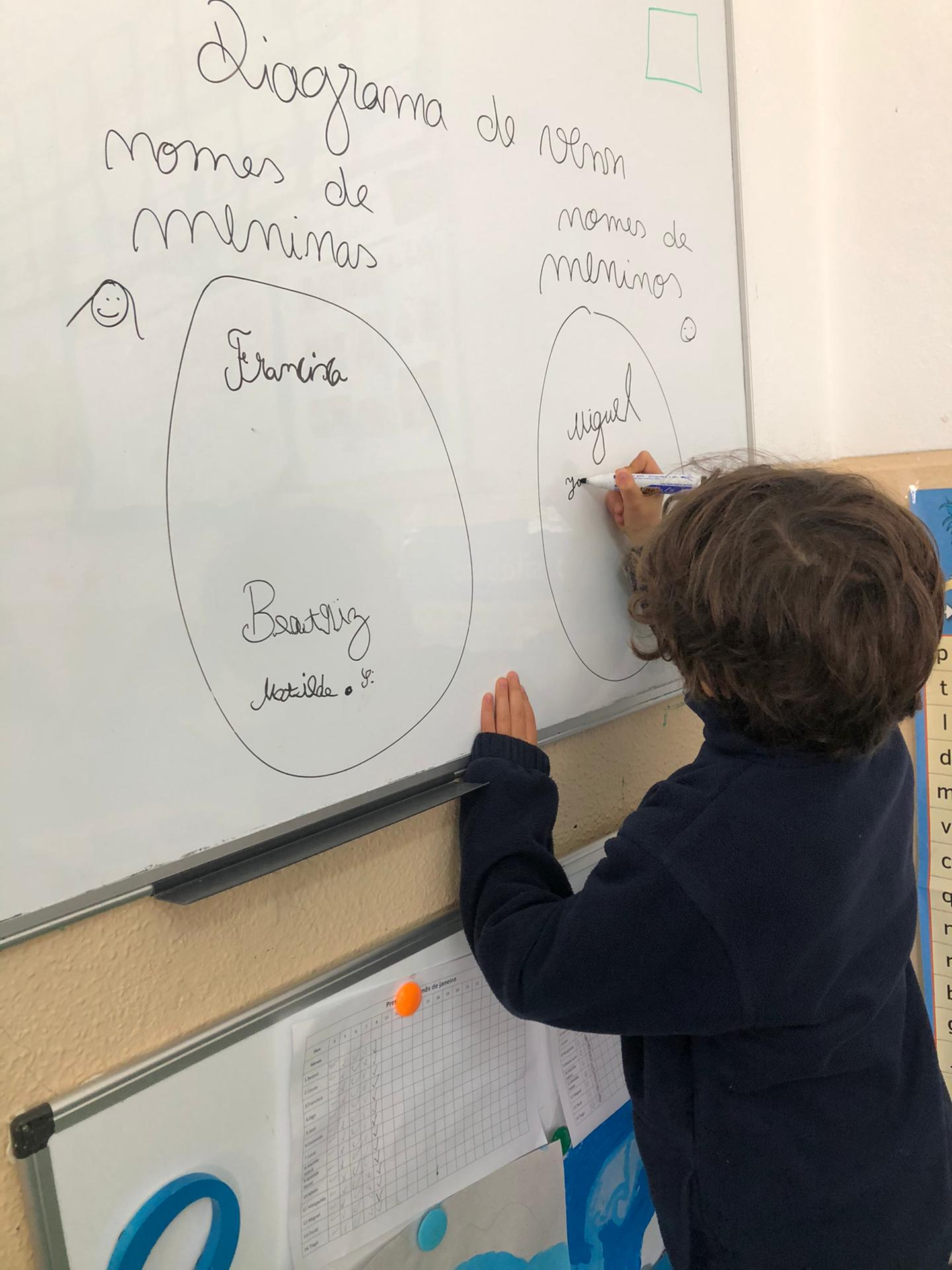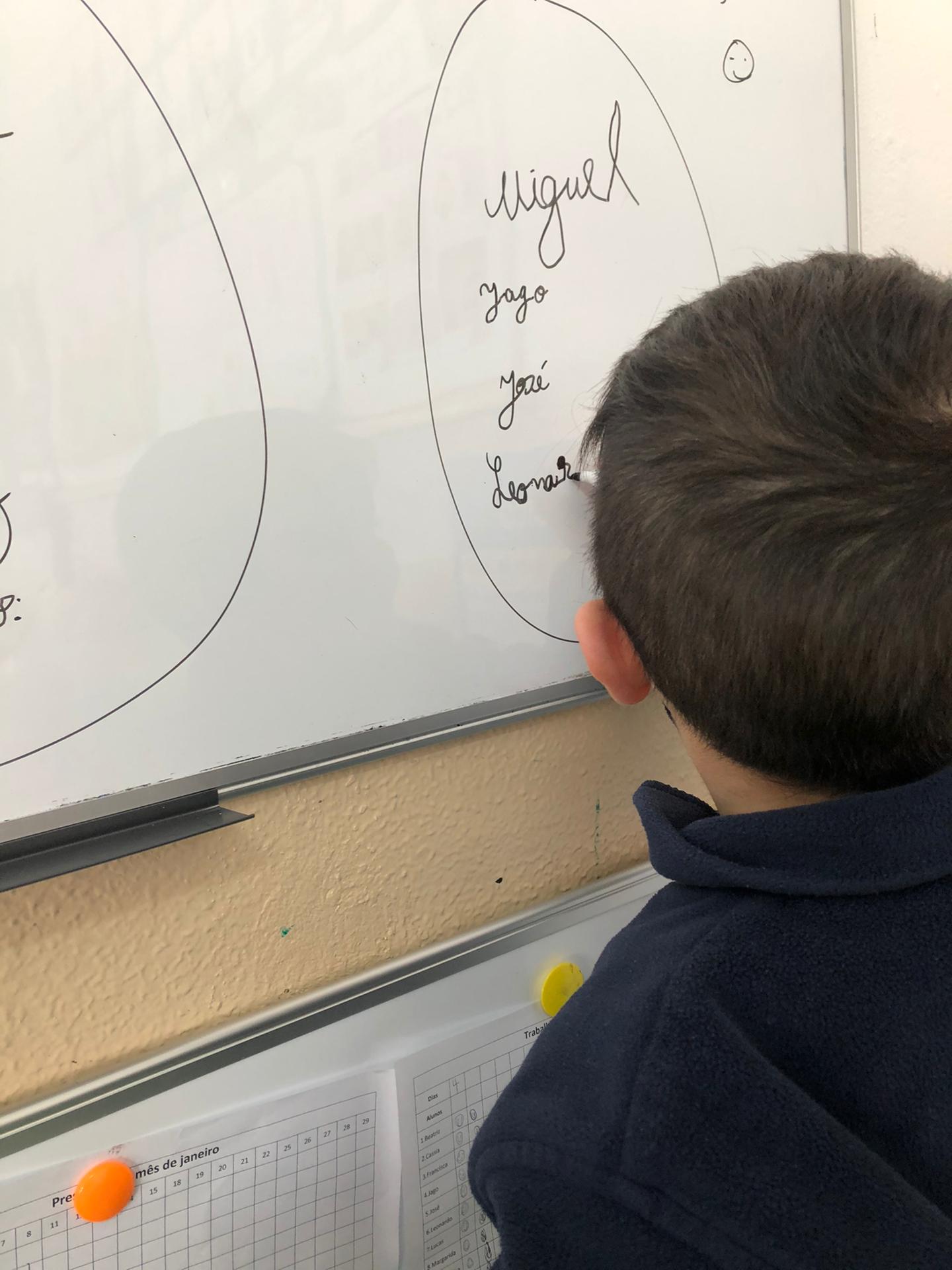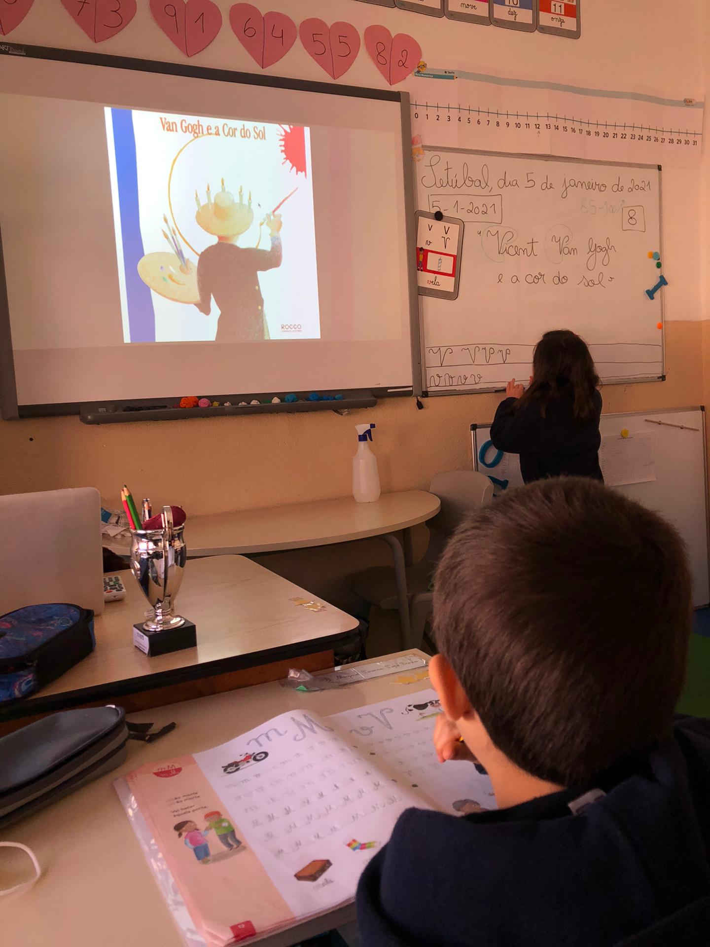 Esta semana introduzimos a consoante “v” com a obra “Vicent Van Gogh e a cor do Sol” de Caulos (Luís Carlos Coutinho). A partir do nome próprio do pintor, Vicent, descobrimos outros nomes próprios, mas em português, começados pela letra “V” e, posteriormente, fomos à procura de nomes que rimassem uns com os outros (por exemplo: Viviana rima com Diana). Para além disso, utilizámos palavras conhecidas para substituirmos determinada sílaba para escrever uma nova palavra (por exemplo: na palavra “mala” substituímos a sílaba “ma” por “ve” e descobrimos a palavra “vela”). |
