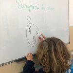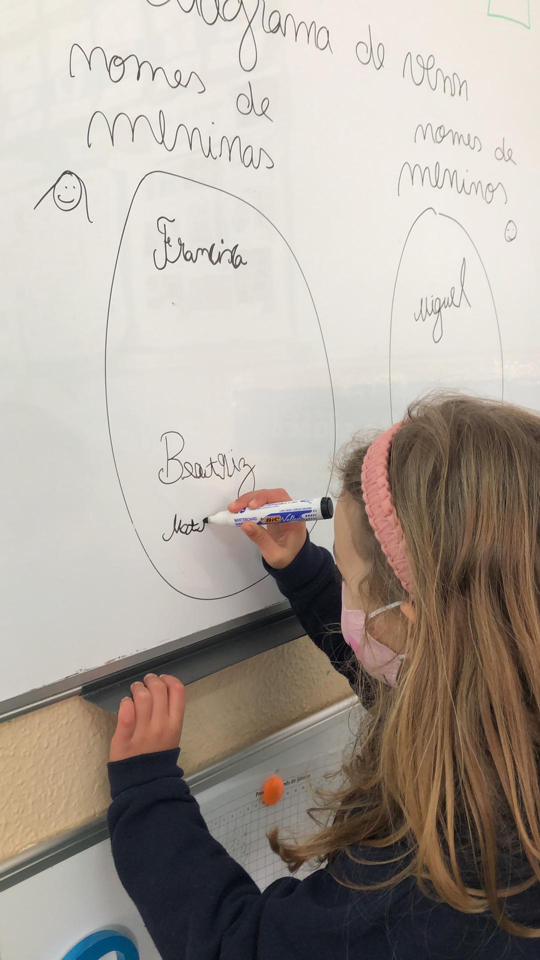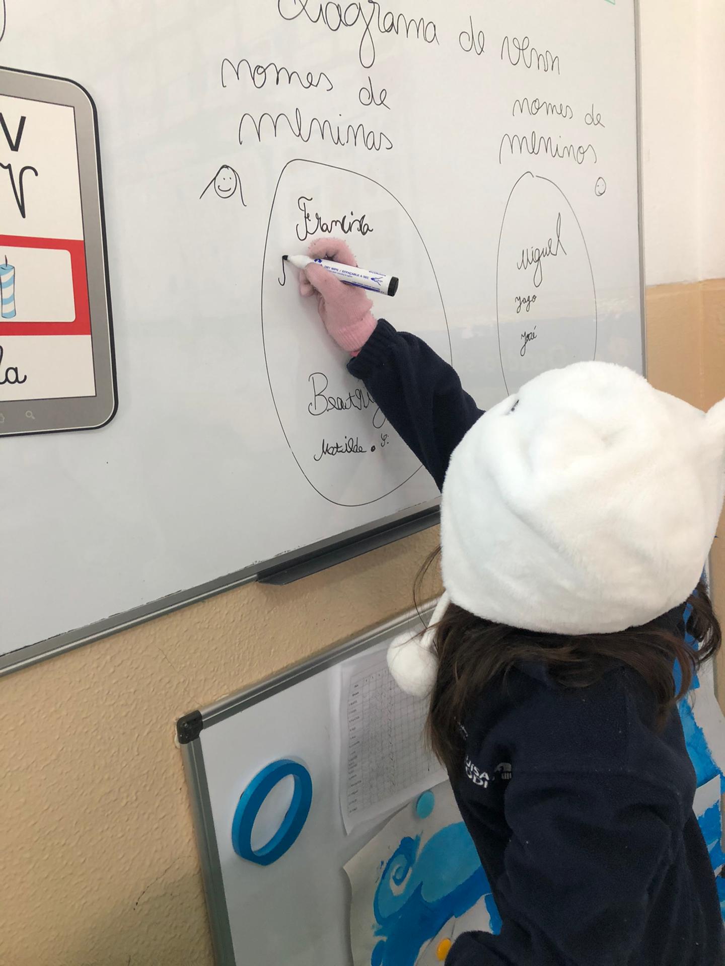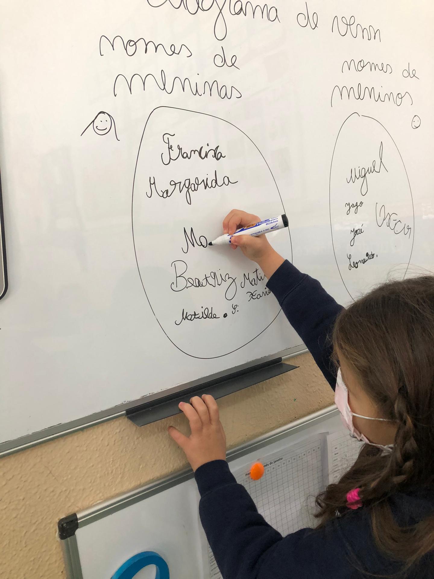 Esta semana introduzimos a consoante “v” com a obra “Vicent Van Gogh e a cor do Sol” de Caulos (Luís Carlos Coutinho). A partir do nome próprio do pintor, Vicent, descobrimos outros nomes próprios, mas em português, começados pela letra “V” e, posteriormente, fomos à procura de nomes que rimassem uns com os outros (por exemplo: Viviana rima com Diana). Para além disso, utilizámos palavras conhecidas para substituirmos determinada sílaba para escrever uma nova palavra (por exemplo: na palavra “mala” substituímos a sílaba “ma” por “ve” e descobrimos a palavra “vela”). |