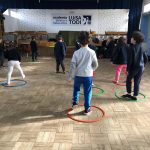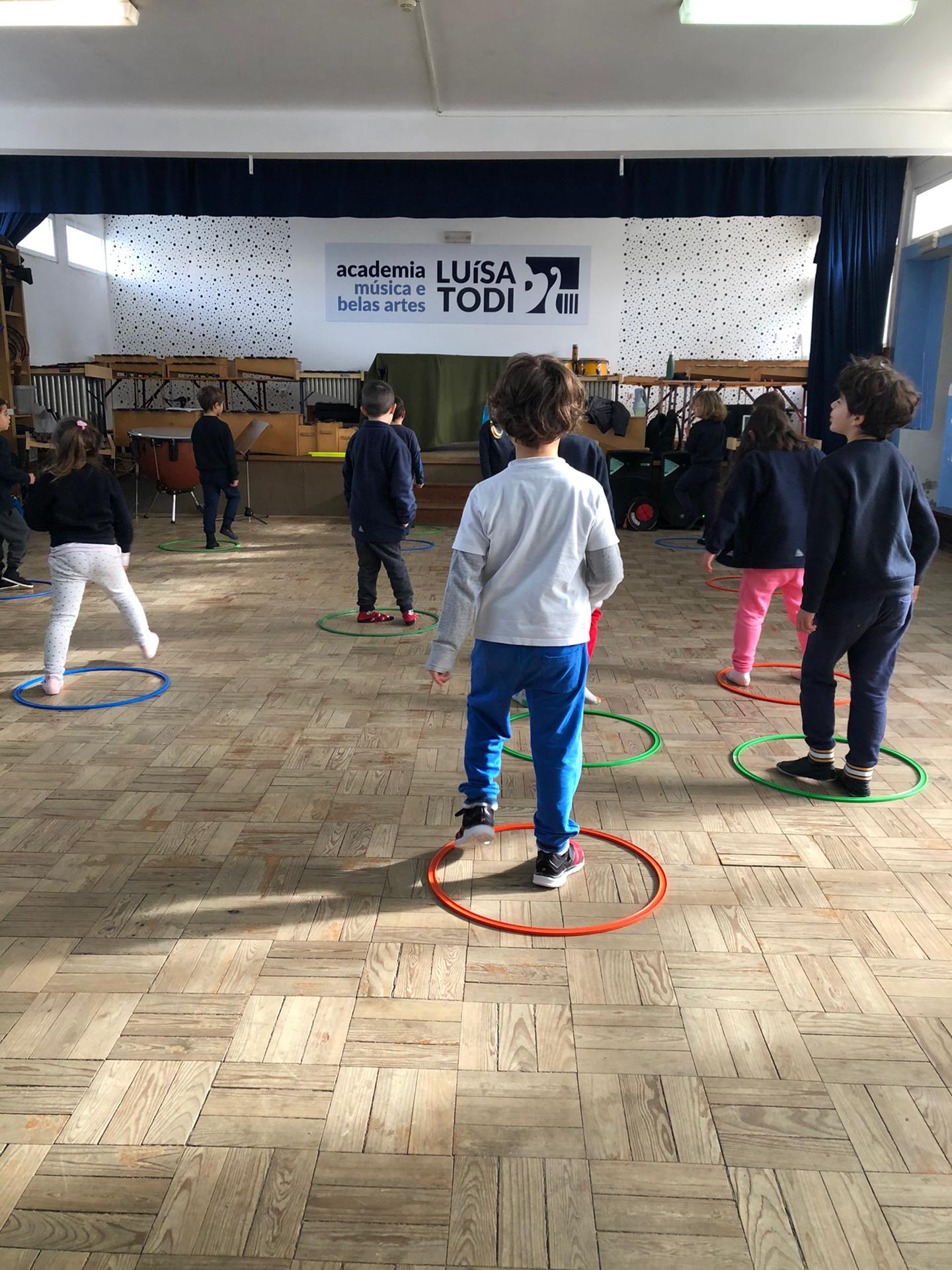 Aprendemos uma coreografia simples da música “Jerusalema” realizando passos de dança em “v” à frente e atrás. |