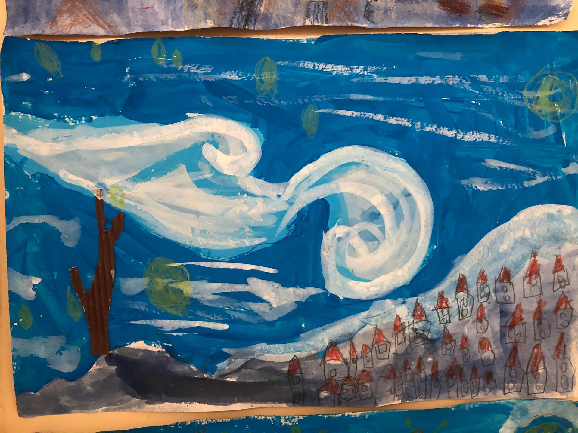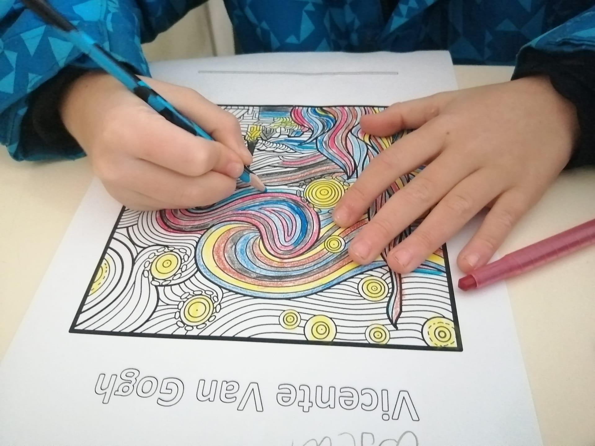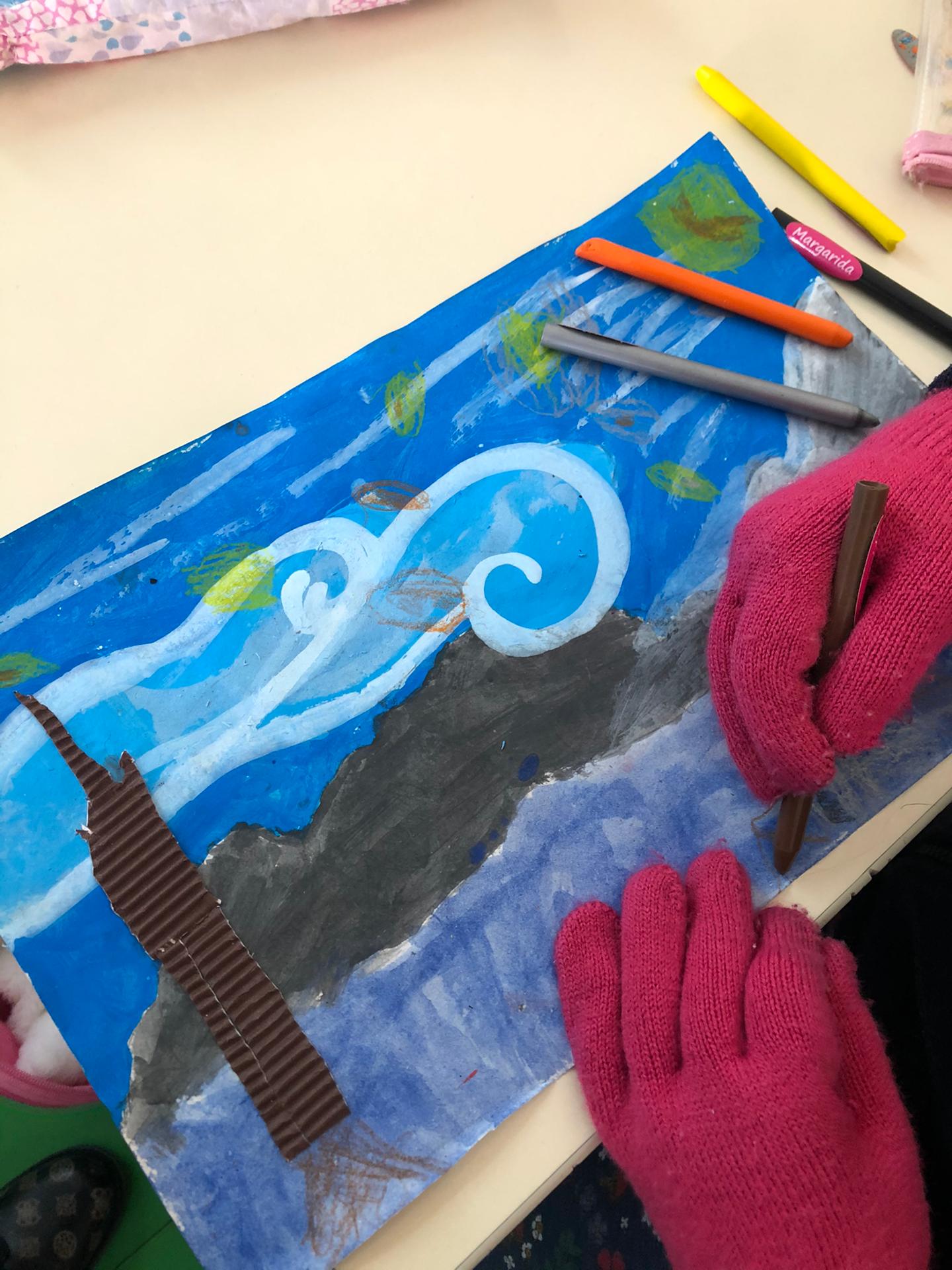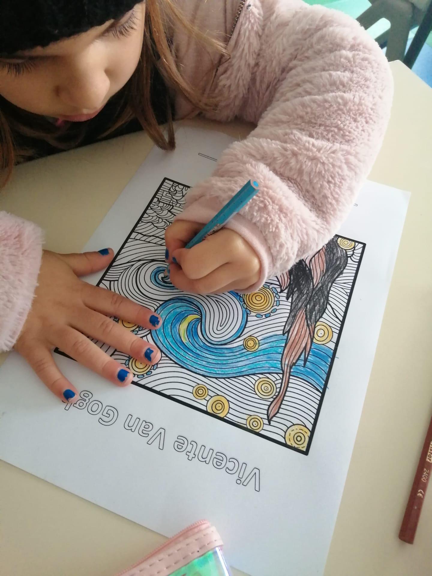 Pintámos um desenho, com lápis de cor, inspirado na obra “A noite estrelada” de Van Gogh. |