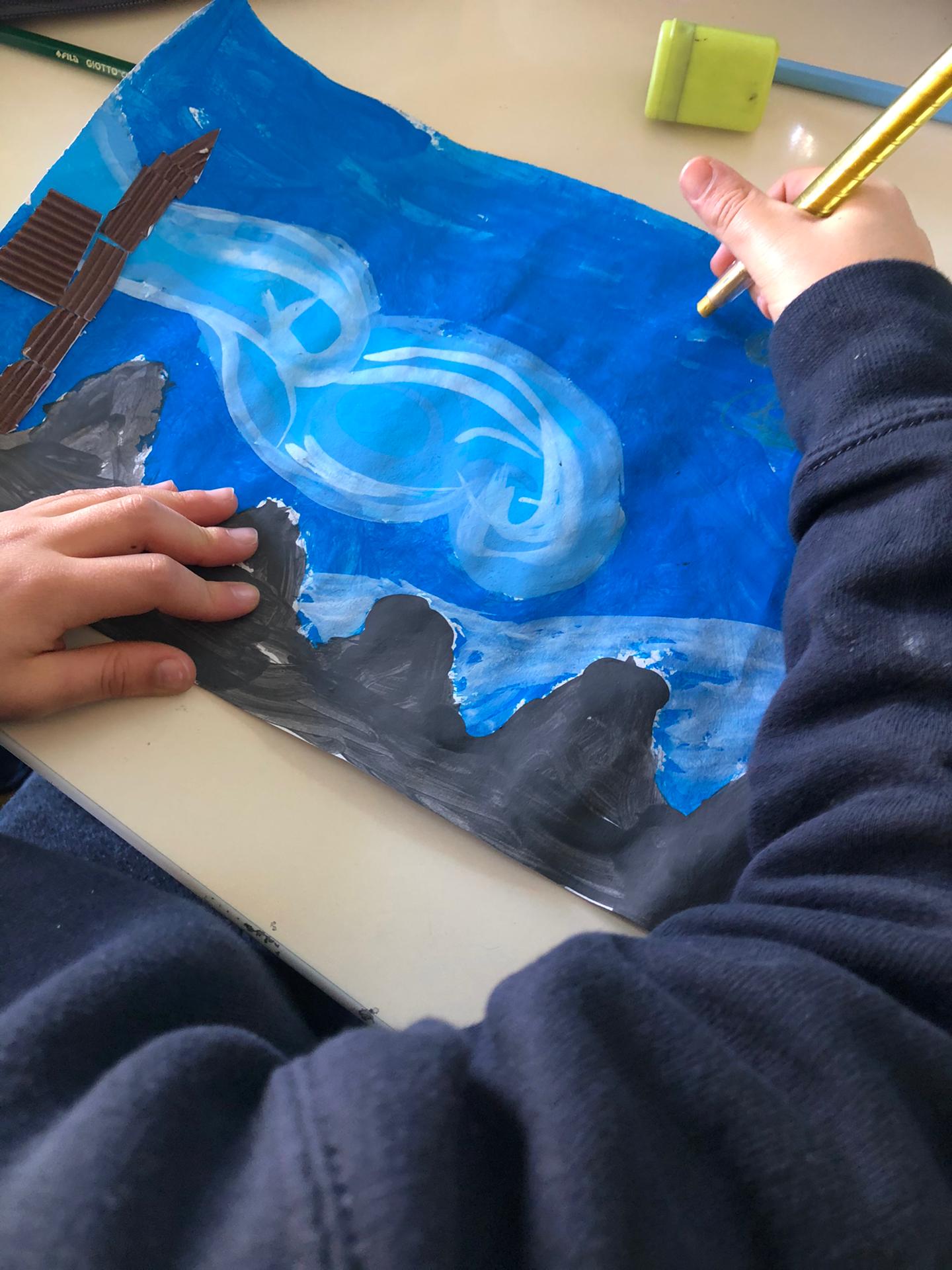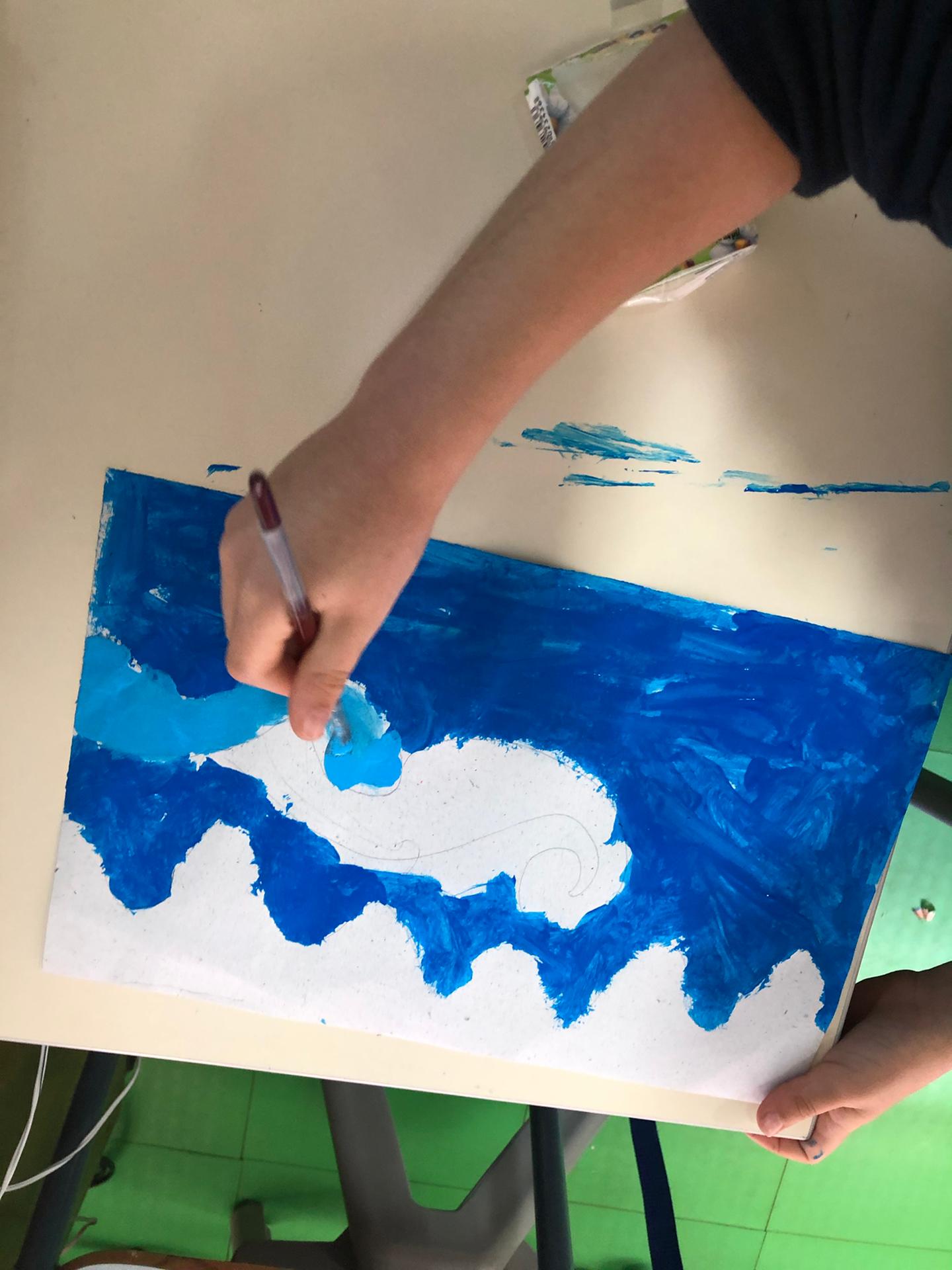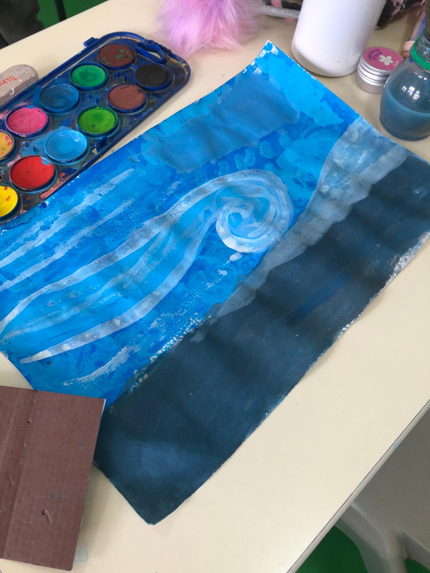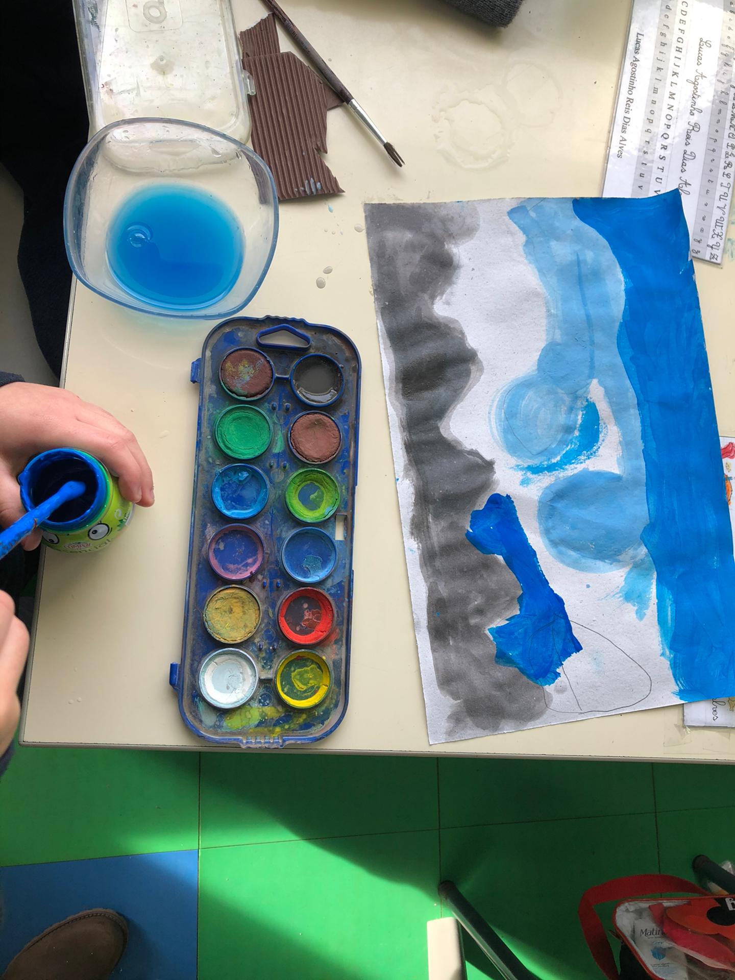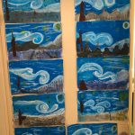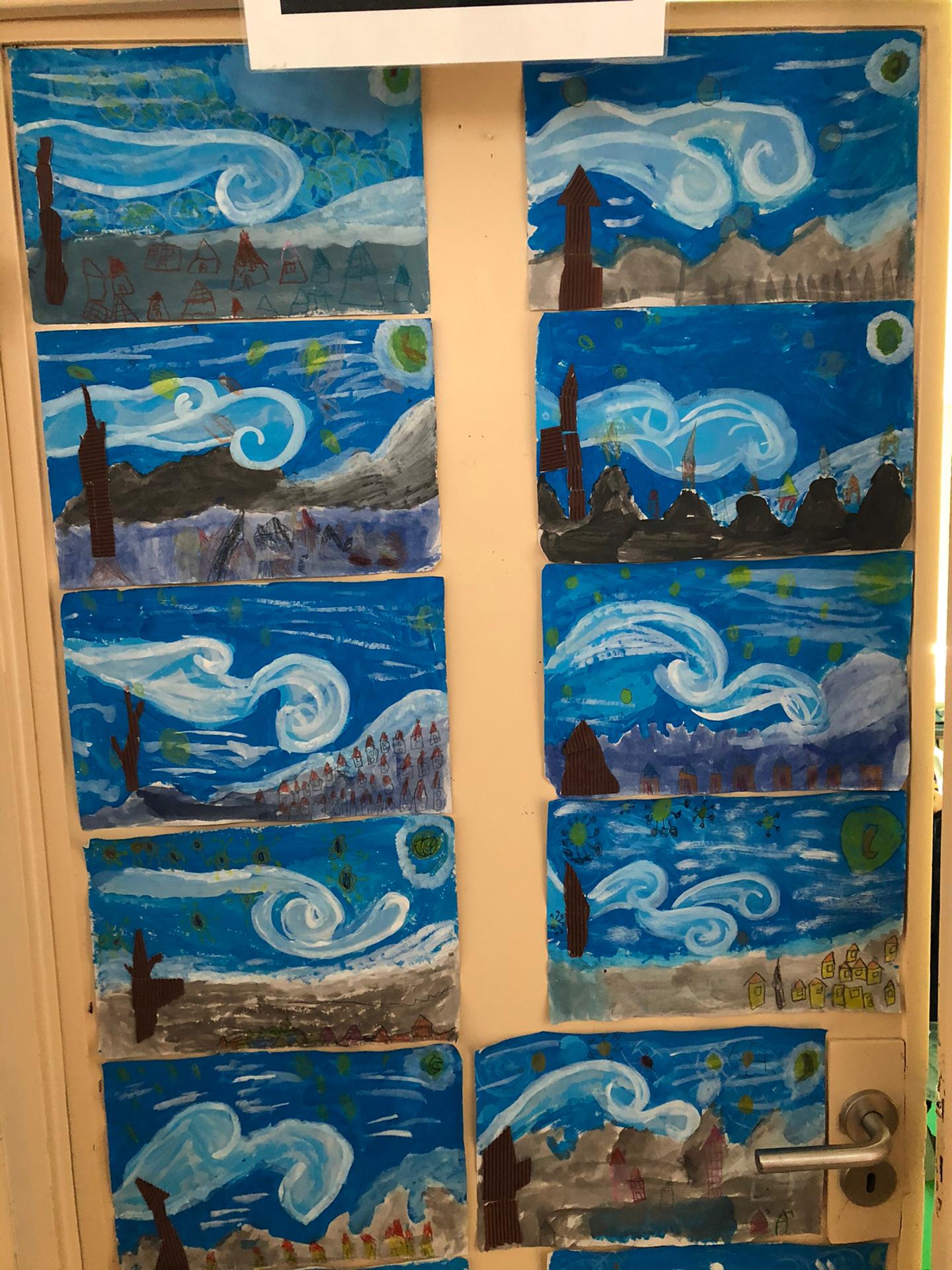 Pintámos um desenho, com lápis de cor, inspirado na obra “A noite estrelada” de Van Gogh. |