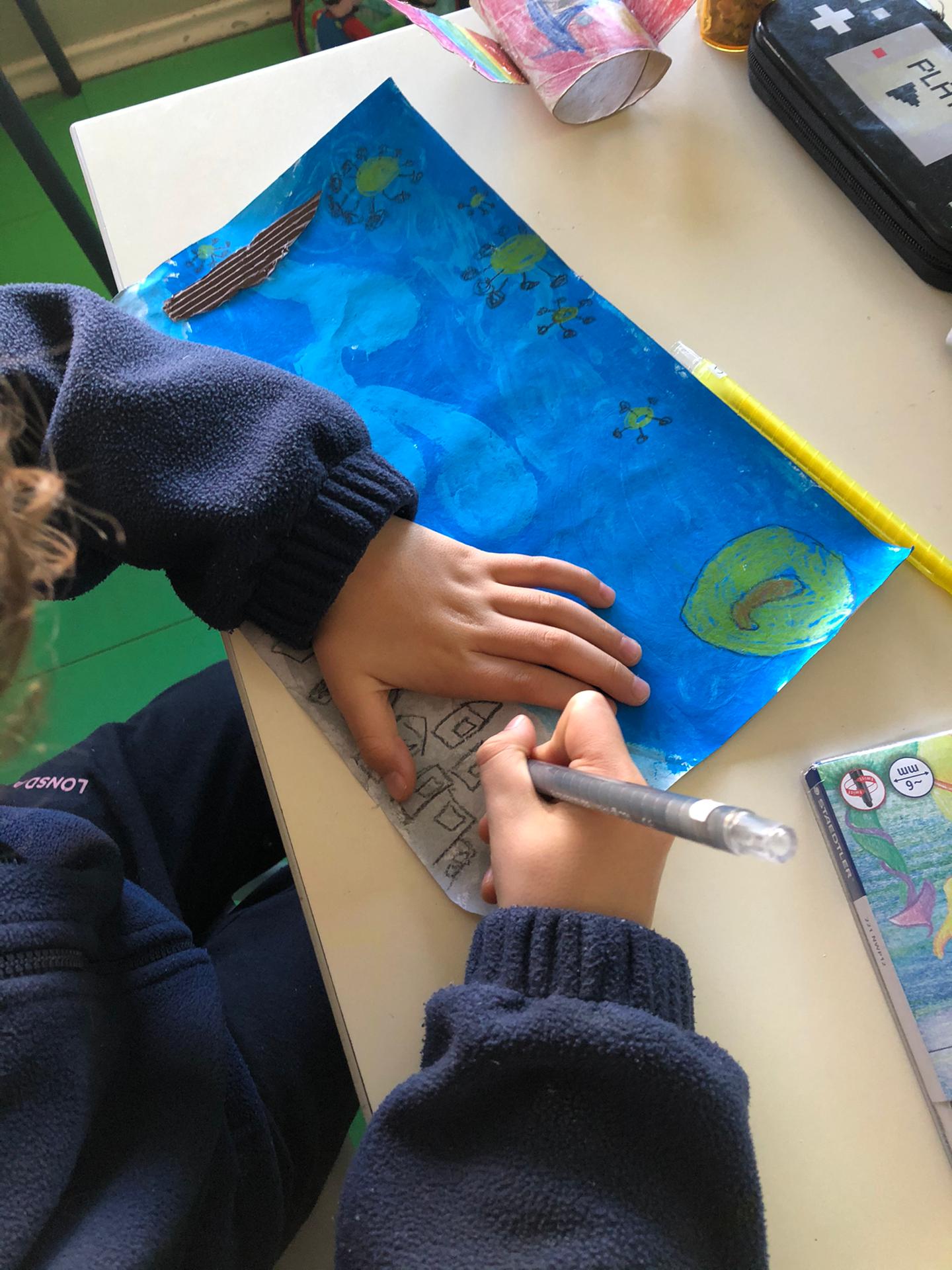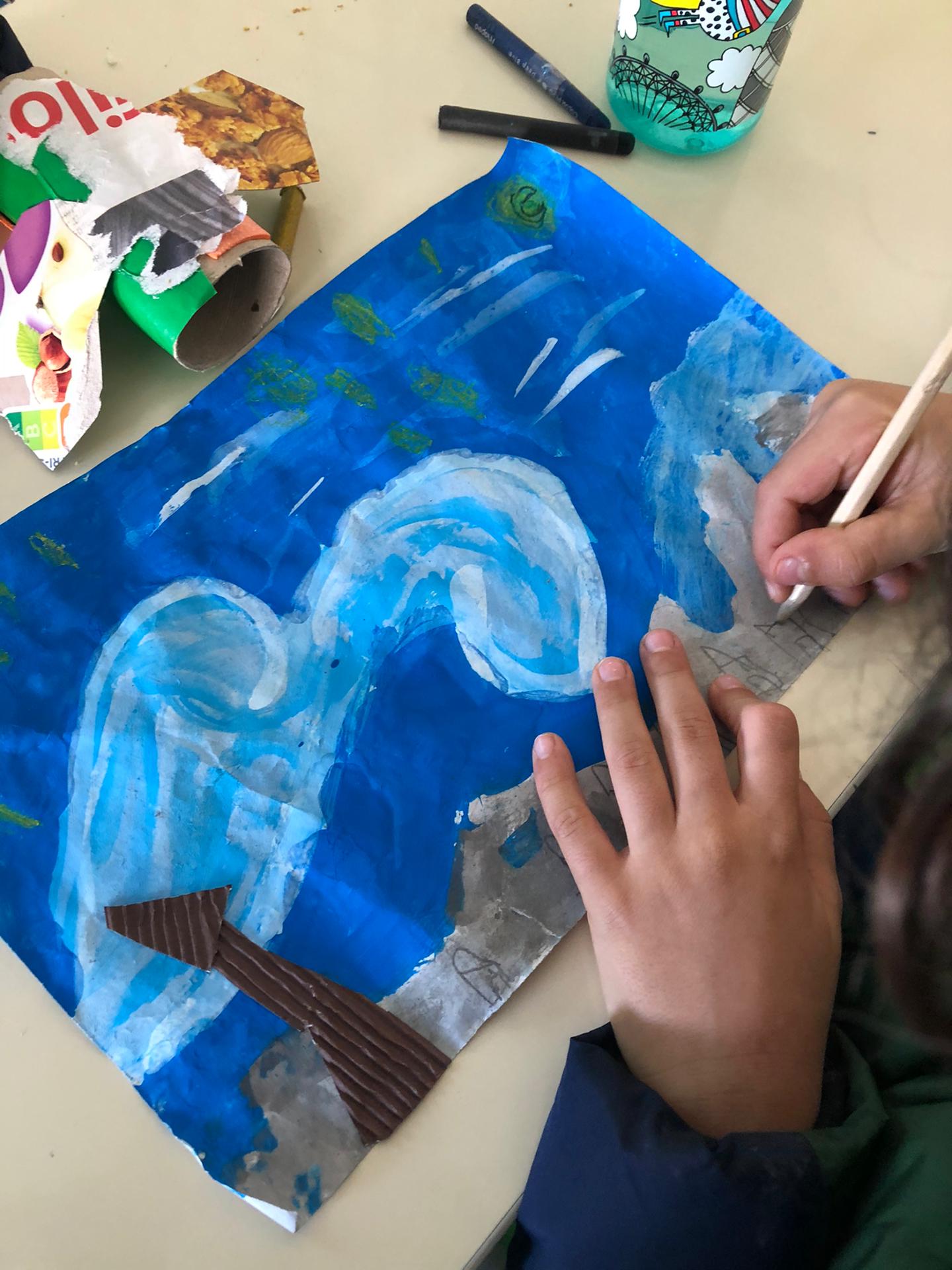 Colocámo-nos no papel do famoso artista Van Gogh e, numa folha de papel reciclado, fizemos a nossa interpretação da obra “A noite estrelada”, utilizando tintas, aguarelas, lápis de cera e cartão. |