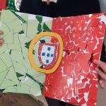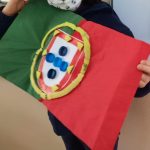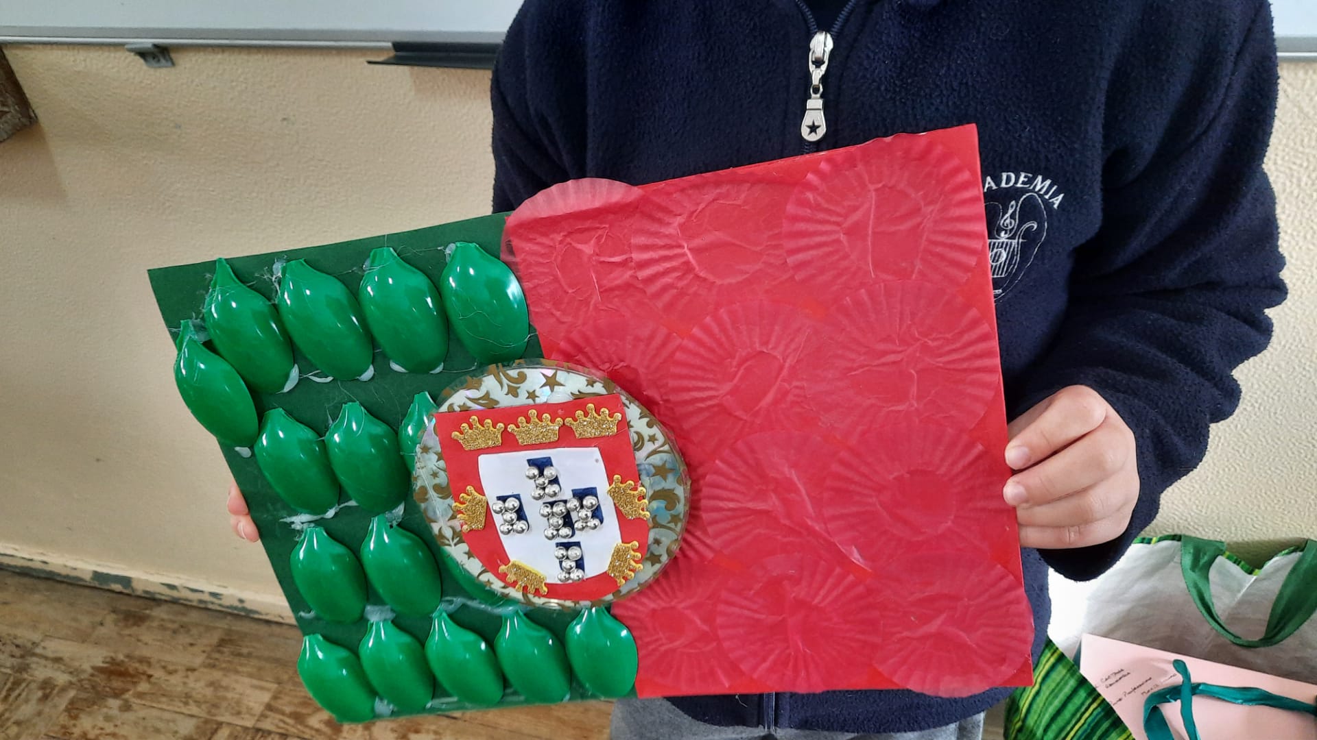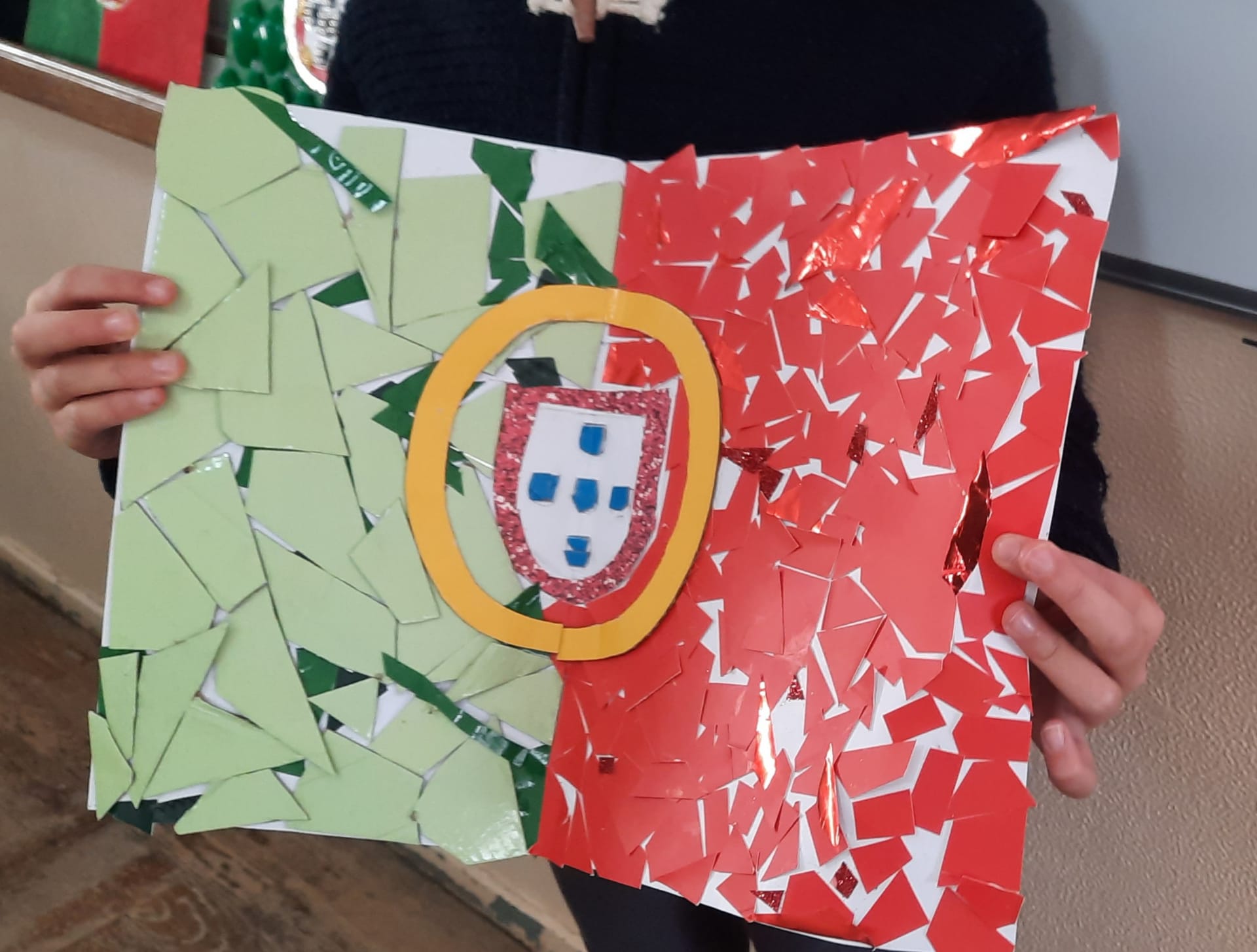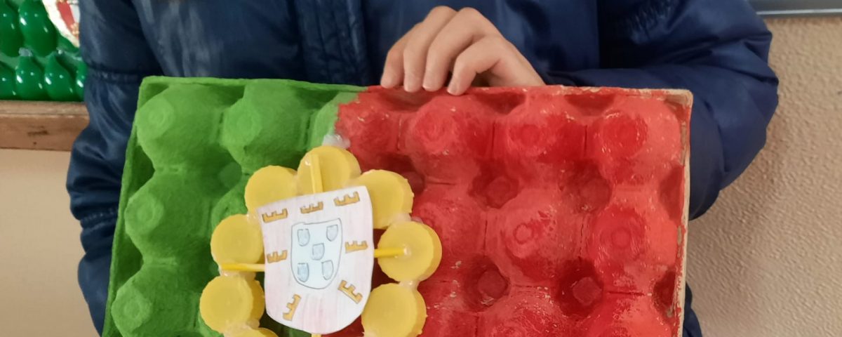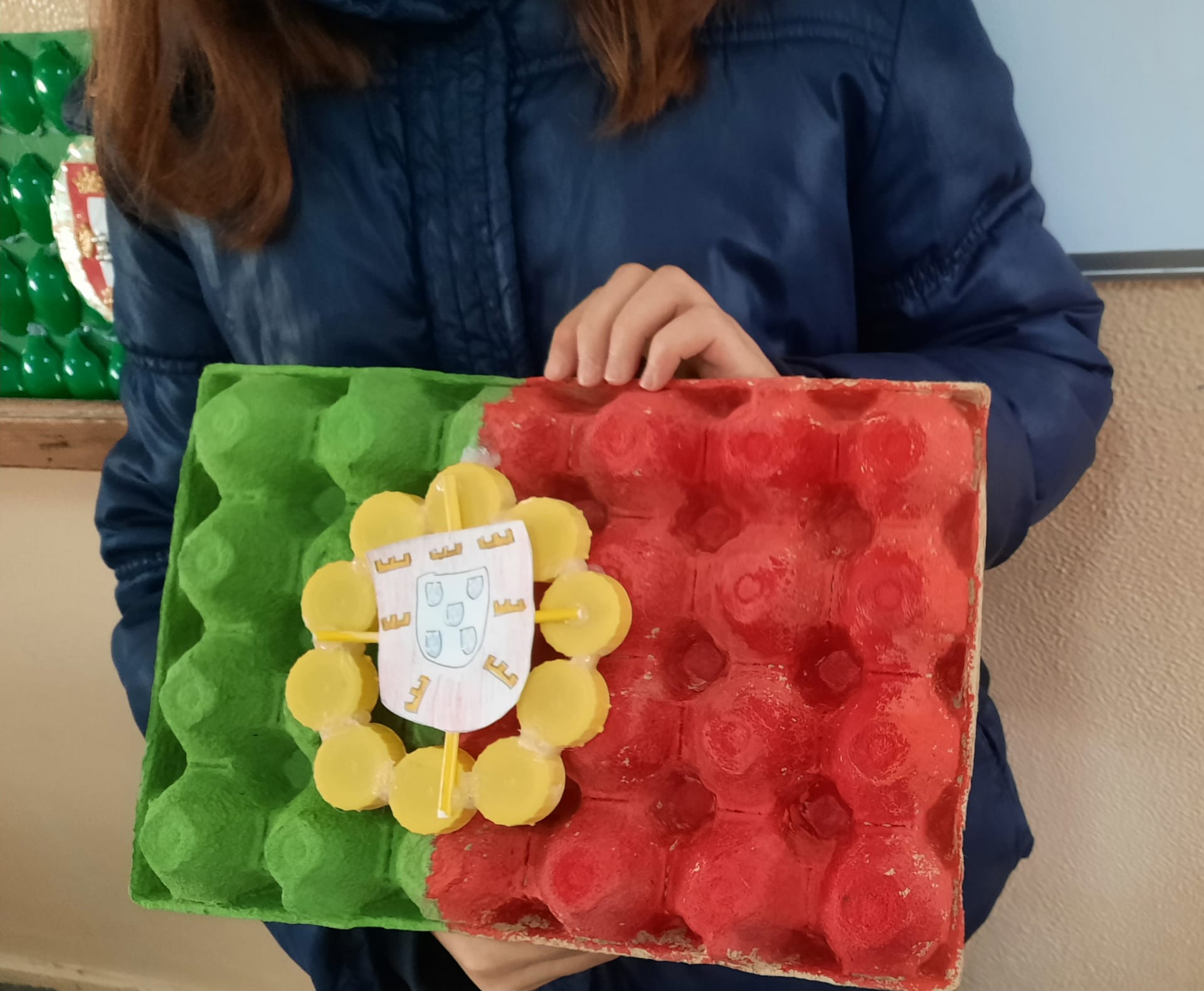 Em Artes Visuais construímos bandeiras de Portugal com materiais reciclados.