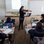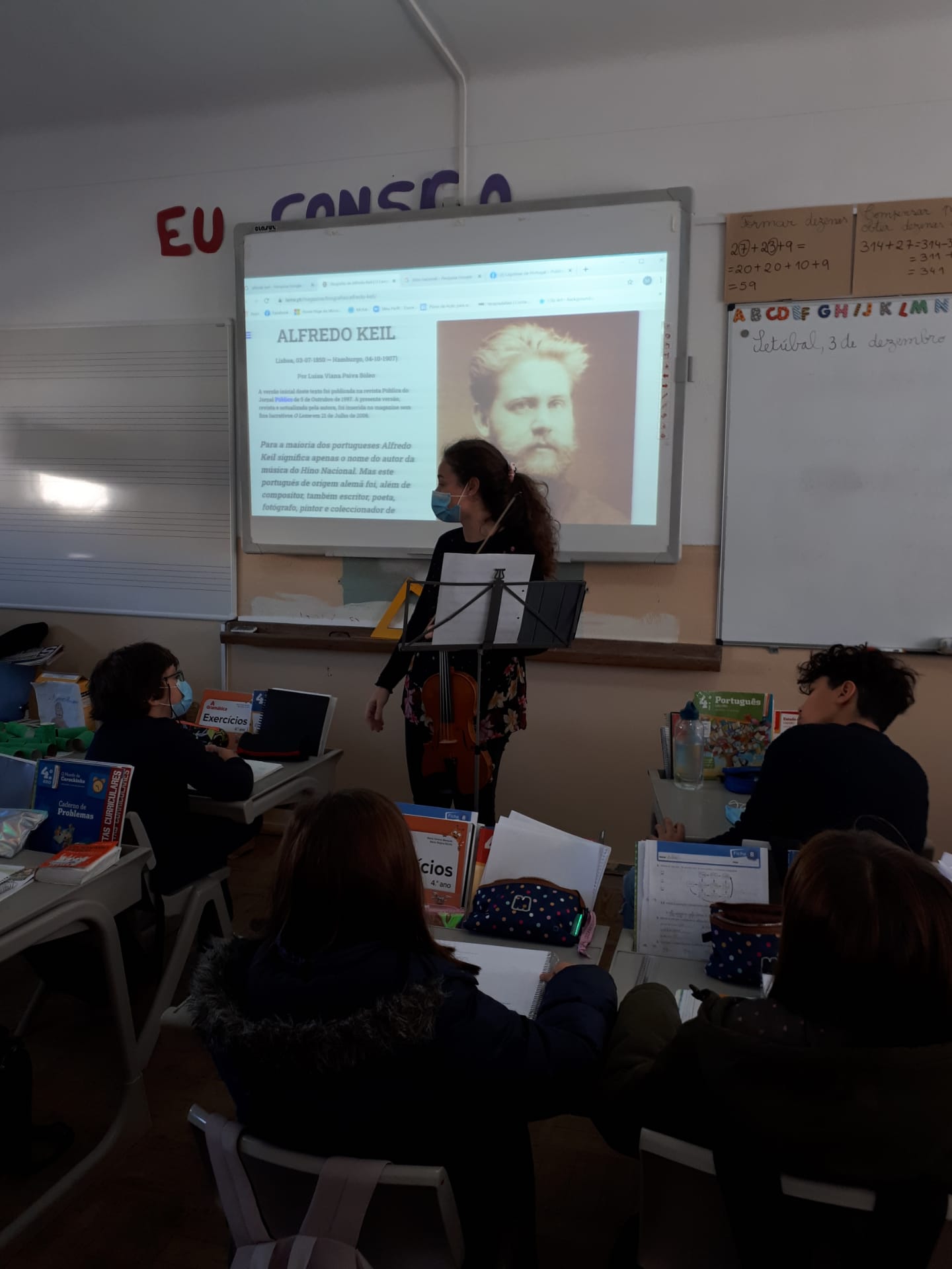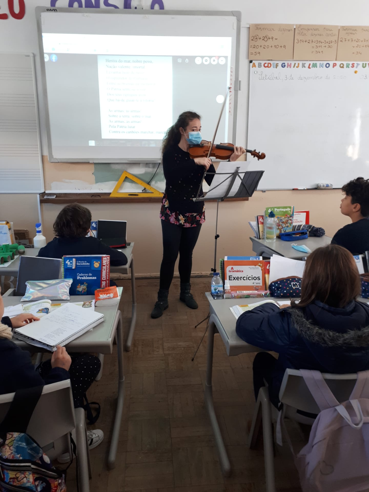No instrumento tivemos o privilégio de ouvir a professora Joana Gomes tocar o Hino Nacional no violino, depois de nos falar da letra e do compositor do Hino.