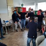 Na aula de expressão dramática/ teatro os alunos improvisaram a ida de uma família a um jogo de futebol da seleção nacional, onde tinham de recorrer às bandeiras construídas em família.