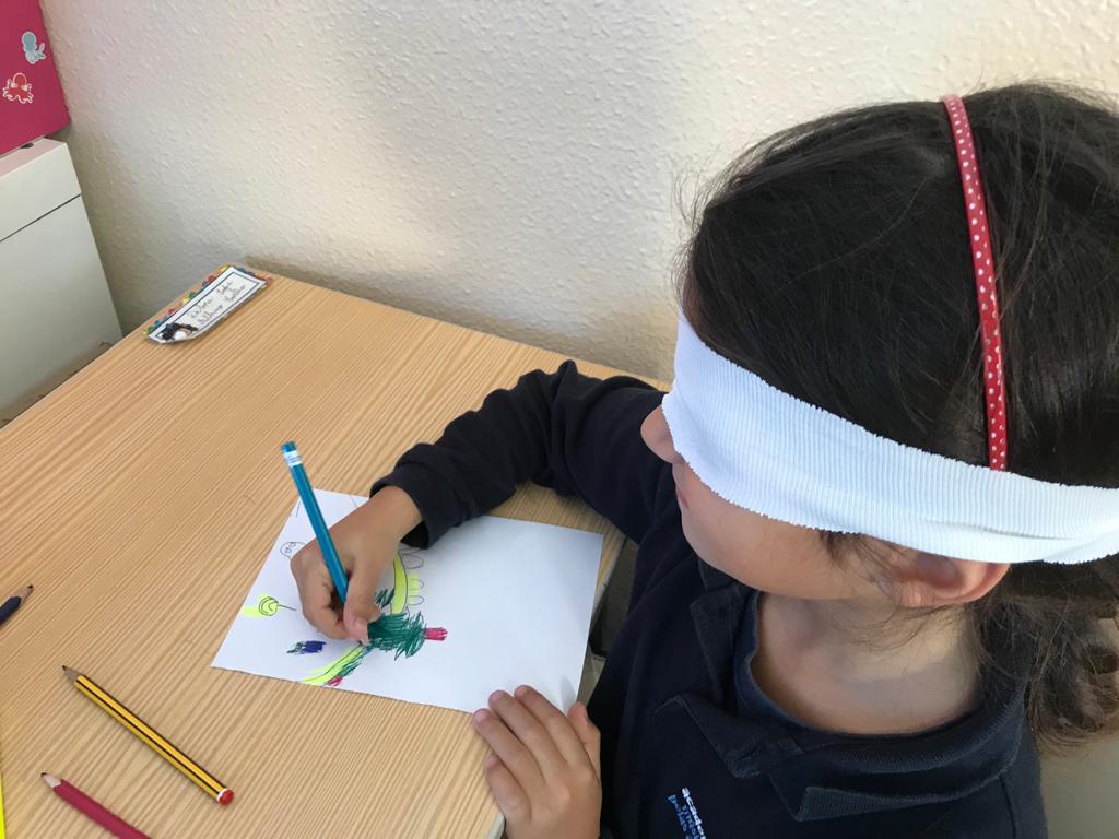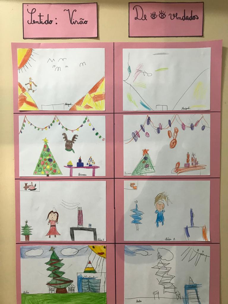 Os alunos do 2º ano descobriram  algumas adivinhas e curiosidades  relacionadas com o tema dos “ cinco sentidos”. Dividiram uma folha A4 ao meio e, numa das partes, fizeram um desenho de acordo com o tema, e pintaram-no. Na outra parte da folha, de olhos vendados, reproduziram o mesmo desenho. Por fim compararam e discutiram o resultado.