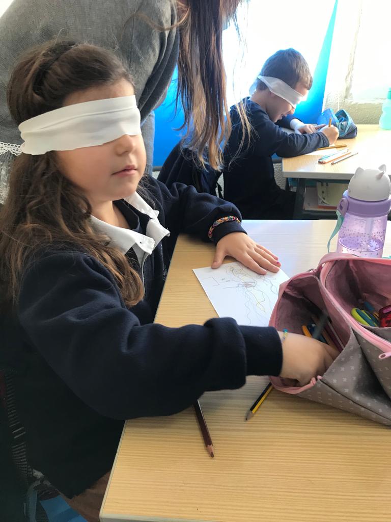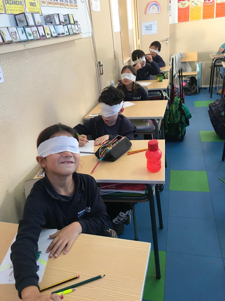 Na Educação Física, realizaram  atividades físicas privando um dos sentidos, trabalhando assim a consciencialização do desporto adaptado.