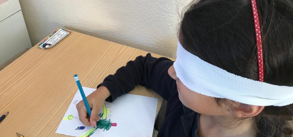 Os alunos do 2º ano descobriram algumas adivinhas e curiosidades relacionadas com o tema dos “ cinco sentidos”. Dividiram uma folha A4 ao meio e, numa das partes, fizeram um desenho de acordo com o tema, e pintaram-no. Na outra parte da folha, de olhos vendados, reproduziram o mesmo desenho. Por fim compararam e discutiram o resultado.