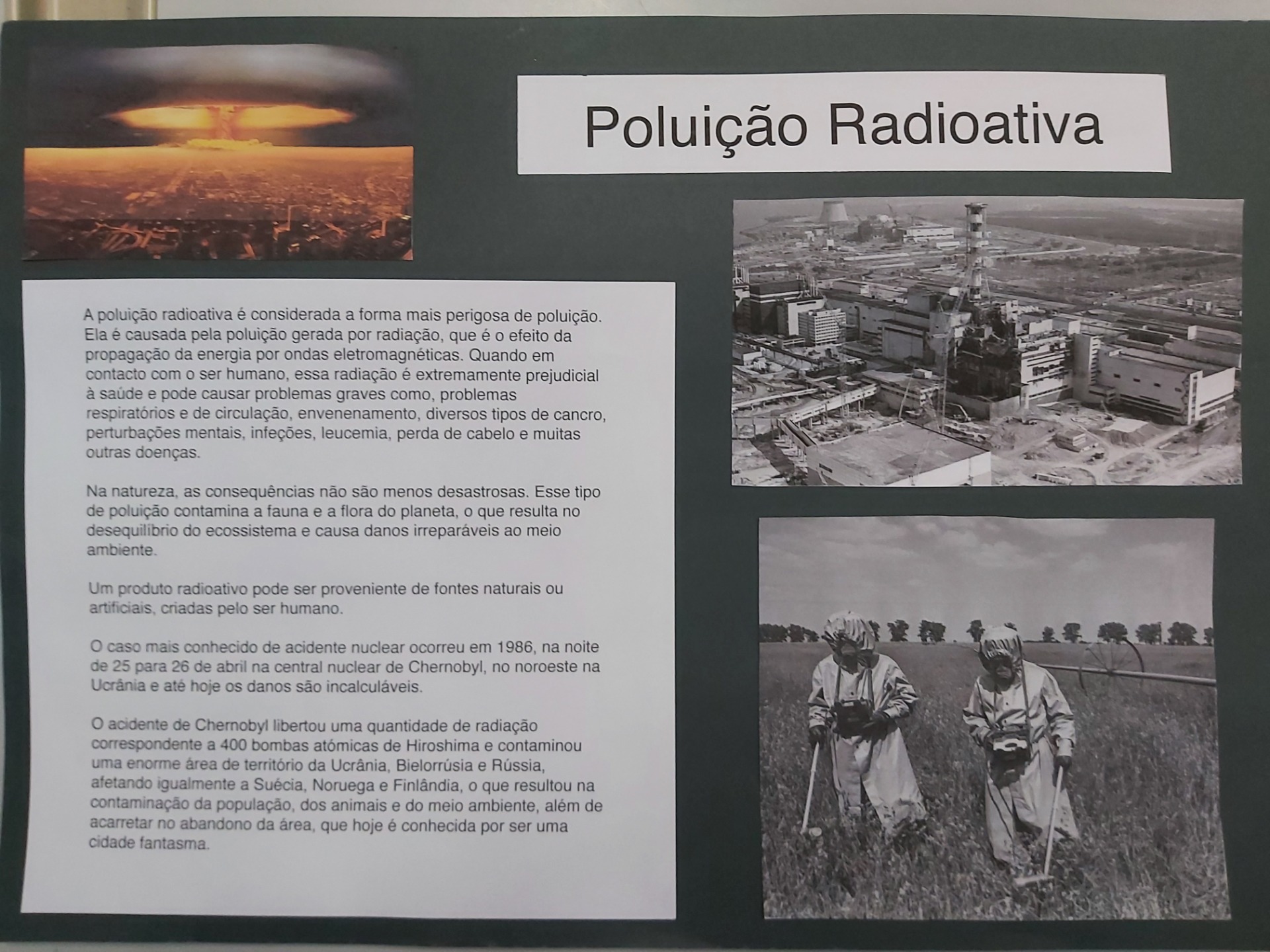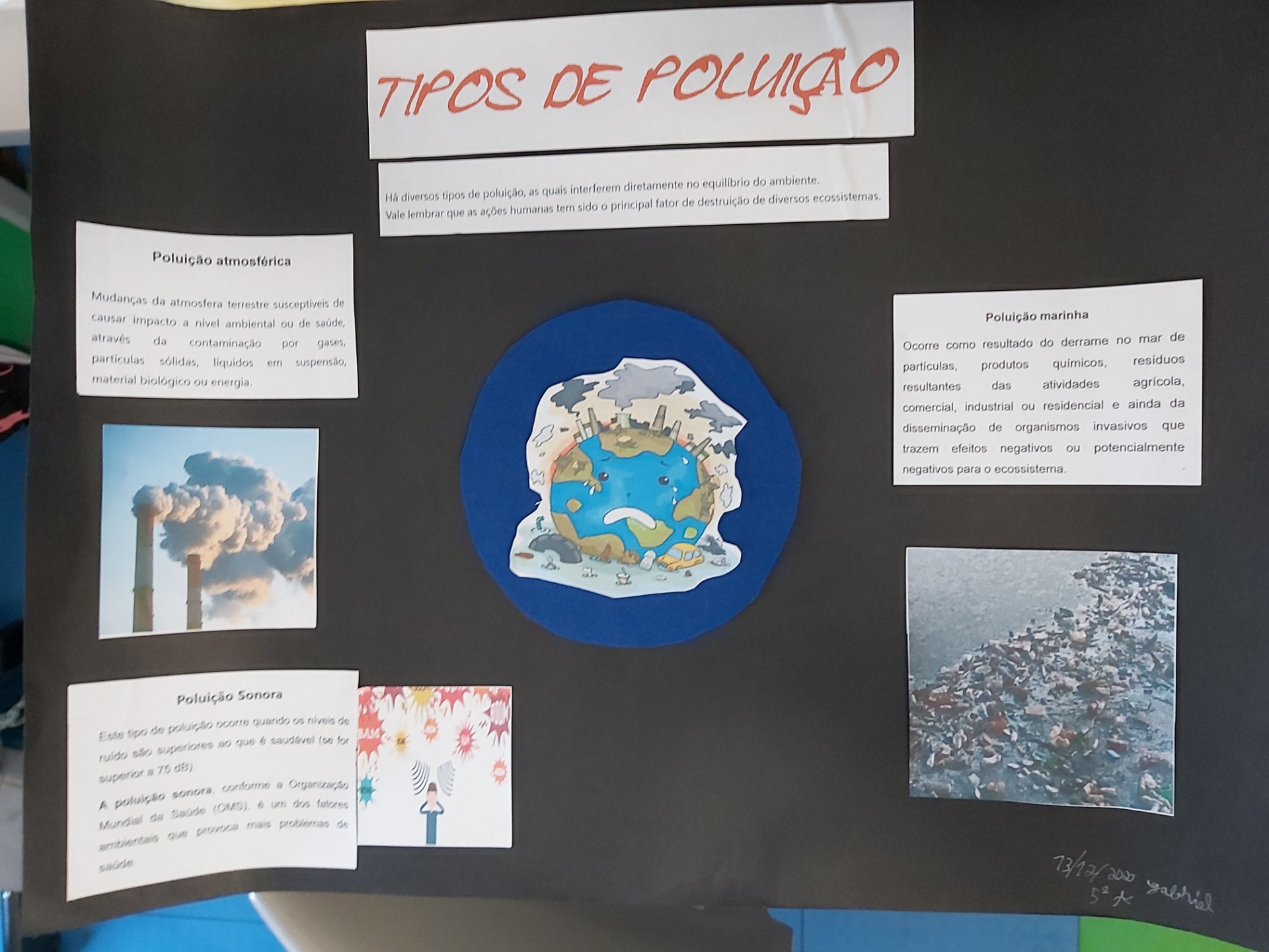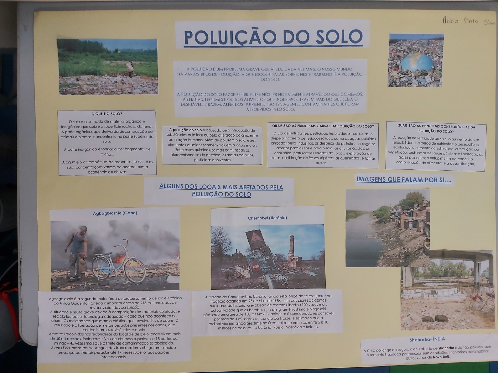 Ciências- Realização de pesquisas sobre vários tipos de poluição e sobre as zonas do mundo mais poluídas, quais as causas e consequências dessa poluição para o ambiente e para a saúde. Realização de cartazes com a informação recolhida.