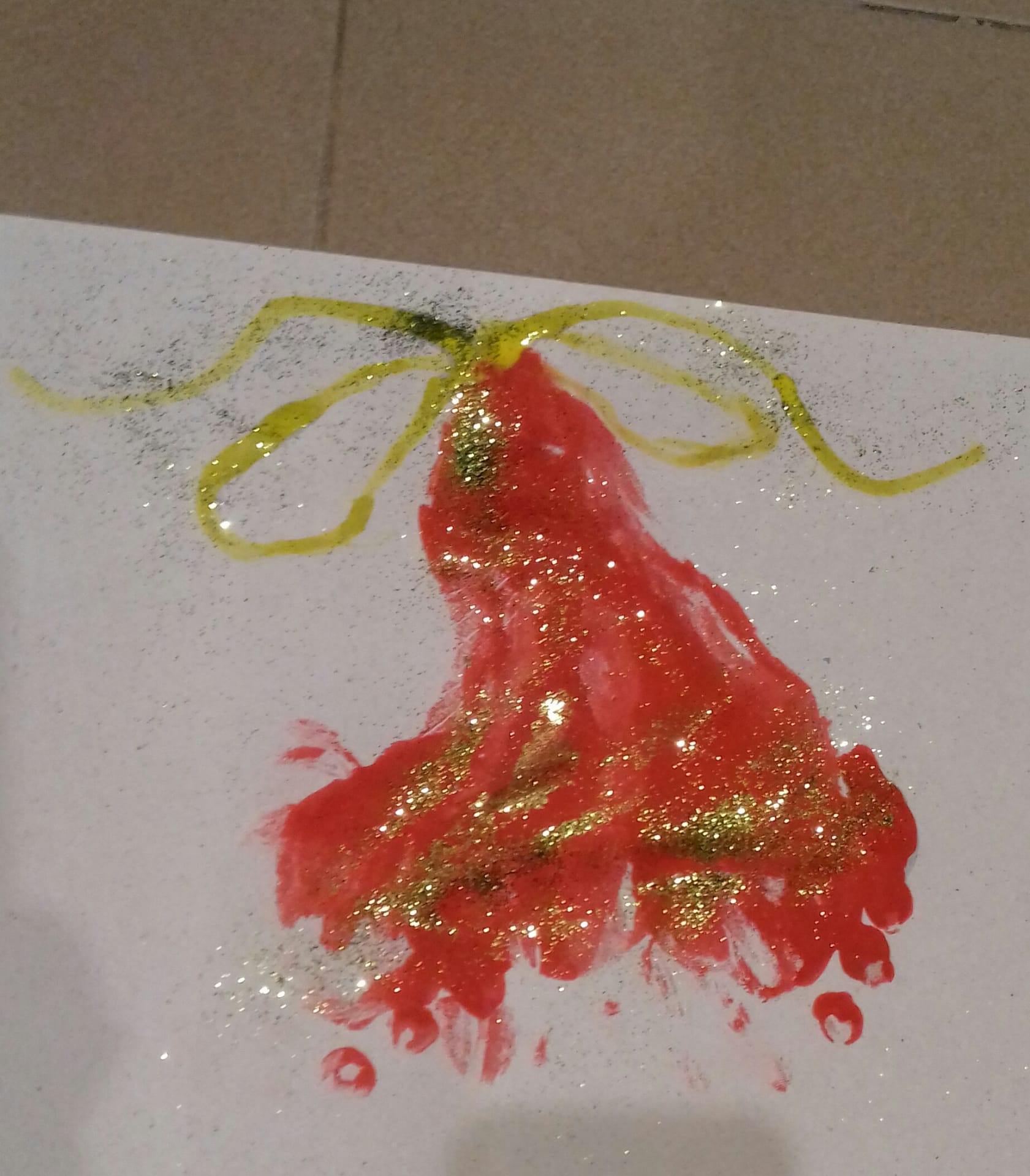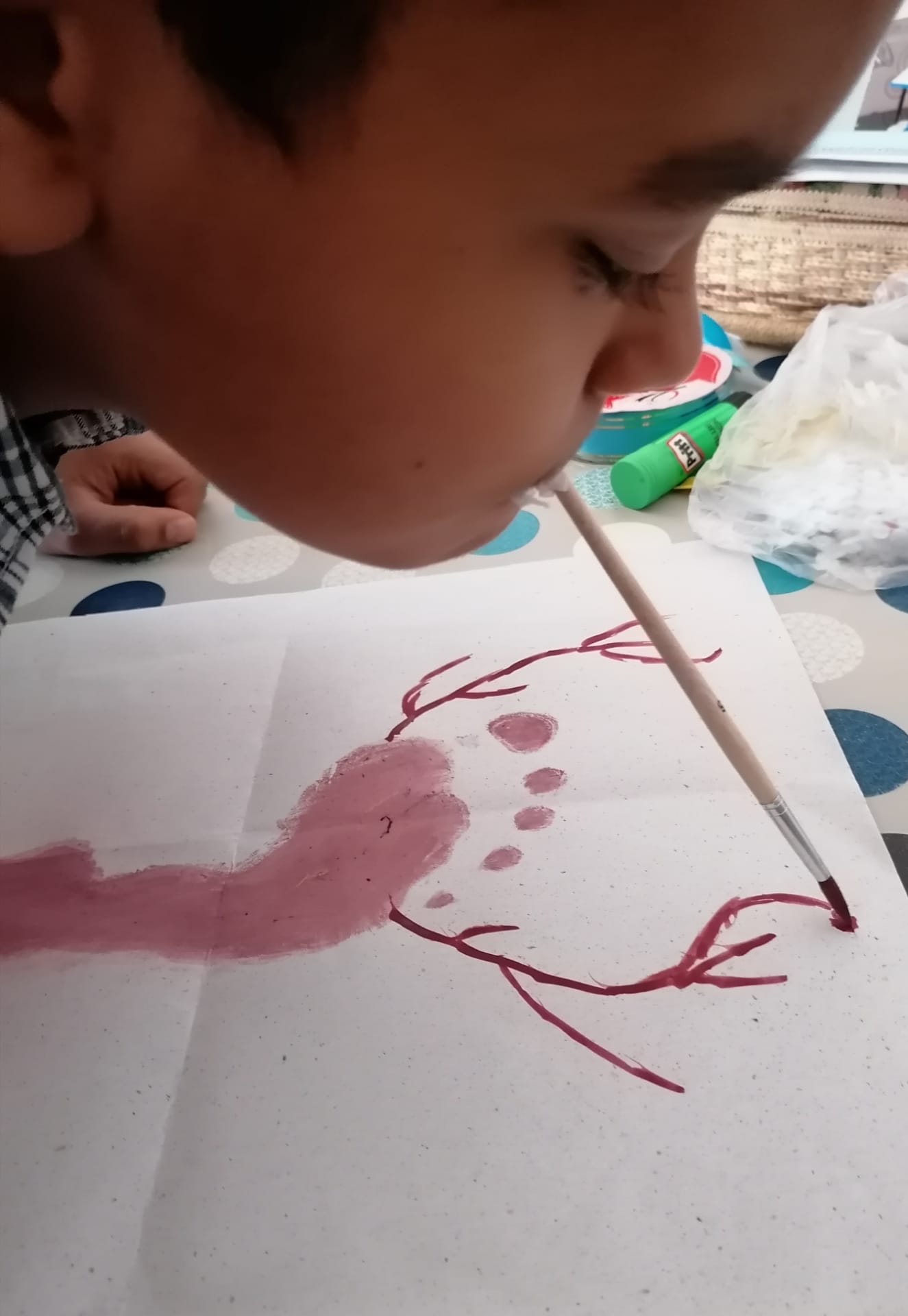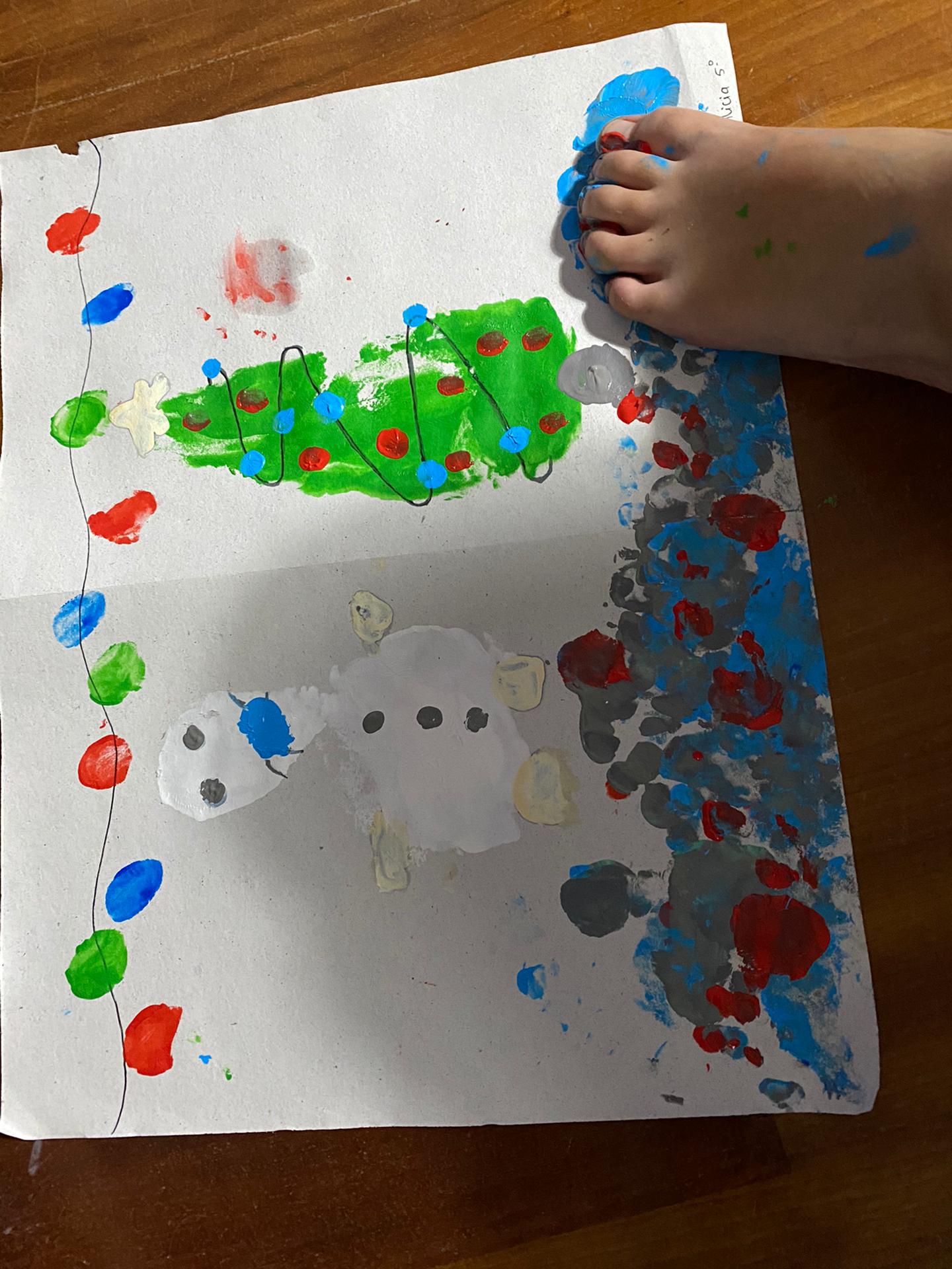 Educação Visual – Realização de pinturas com a boca, os pés e as mãos de forma a representar uma composição natalícia. Elaboração de uma embalagem para a Prenda de Natal, que foi decorada com a técnica de pintura/estampagem/impressão das mãos, juntando uma mensagem alusiva ao tema Paz e Natal.