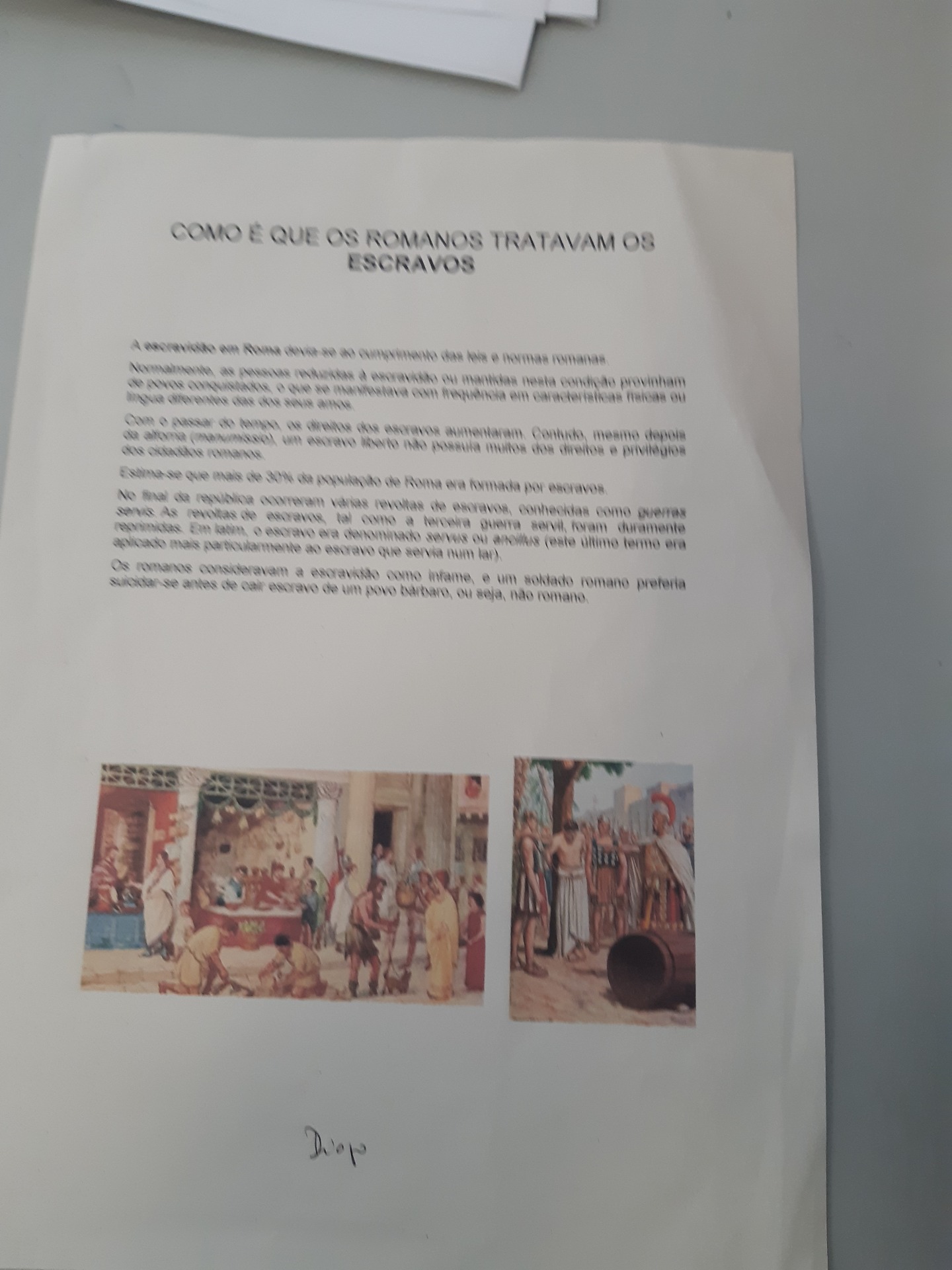 HGP– “Os Romanos na Península Ibérica”, um enfoque especial na sociedade romana, nomeadamente a escravatura. Realização de uma pesquisa sobre o tema “Como eram tratados os escravos pelos romanos”. Com as informações adquiridas, foi feito um painel na sala de aula sobre o tema.